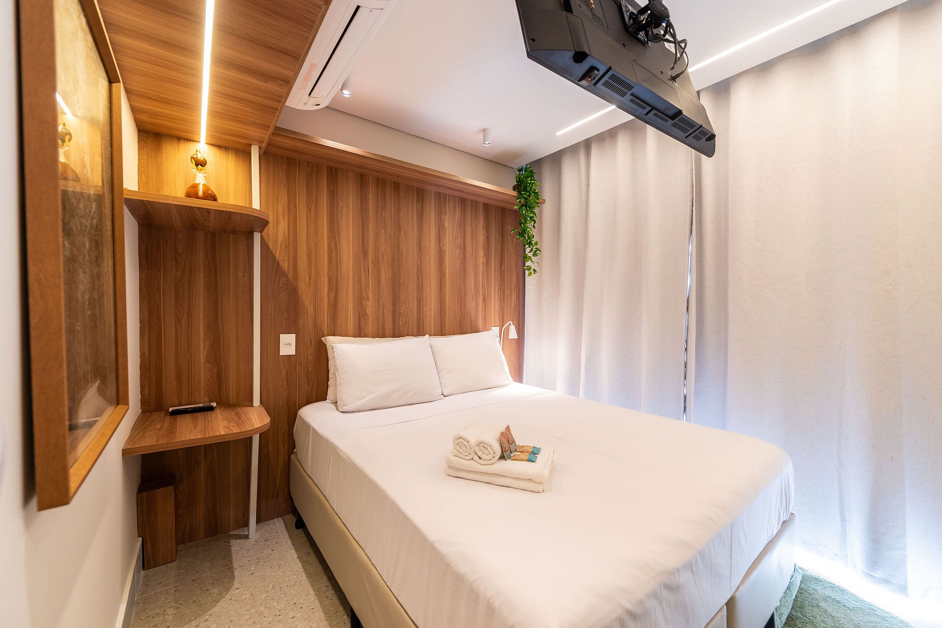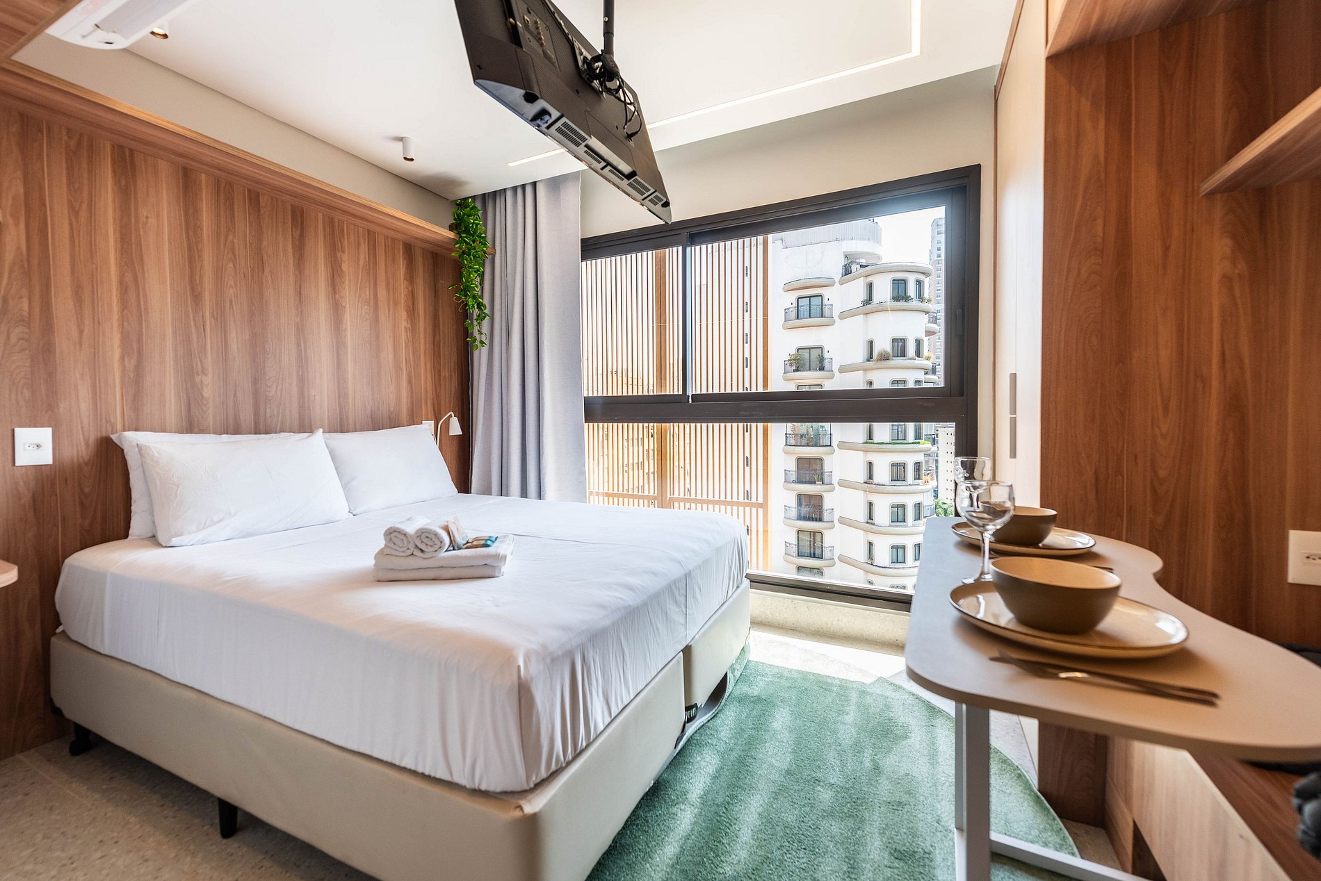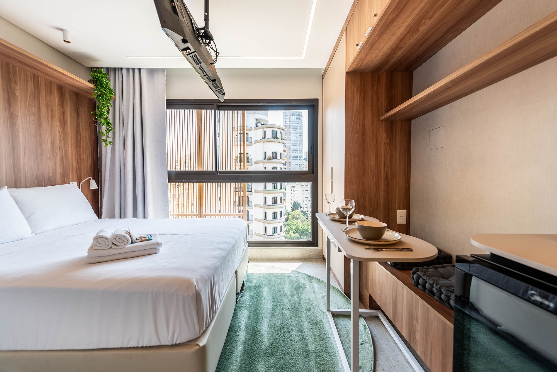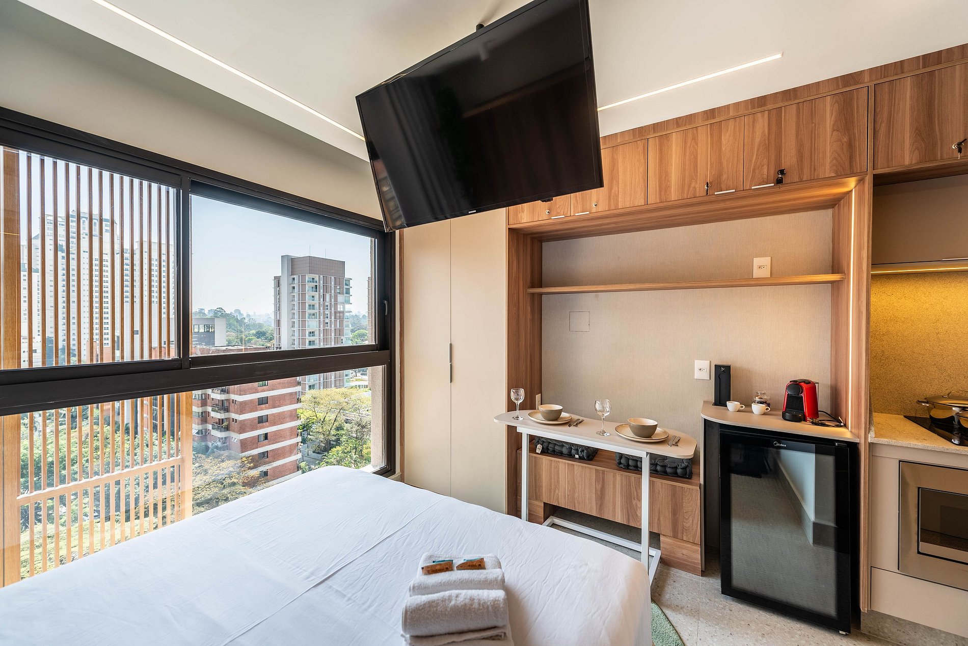 Sinta-se em casa neste studio de altíssimo padrão, totalmente reformado e projetado para oferecer conforto e praticidade. Desfrute da cama queen-size com enxoval premium, grandes janelas com vista livre para a cidade, smart TV, ar-condicionado e mesa para refeições ou home office.