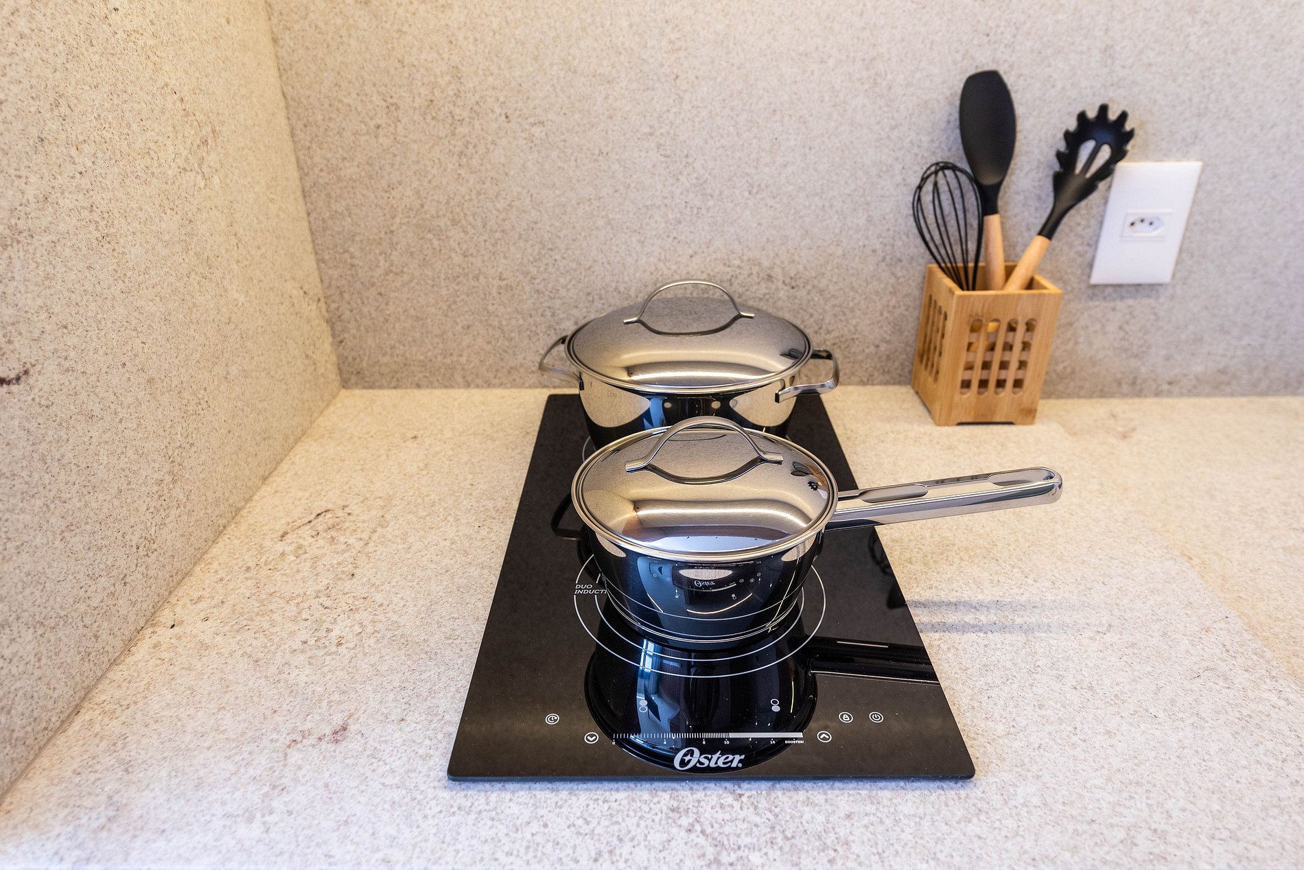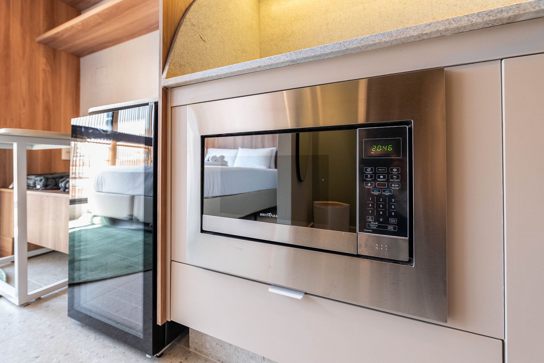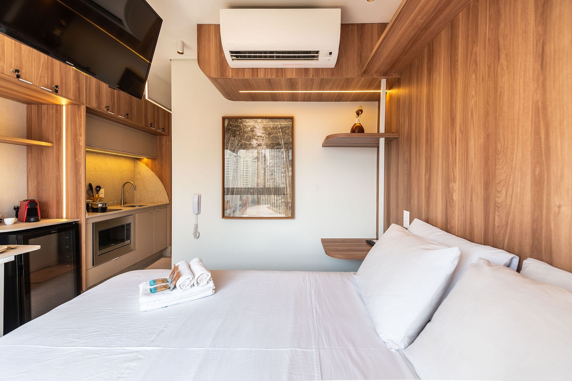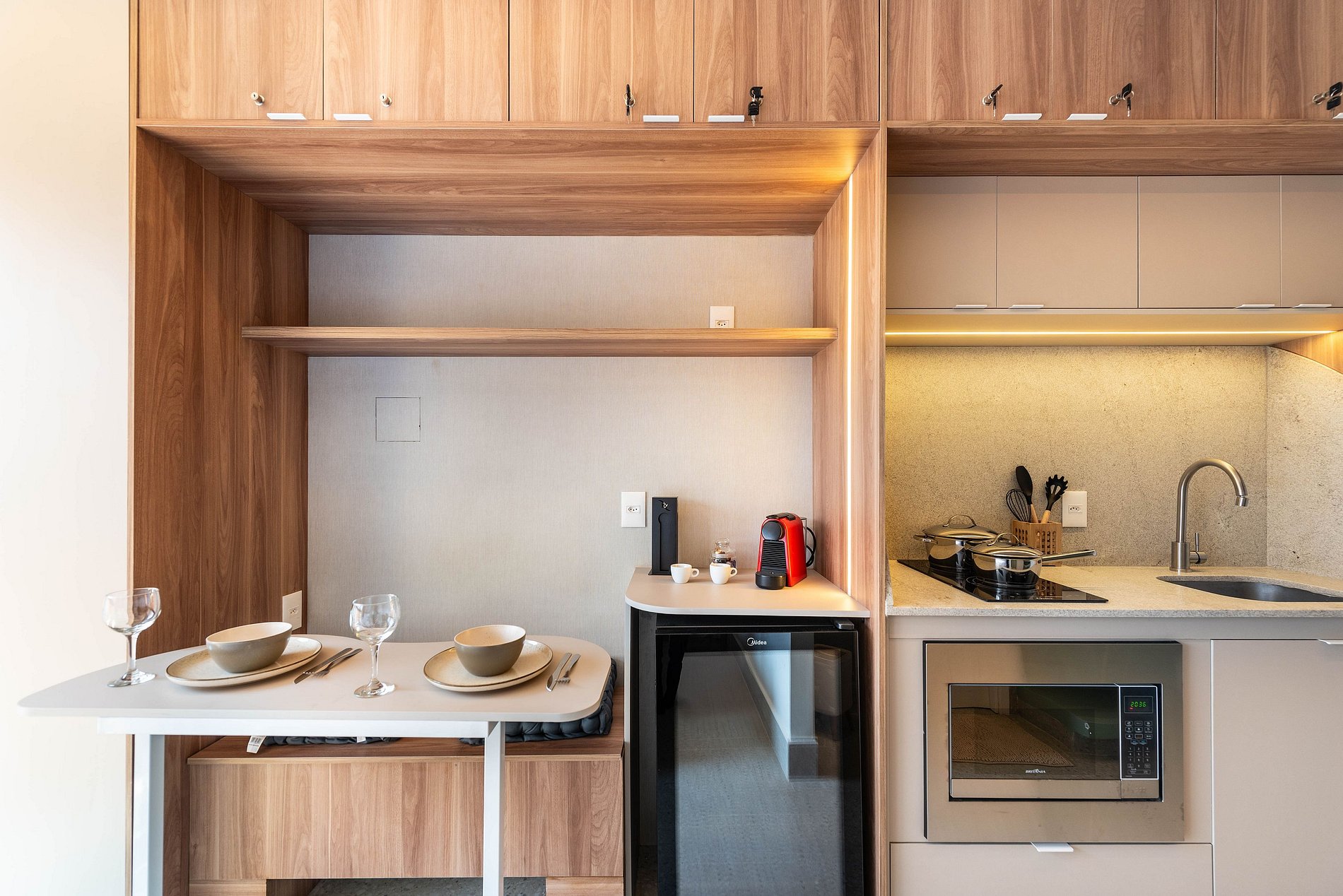 A cozinha é completa, equipada com cooktop de indução, micro-ondas, frigobar, cafeteira Nespresso e utensílios para preparar suas refeições. O banheiro conta com chuveiro a gás, toalheiro elétrico e secador de cabelo.
