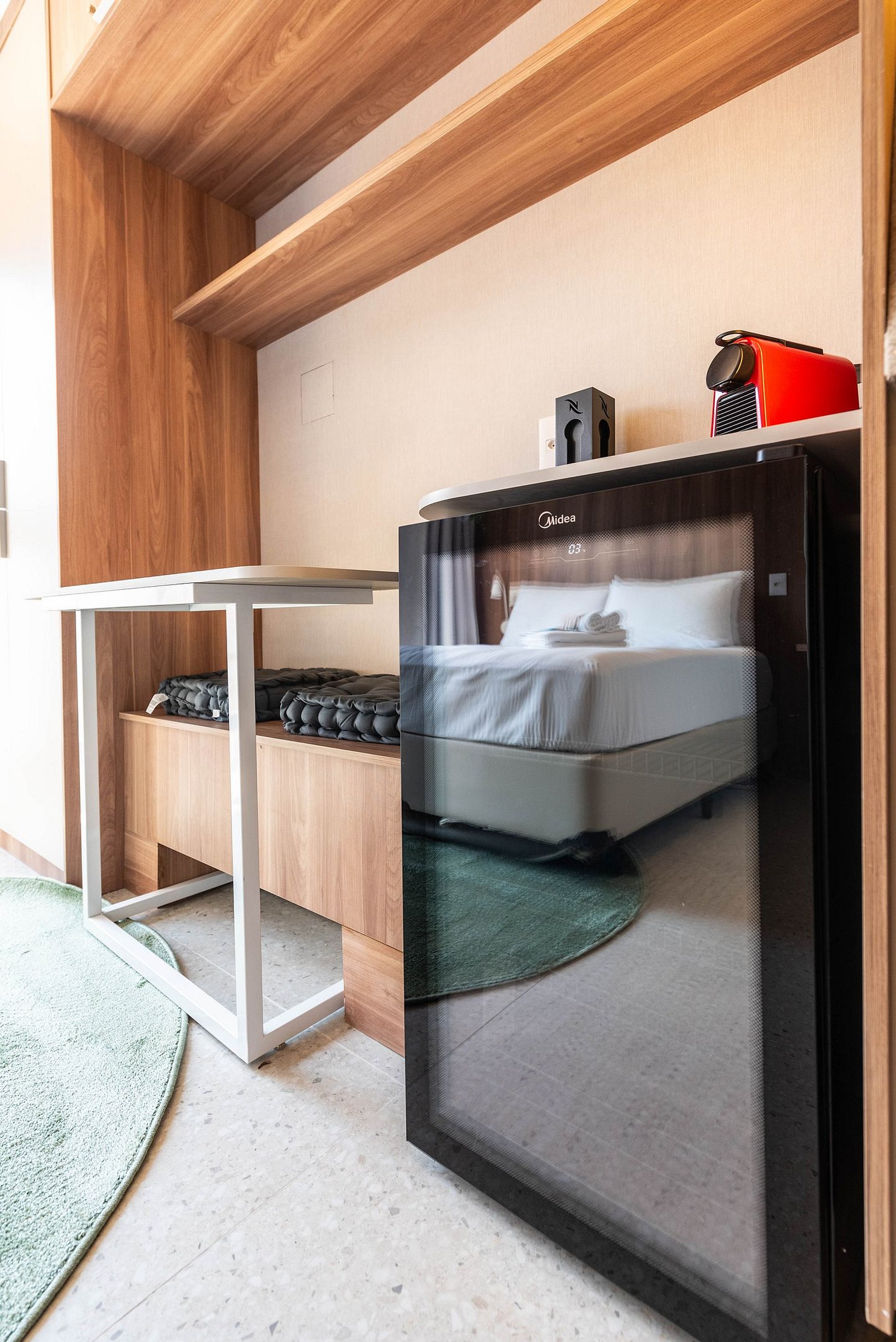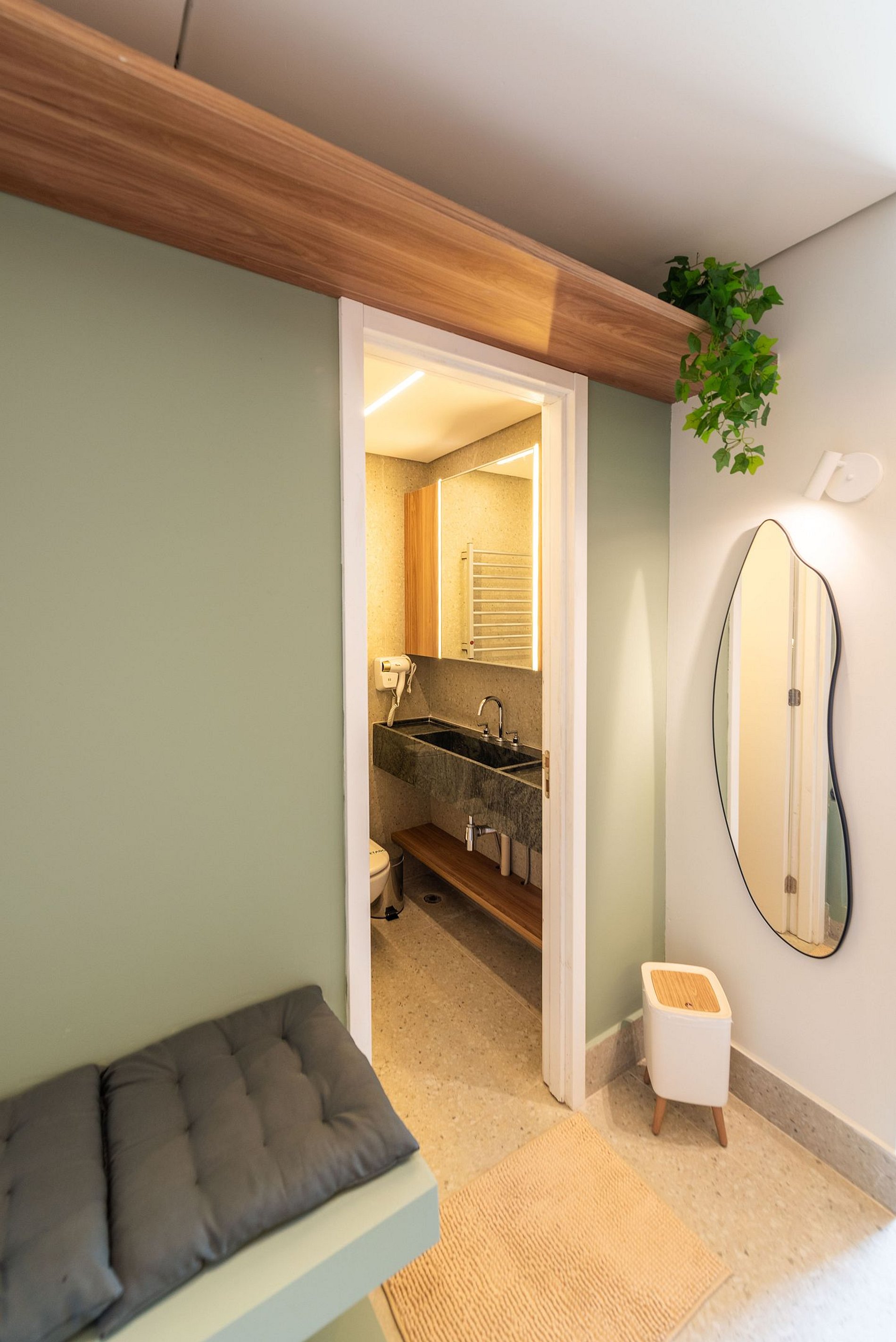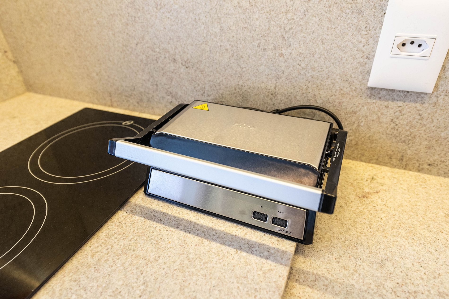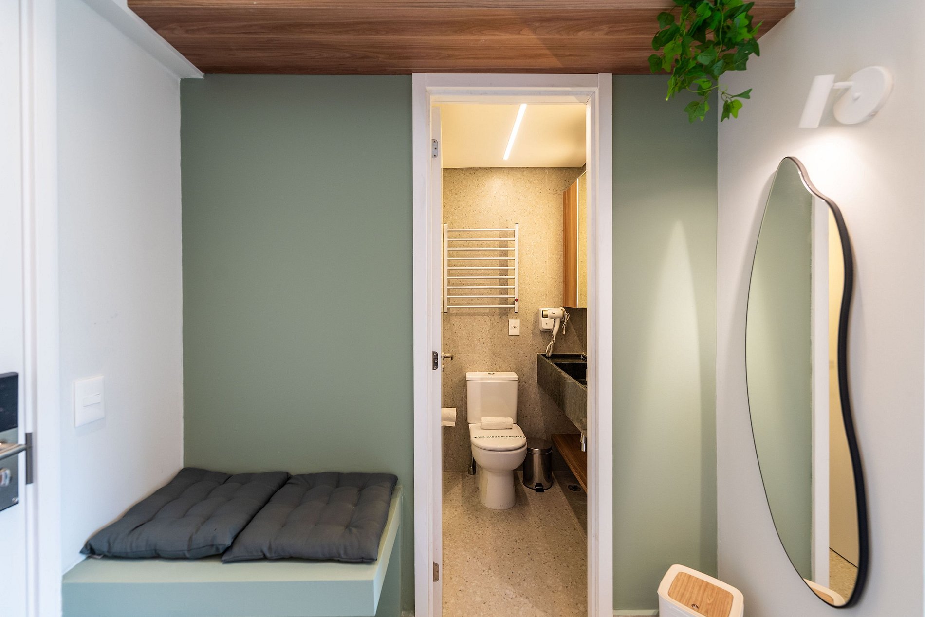 A cozinha é completa, equipada com cooktop de indução, micro-ondas, frigobar, cafeteira Nespresso e utensílios para preparar suas refeições. O banheiro conta com chuveiro a gás, toalheiro elétrico e secador de cabelo.
