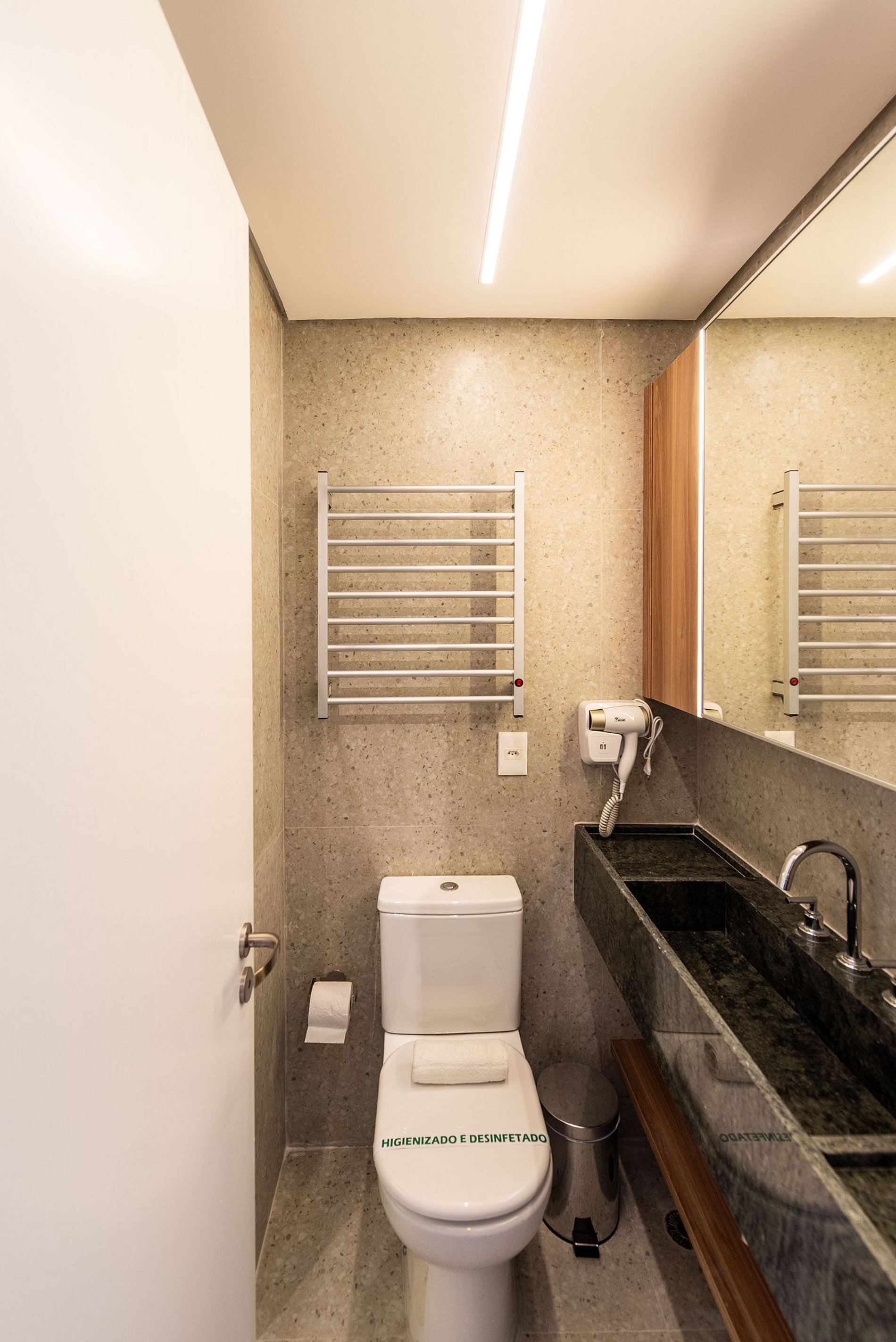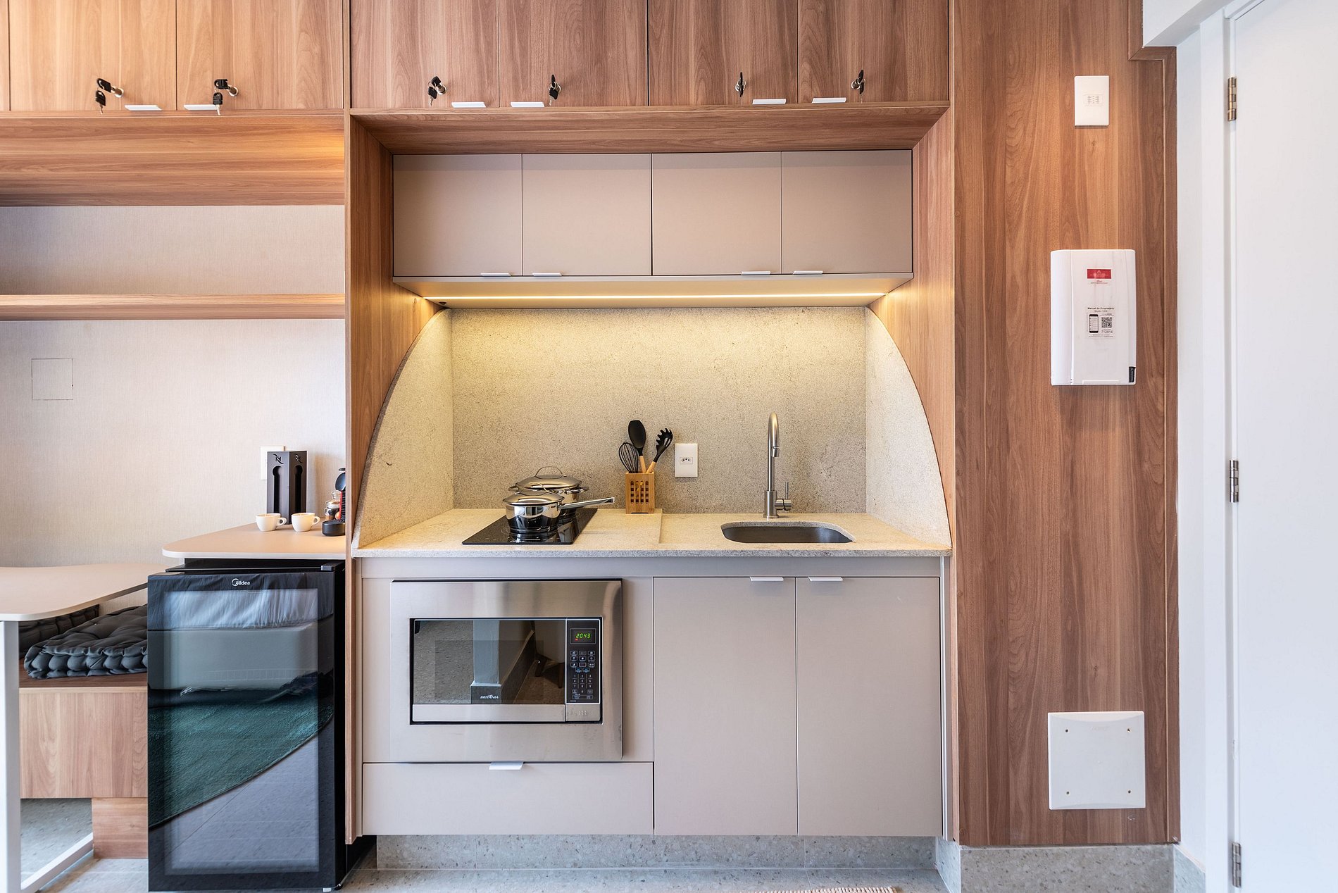 A cozinha é completa, equipada com cooktop de indução, micro-ondas, frigobar, cafeteira Nespresso e utensílios para preparar suas refeições. O banheiro conta com chuveiro a gás, toalheiro elétrico e secador de cabelo.