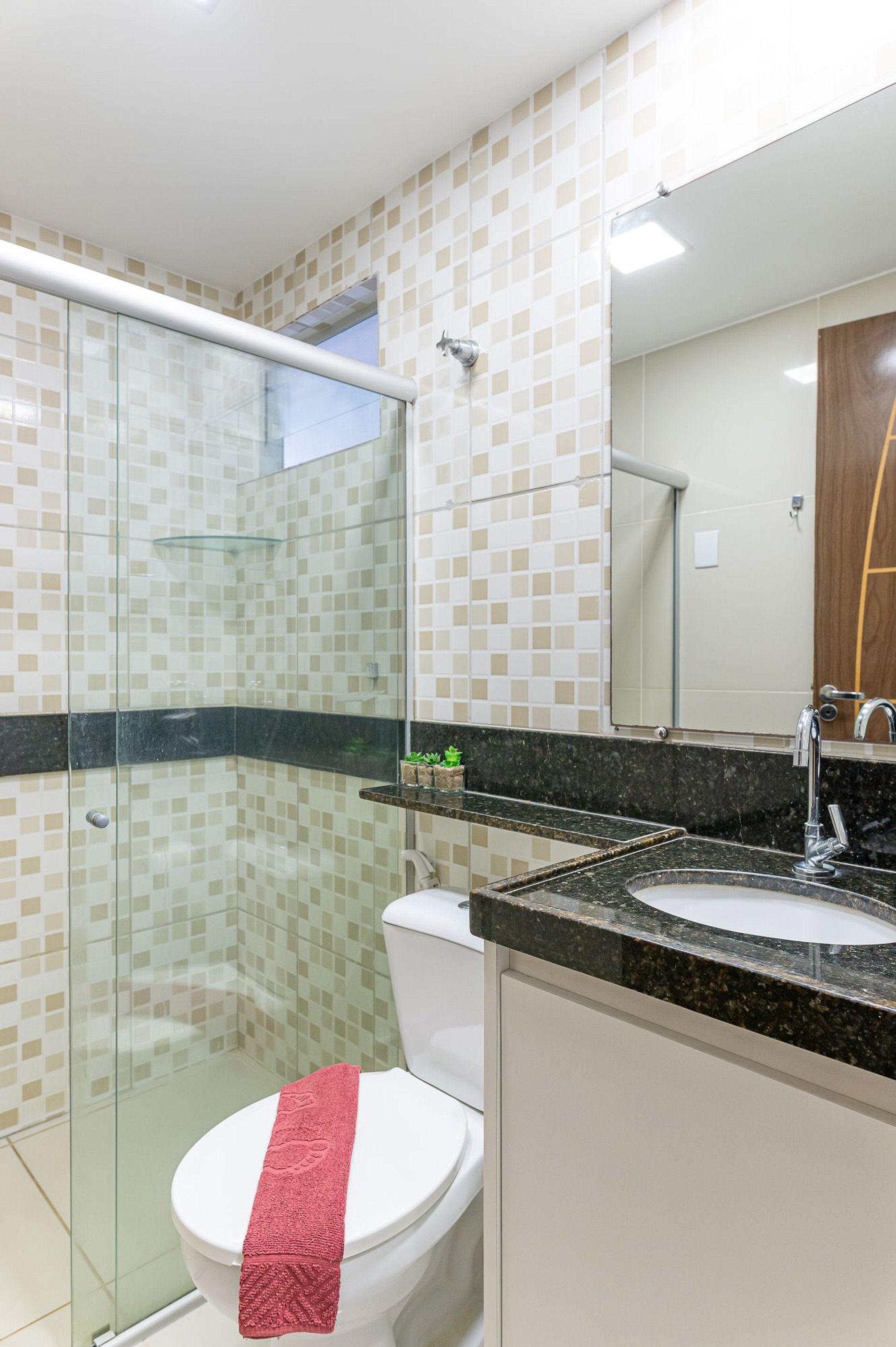 Banheiro: Moderno e limpo, com box de vidro e chuveiro elétrico para um banho relaxante após um dia de praia.