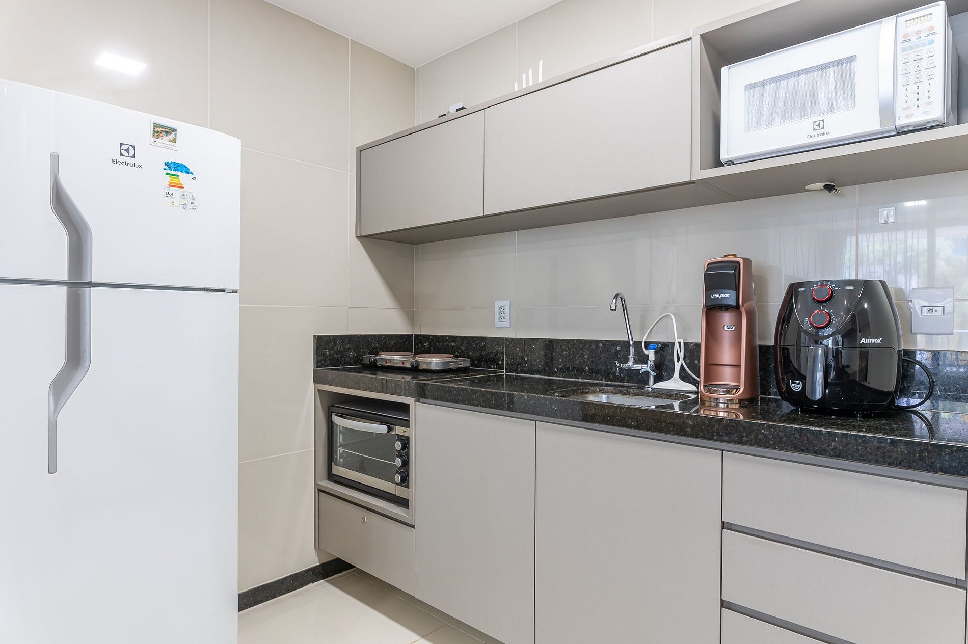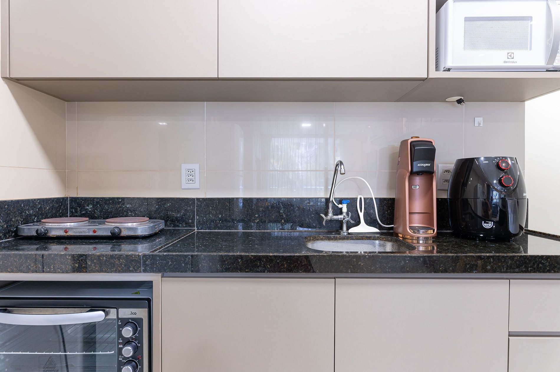 Cozinha Completa: Equipada com tudo que você precisa para preparar suas refeições: geladeira, cooktop de 2 bocas, micro-ondas, forno elétrico, airfryer e uma cafeteira para aquele café especial.