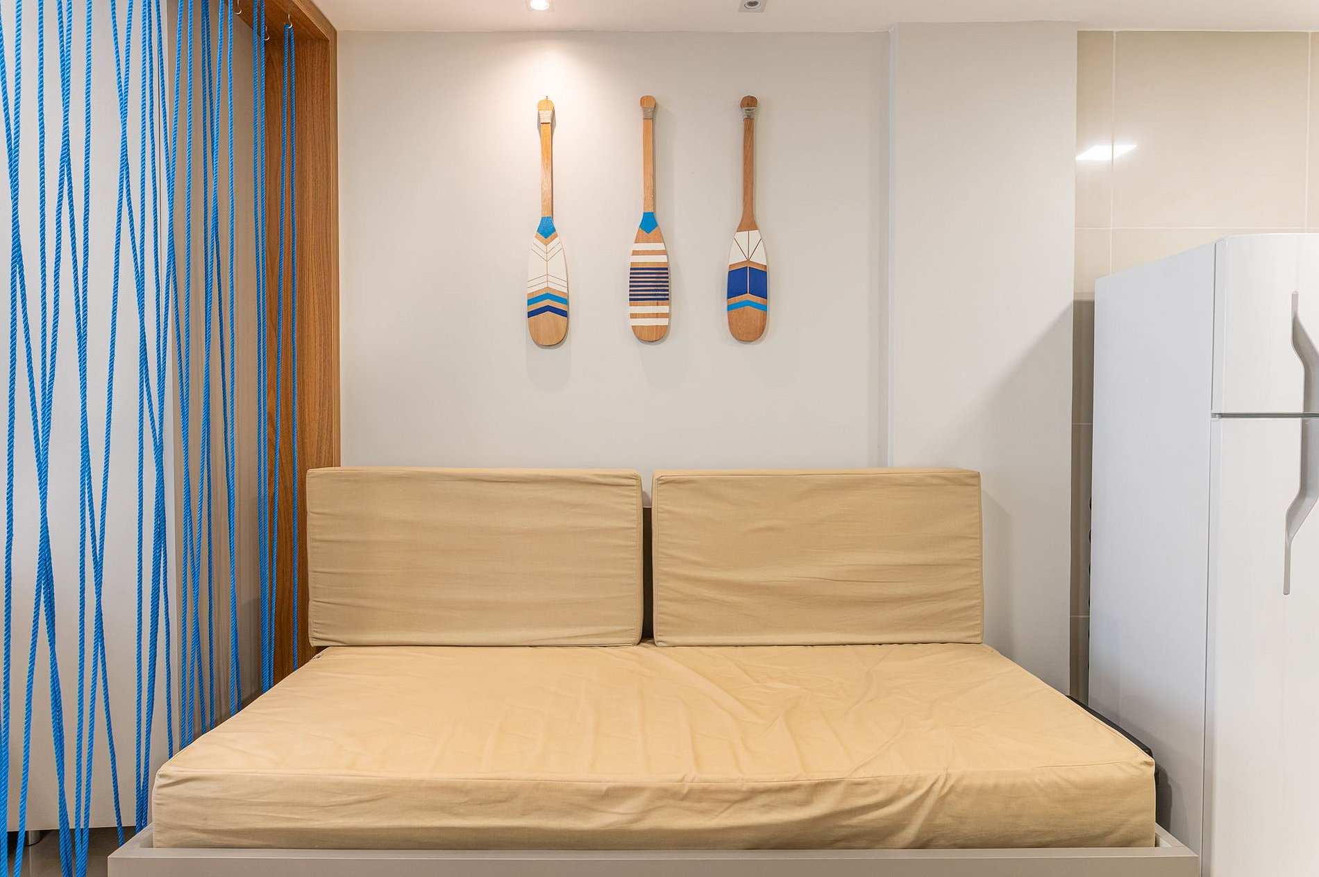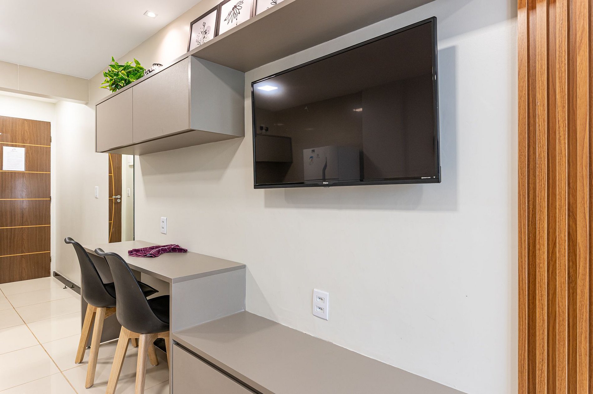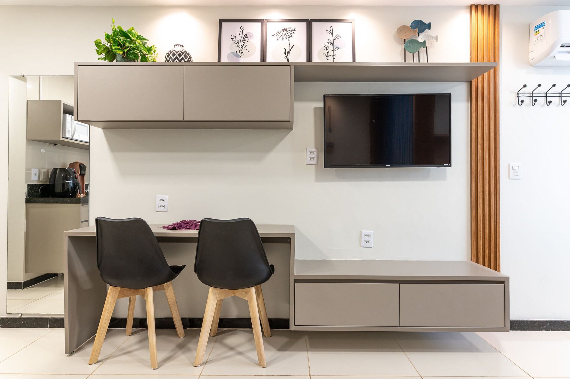 Sala de Estar: Relaxe no confortável sofá-cama enquanto assiste a seus filmes e séries favoritos na Smart TV. O espaço também conta com uma escrivaninha funcional, perfeita para quem precisa trabalhar remotamente.