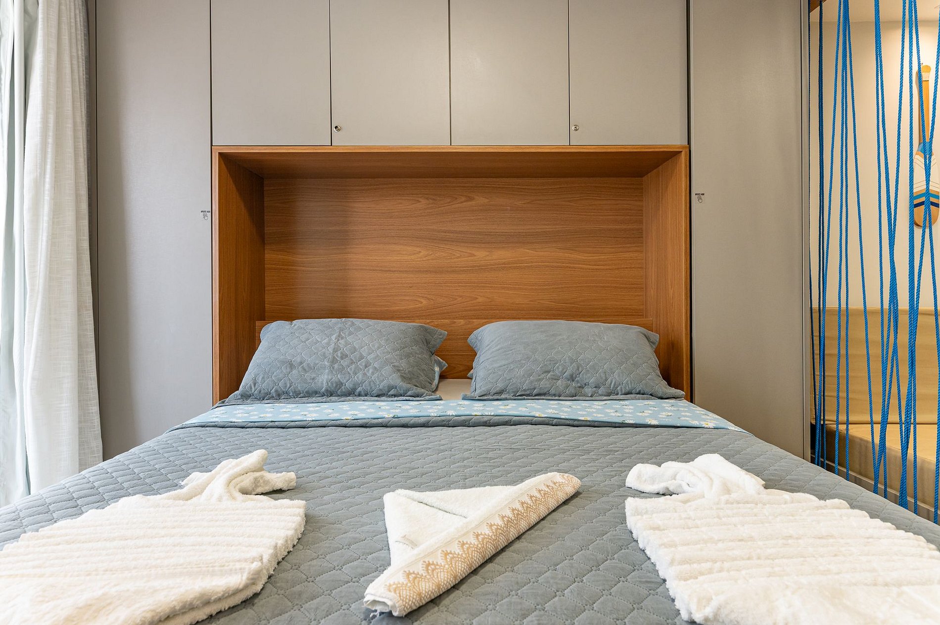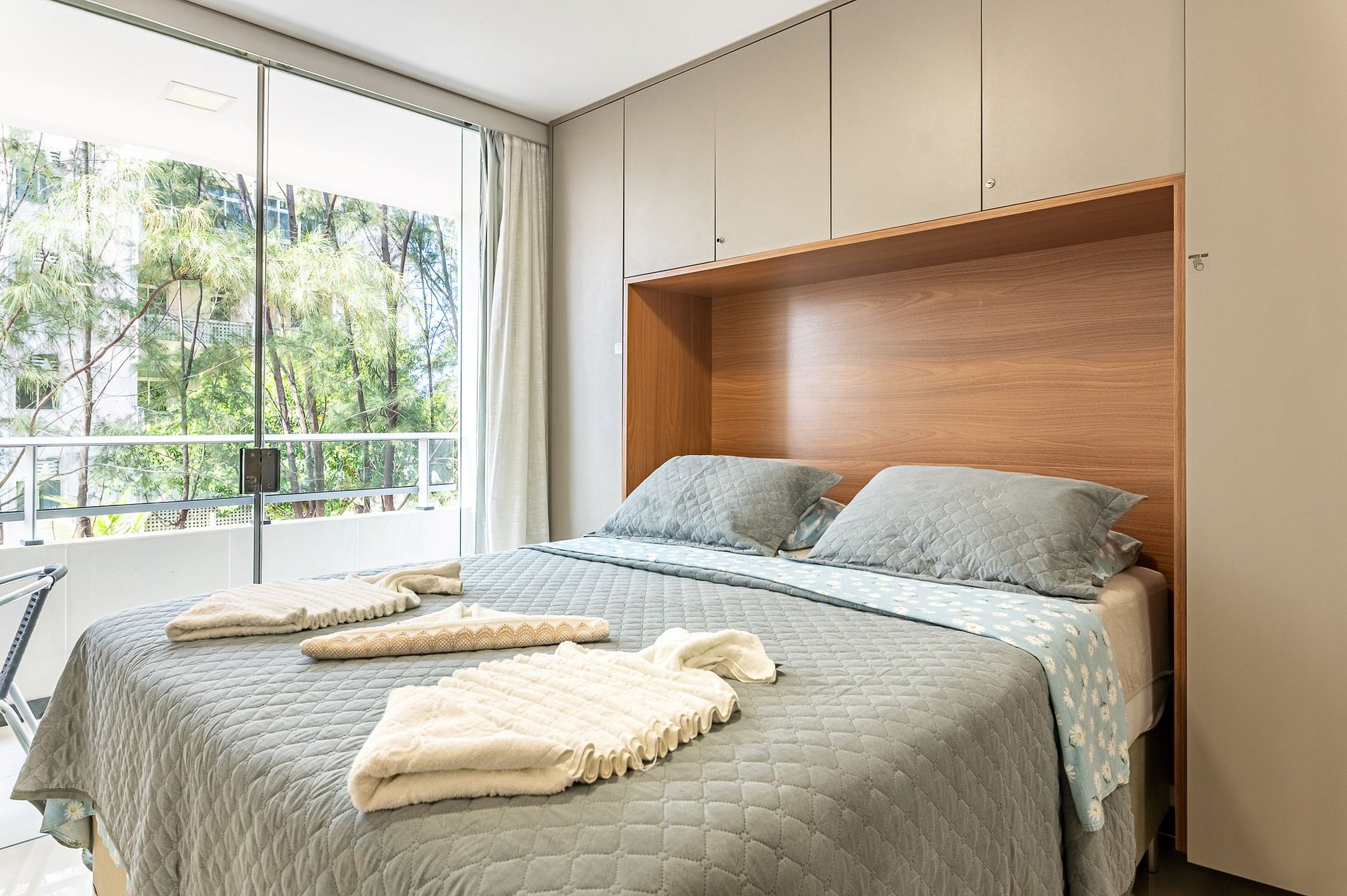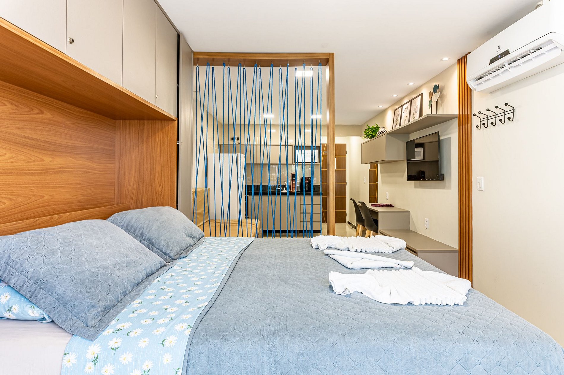 Quarto e Sala Integrados: O ambiente principal conta com uma cama queen espaçosa e confortável para noites de sono revigorantes. Para separar os ambientes e garantir sua privacidade, uma divisória moderna e charmosa foi instalada.