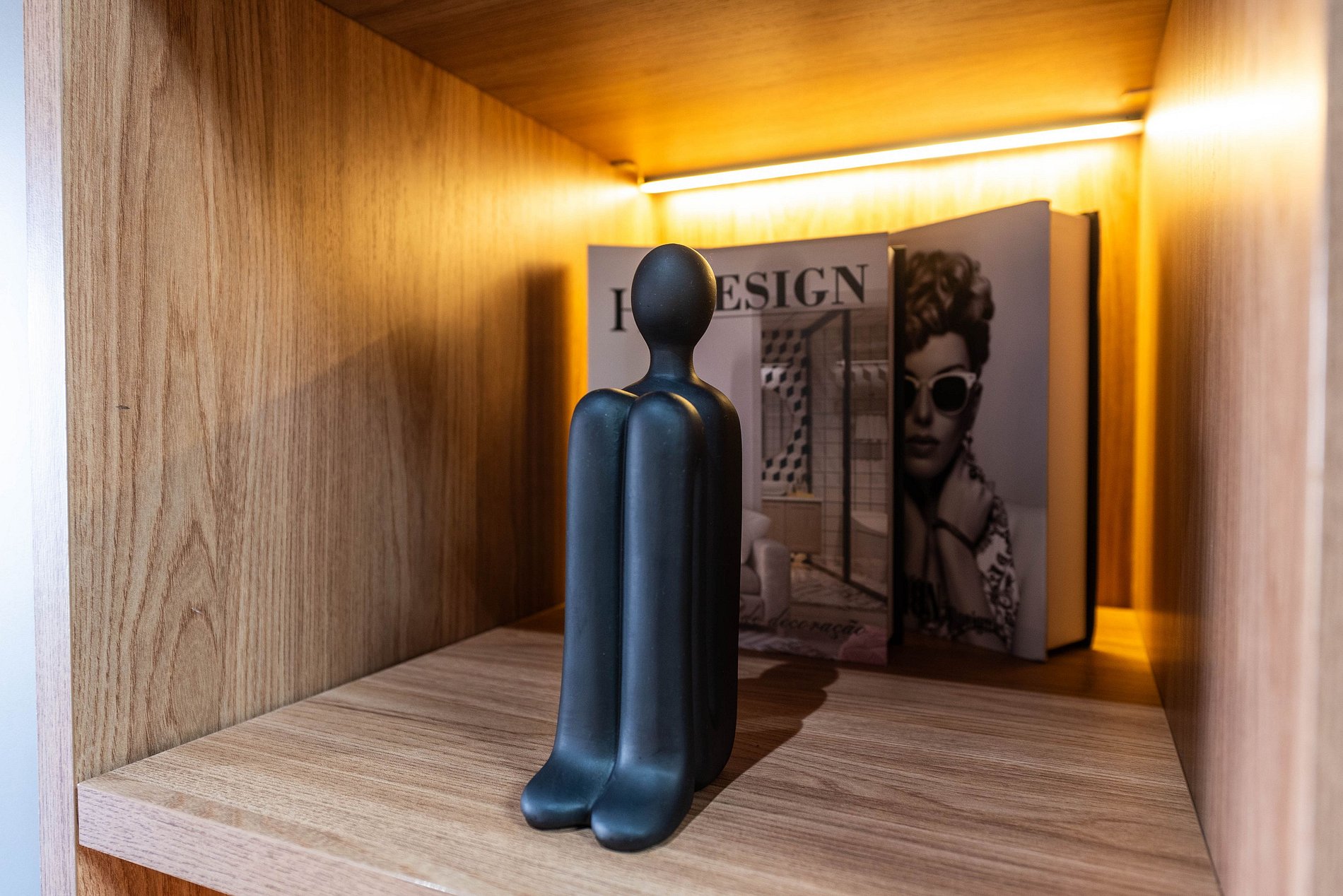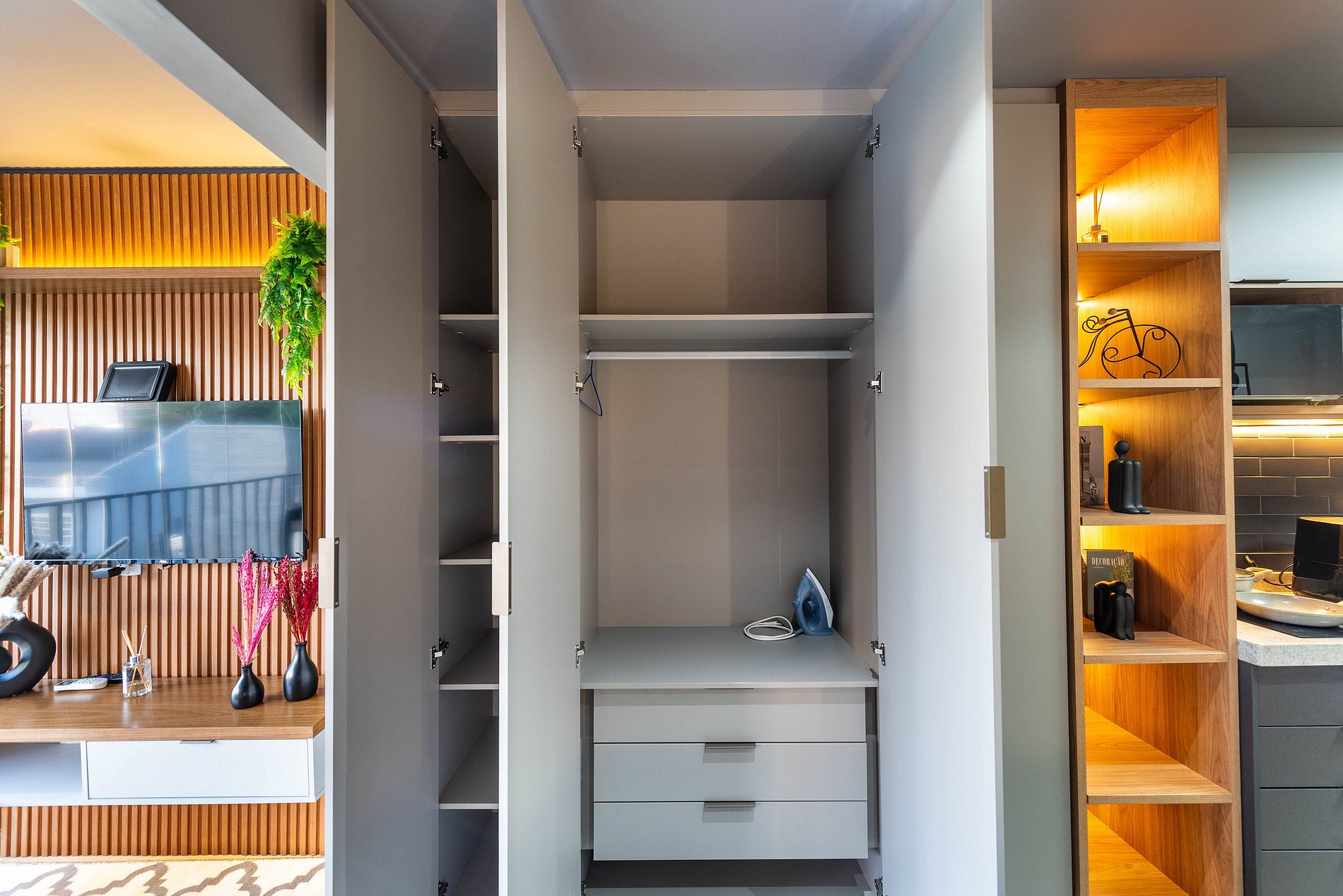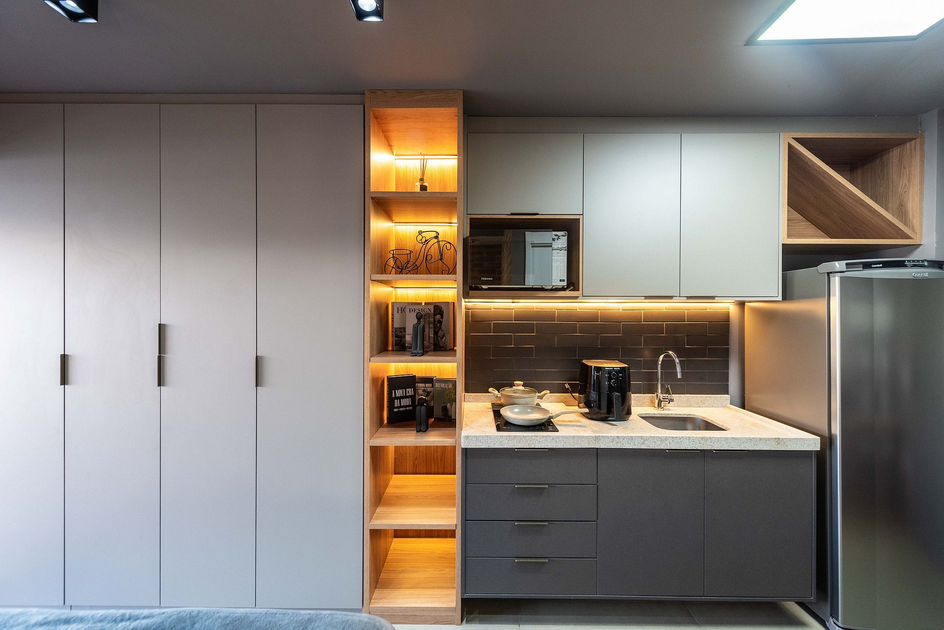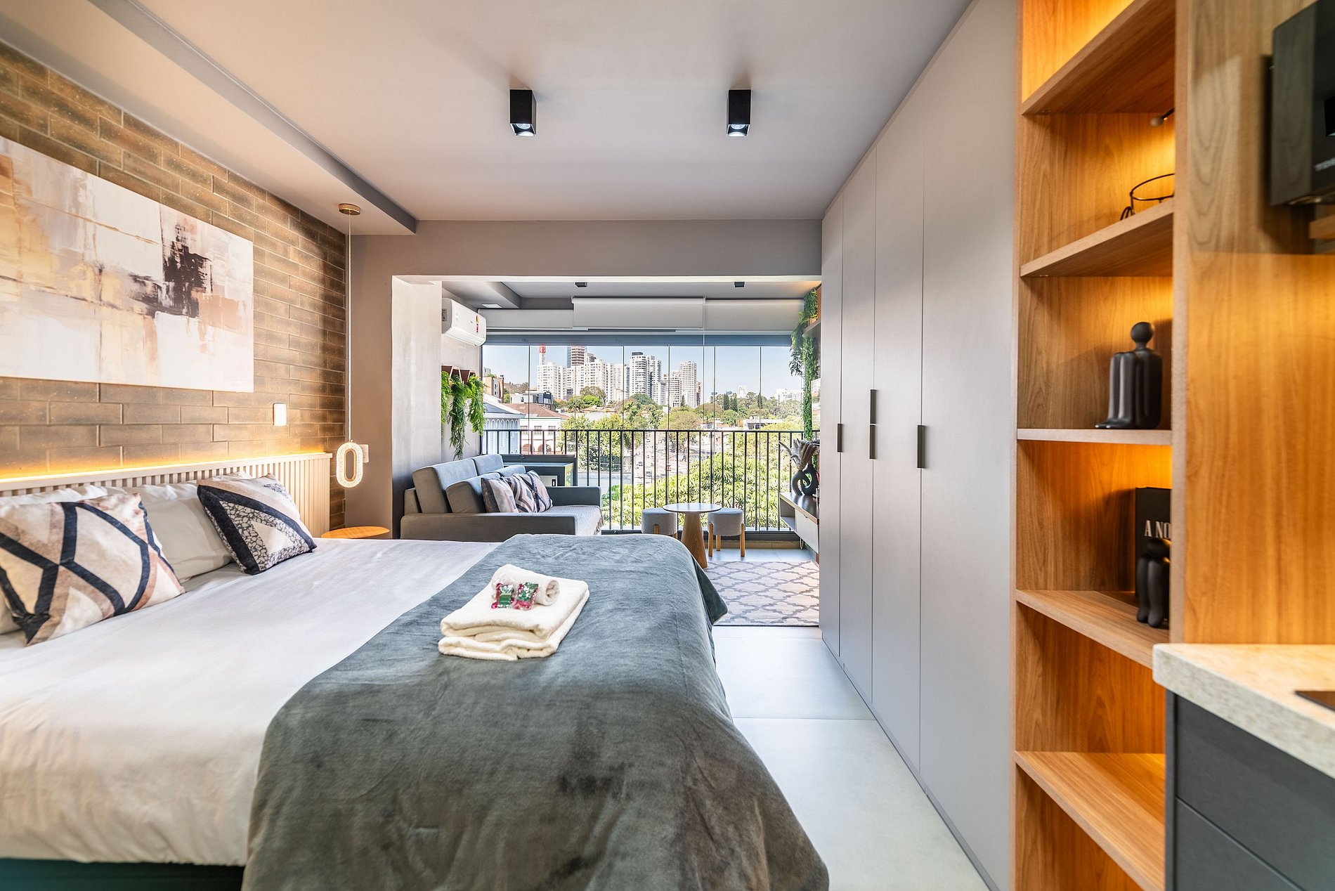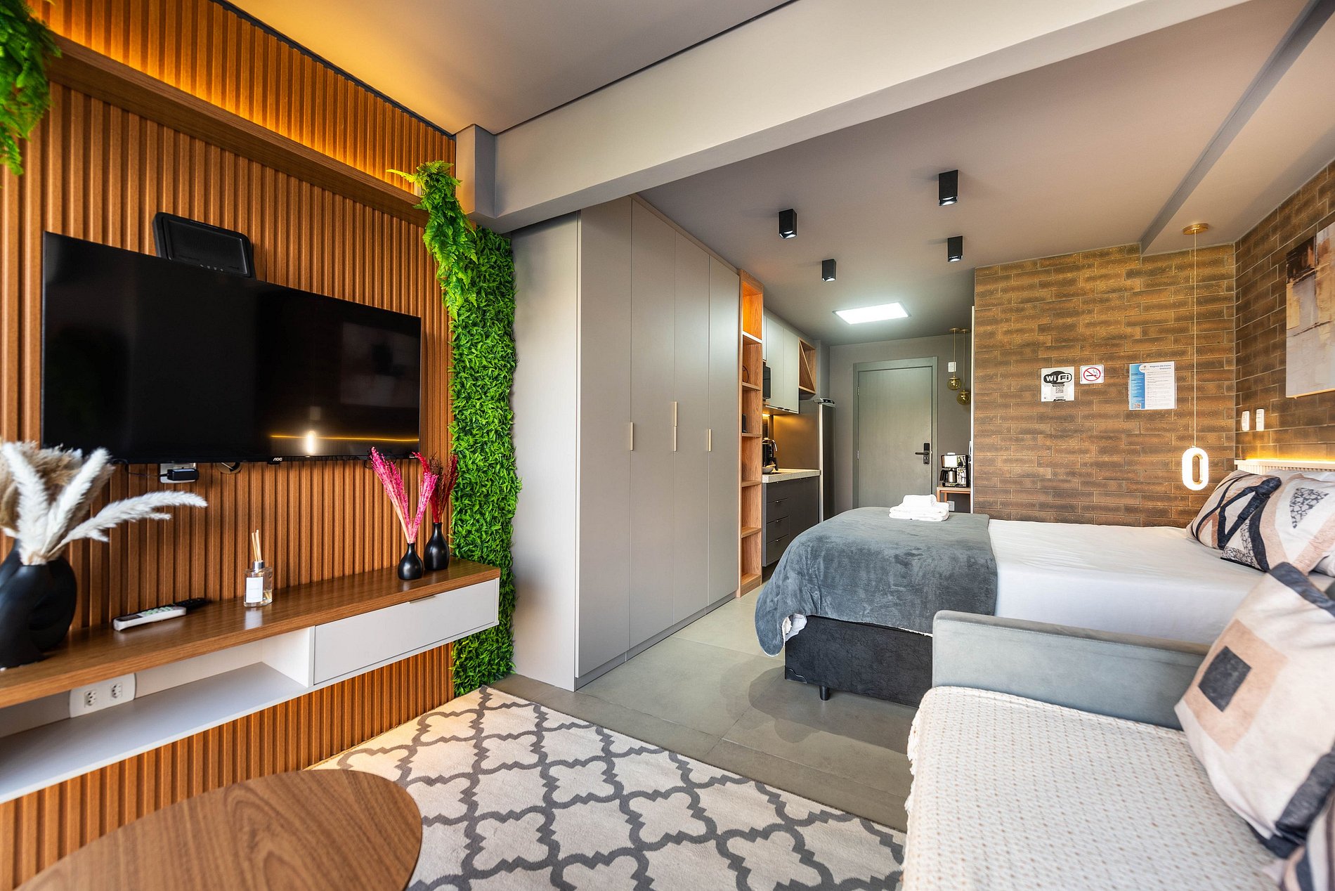 Ambiente Integrado e Sofisticado: O espaço combina quarto, sala e cozinha em um layout inteligente e elegante. A decoração conta com painéis de madeira ripada, iluminação planejada e um toque de verde, criando uma atmosfera acolhedora e moderna.