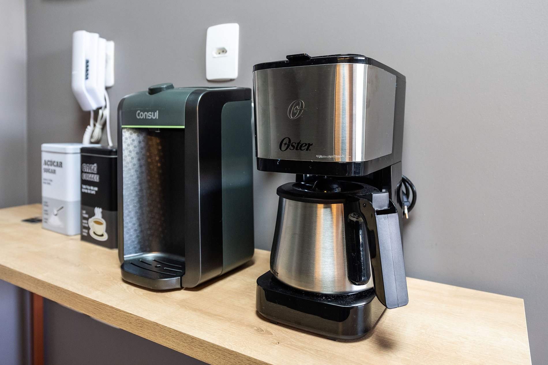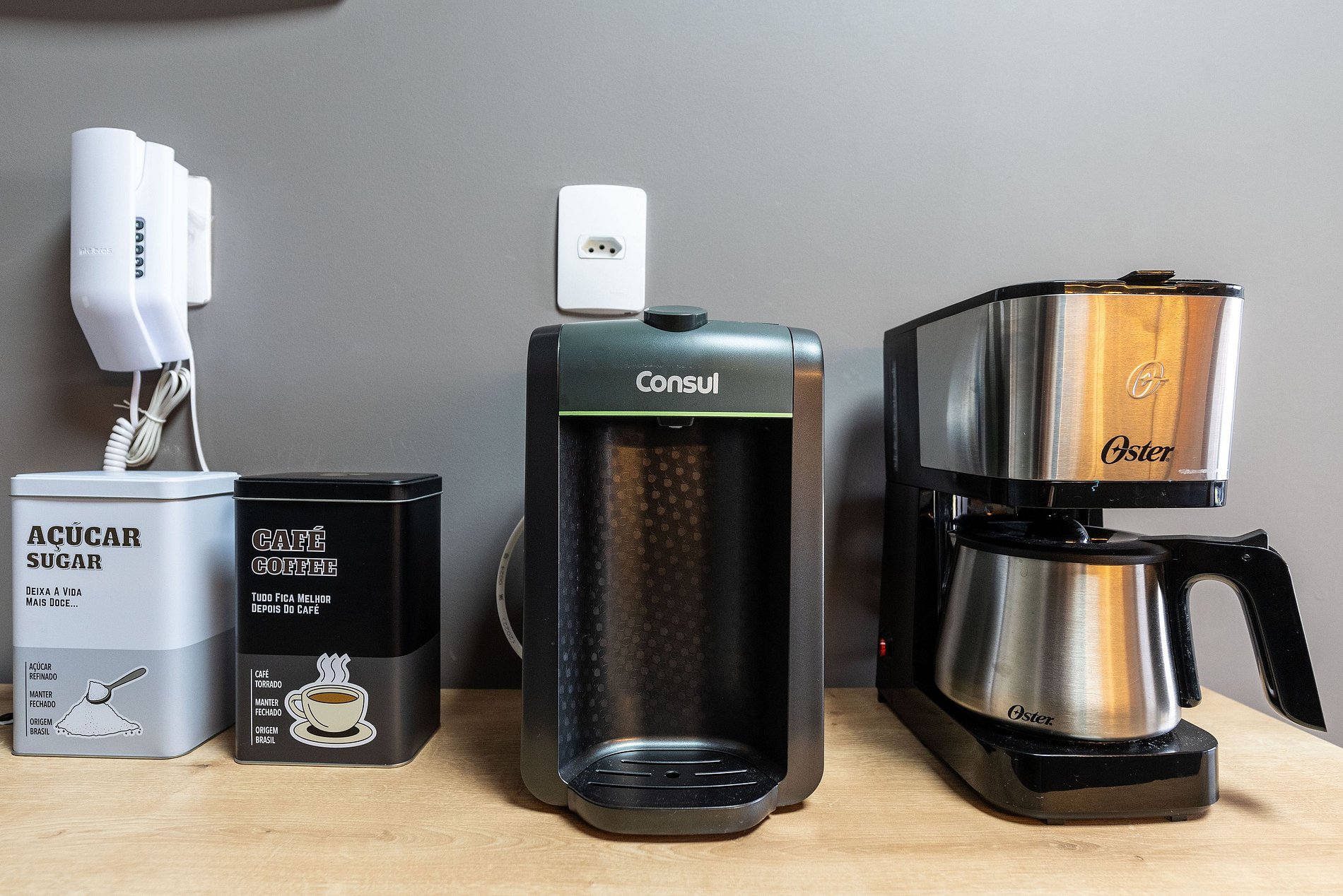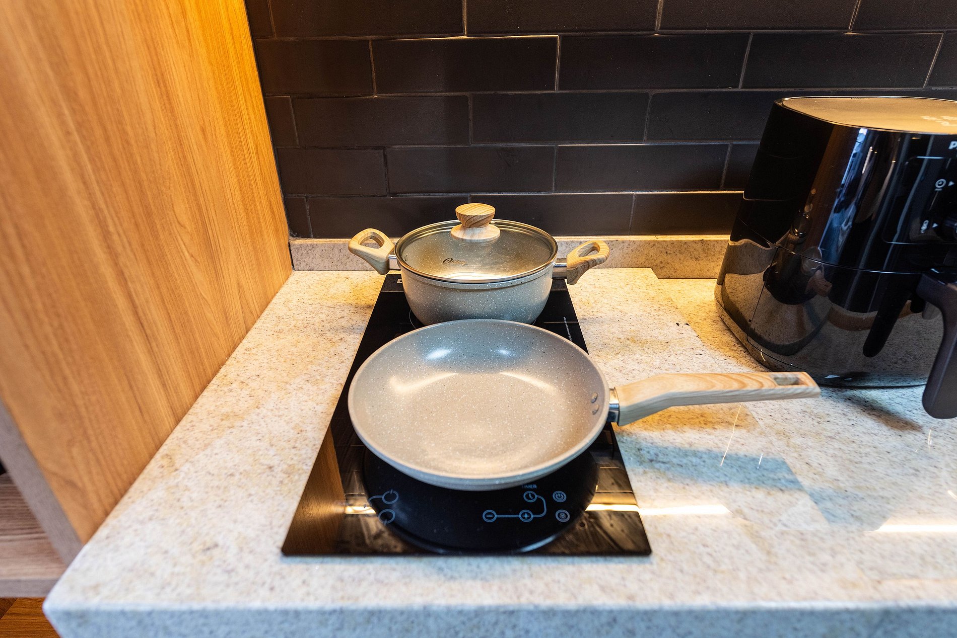 Cozinha Completa: Compacta e funcional, a cozinha está equipada com geladeira, cooktop, micro-ondas, cafeteira, e todos os utensílios necessários (talheres, panelas, taças) para preparar desde um lanche rápido a uma refeição completa.