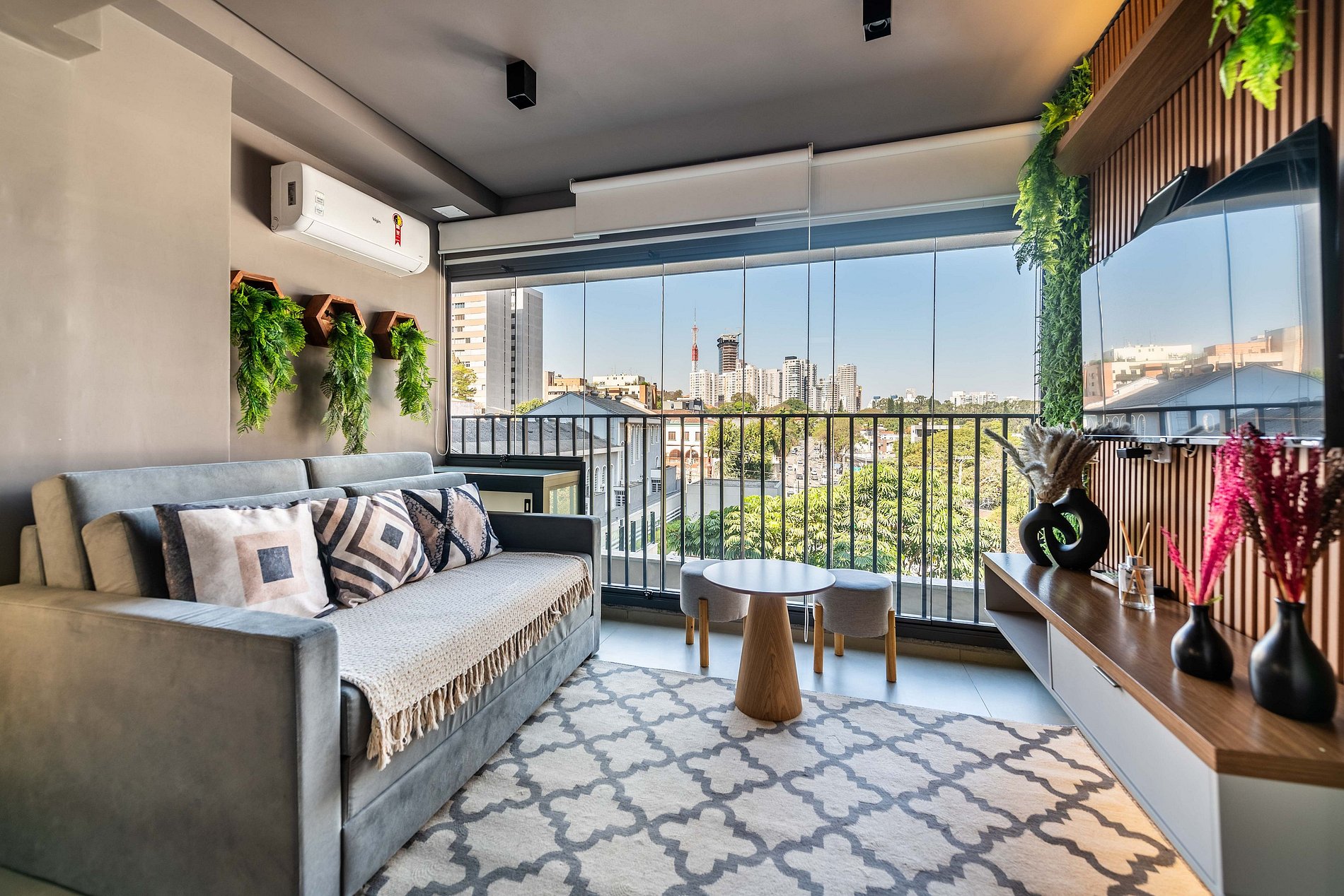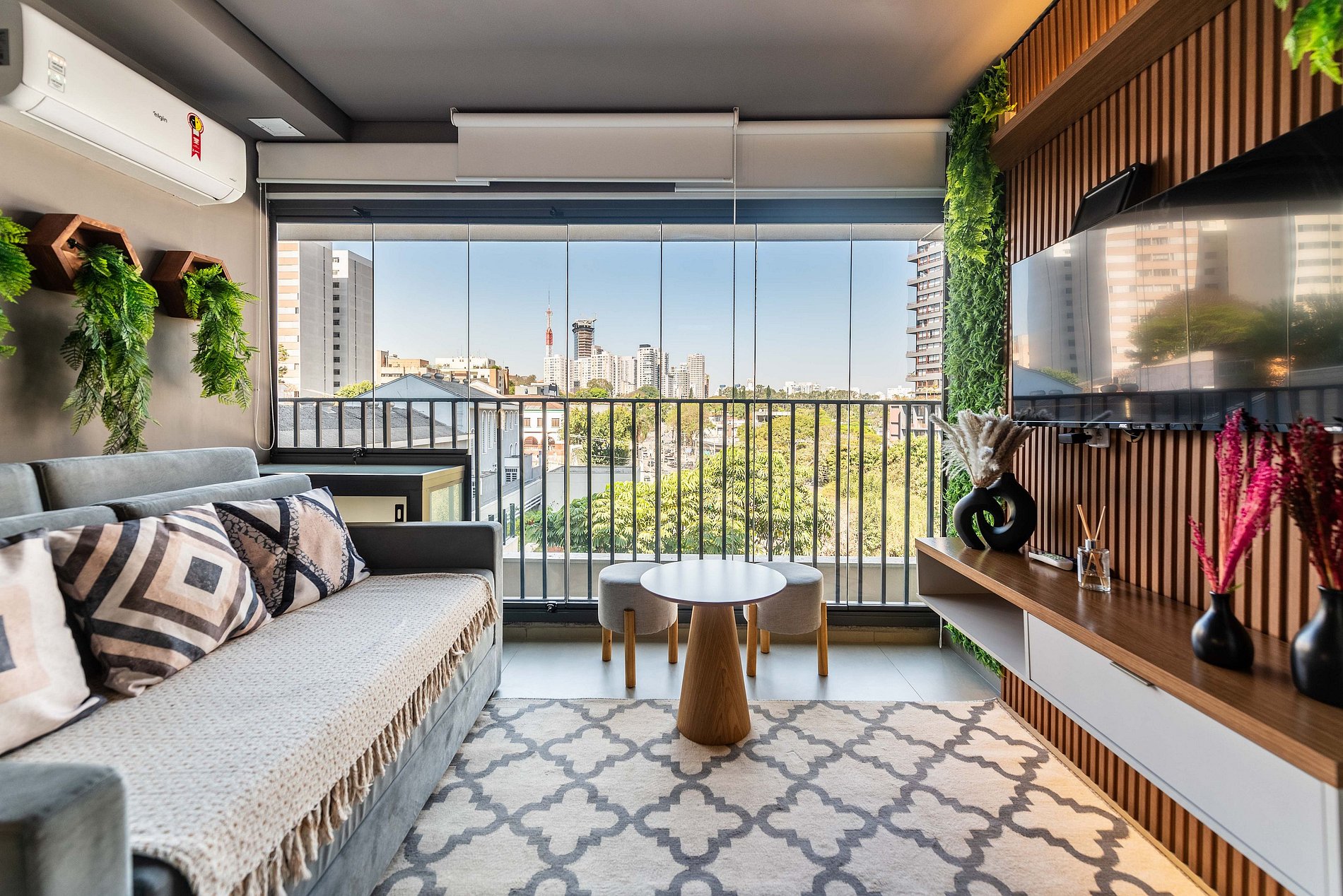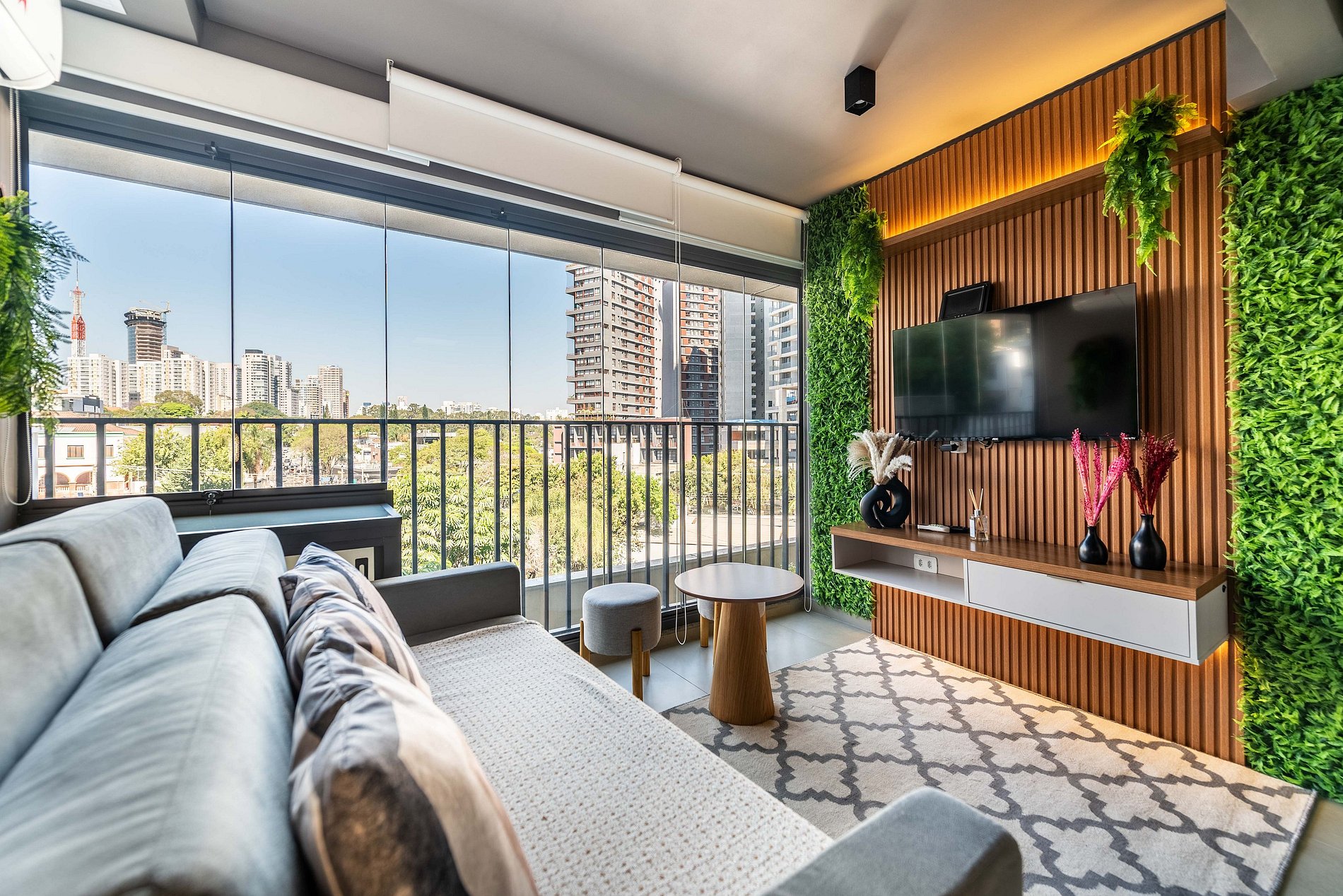Sala de Estar: A sala conta com um sofá-cama de casal aconchegante, uma Smart TV de tela plana fixada em um painel elegante e acesso direto à varanda.