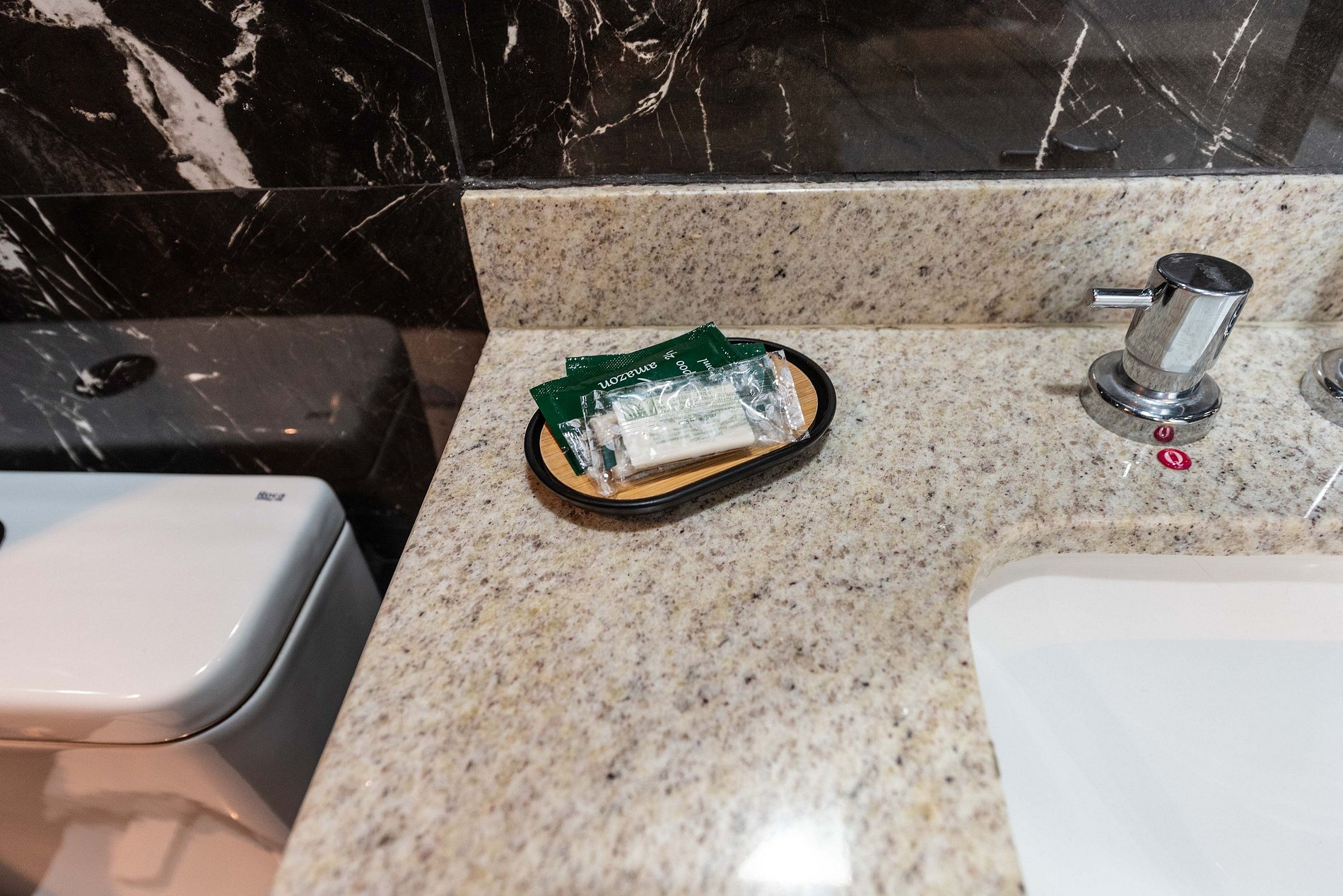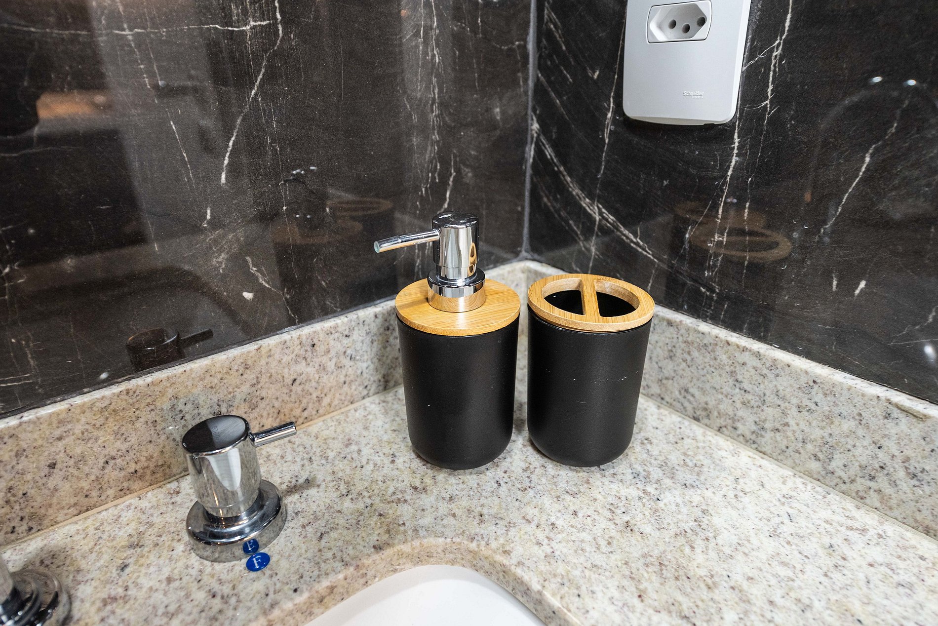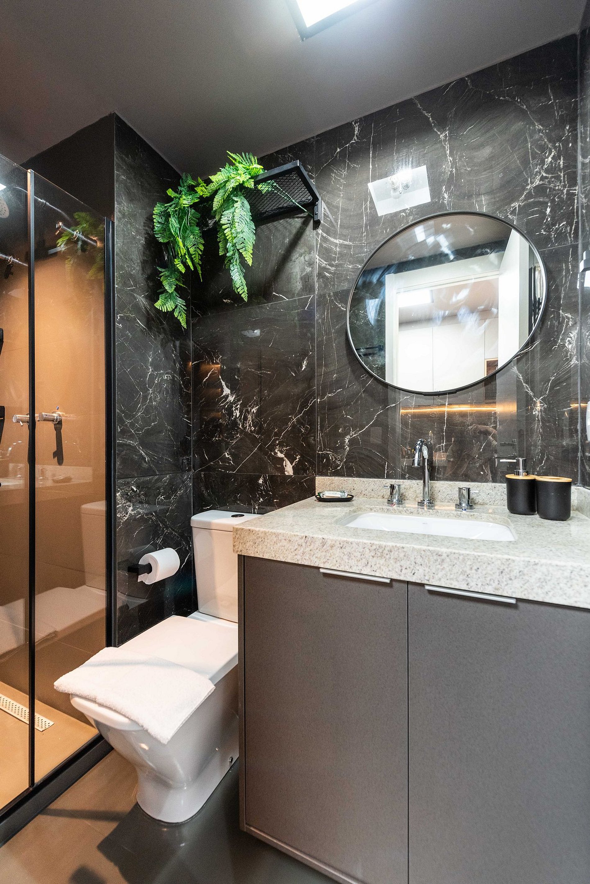 Banheiro: O banheiro segue o design sofisticado do studio, com revestimento em mármore escuro, box de vidro e um chuveiro revigorante.