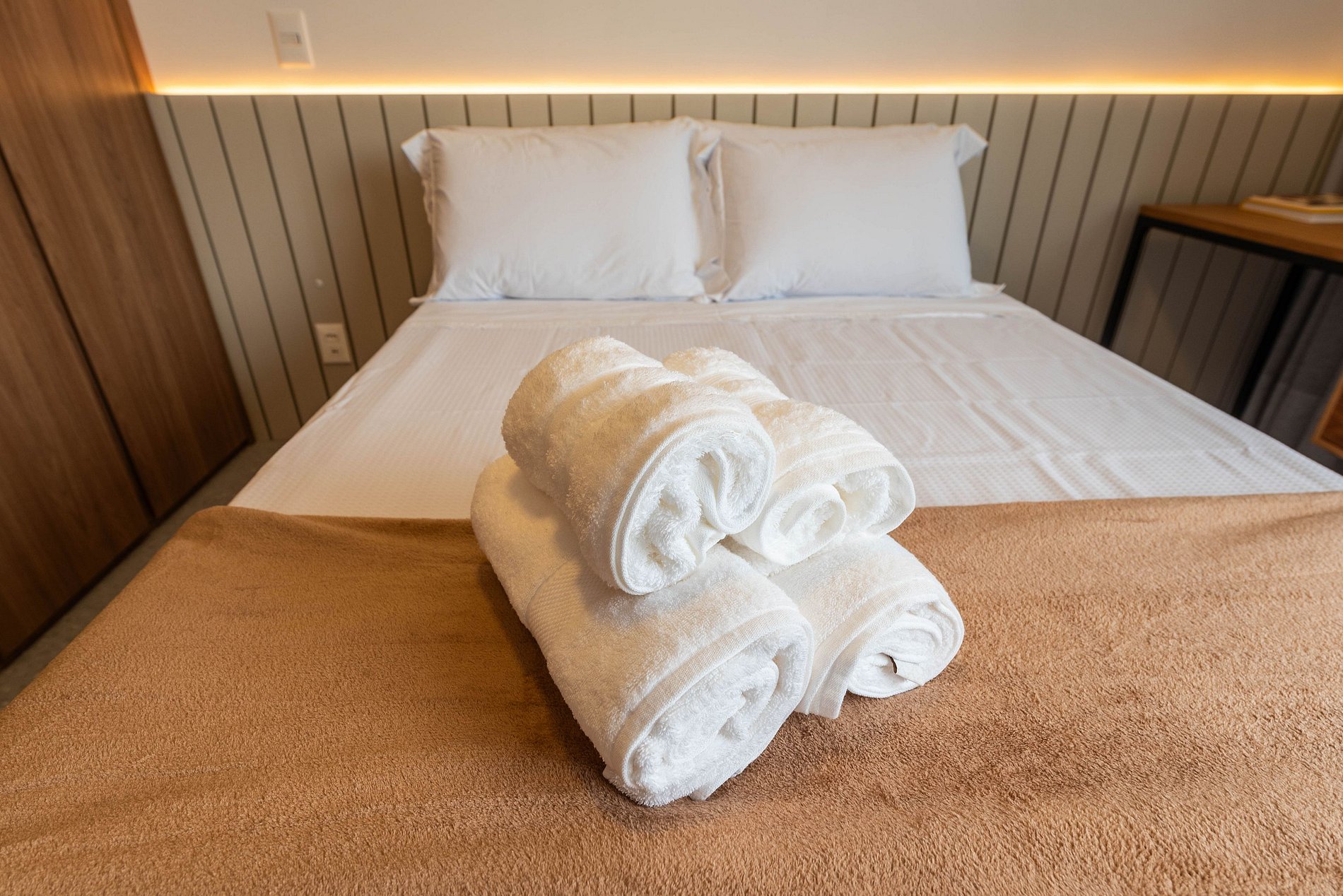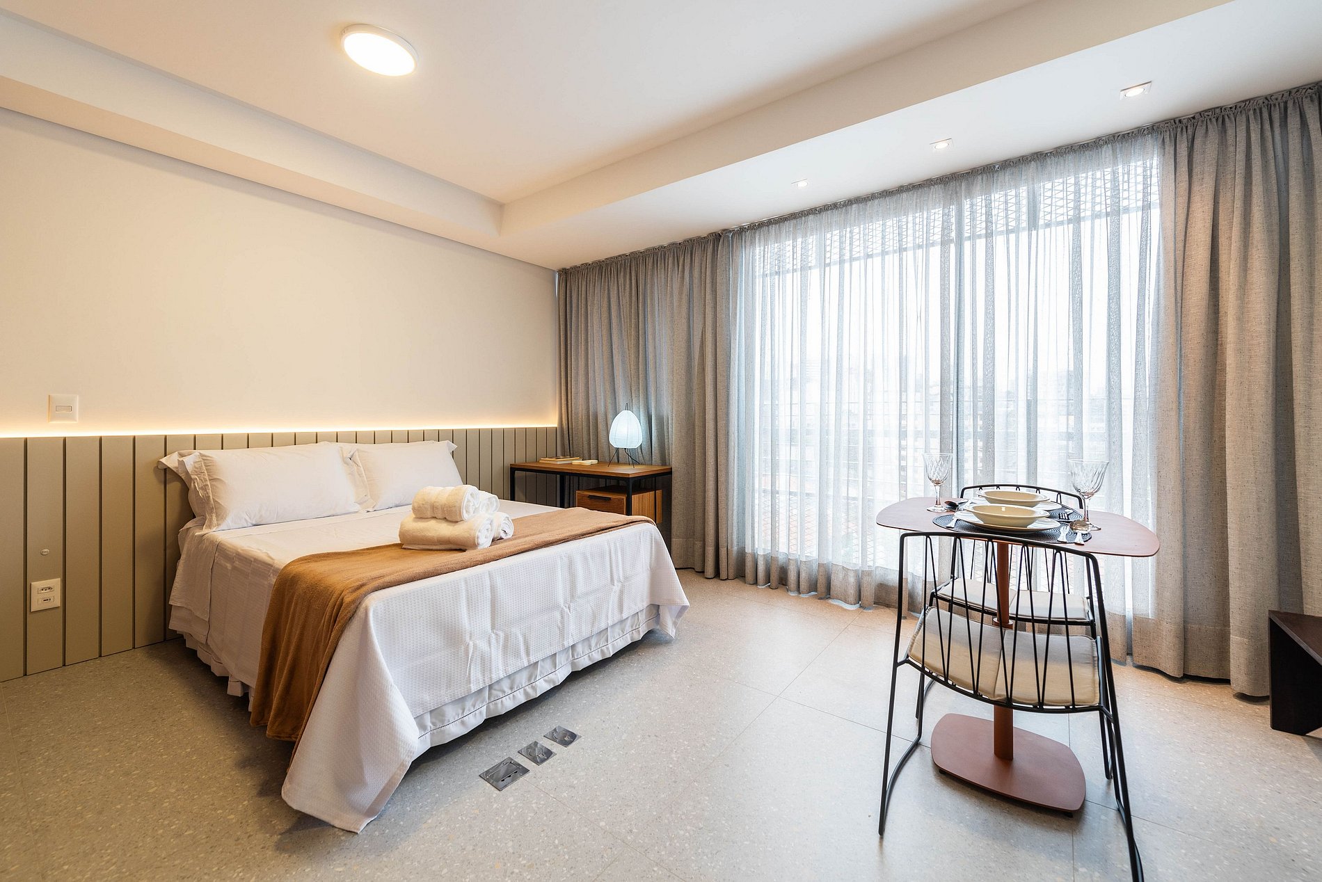 Wi-Fi de alta velocidade e uma Smart TV garantem que você esteja sempre conectado e entretido. A decoração é pensada para ser clean e acolhedora, com quadros de arte que adicionam personalidade. A iluminação indireta e estratégica cria diferentes climas para cada momento do dia.