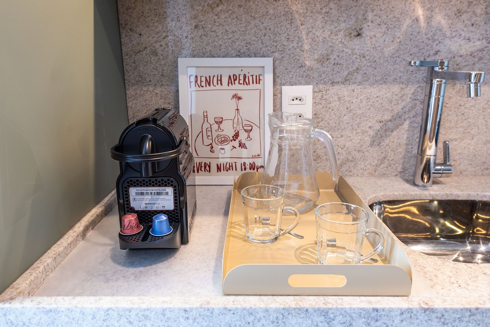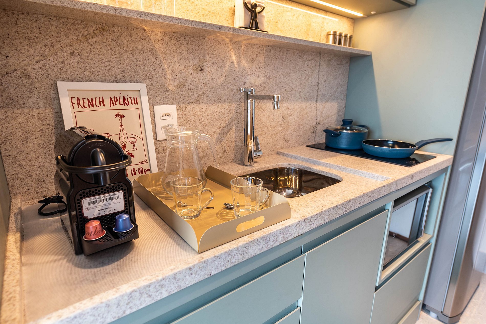 Uma cama queen-size aconchegante com lençóis macios e toalhas felpudas garantem uma noite de sono tranquila. A iluminação ambiente cria uma atmosfera relaxante, enquanto a parede ripada adiciona um toque de design contemporâneo. Na cozinha Compacta e completa, prepare suas refeições favoritas na cozinha bem equipada, que inclui micro-ondas, fogão elétrico de indução, geladeira, cafeteira Nespresso, utensílios de cozinha de qualidade e um kit de boas-vindas com café. Tudo o que você precisa para se sentir em casa, desde um café da manhã rápido até um jantar especial. Uma mesa moderna com duas cadeiras confortáveis serve tanto para refeições íntimas quanto para um espaço de trabalho produtivo, com vista para a cidade. Uma luminária de mesa elegante complementa o ambiente. Um banheiro moderno e funcional com chuveiro de box blindex e amenidades essenciais para sua conveniência. O revestimento em tons de verde-água confere um toque fresco e relaxante.