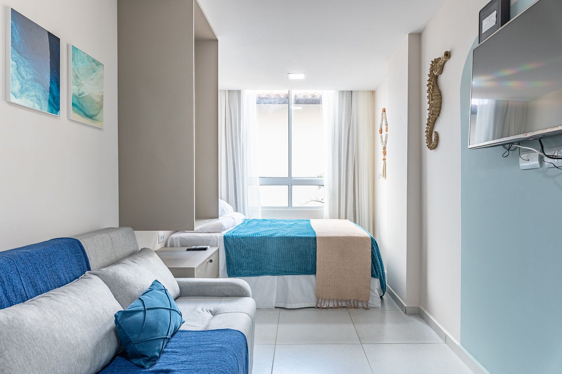 Charmoso estúdio totalmente mobiliado no centro de Porto de Galinhas, a apenas 450m da praia. O prédio oferece piscina na cobertura com vista panorâmica da cidade. Cozinha equipada (fogão elétrico, forno, geladeira, liquidificador, sanduicheira, cafeteira) e todos os utensílios que você precisa. Cortinas blackout garantem descanso. Ideal para casal, familia pequena e viajante solo que busca conforto, praticidade e localização privilegiada.