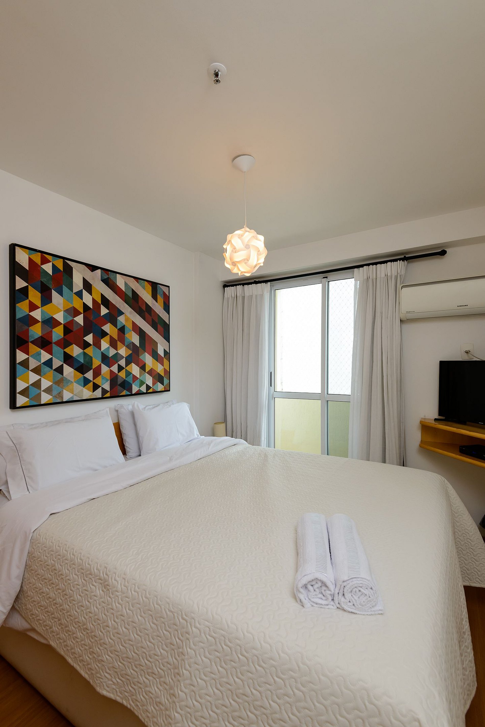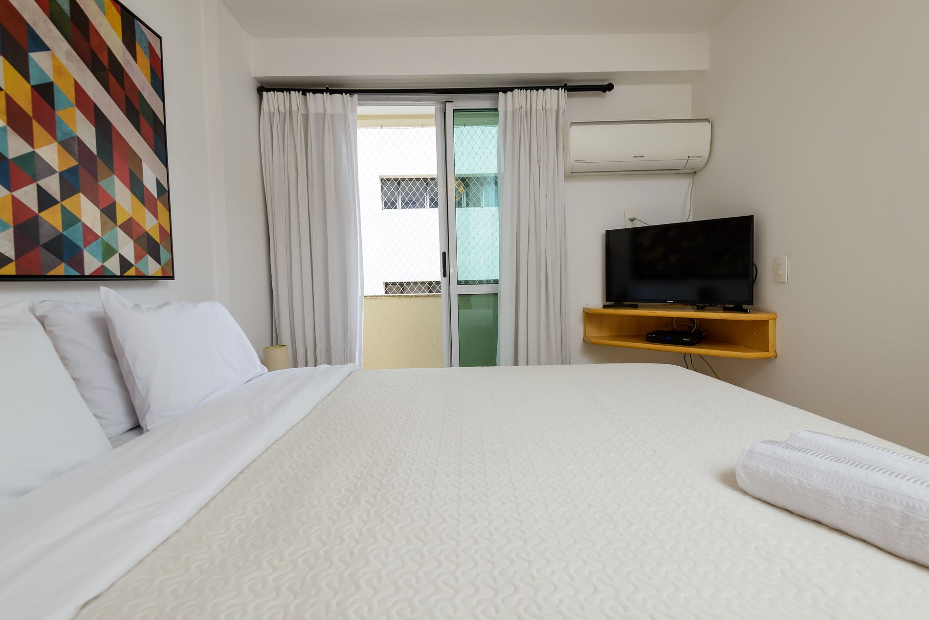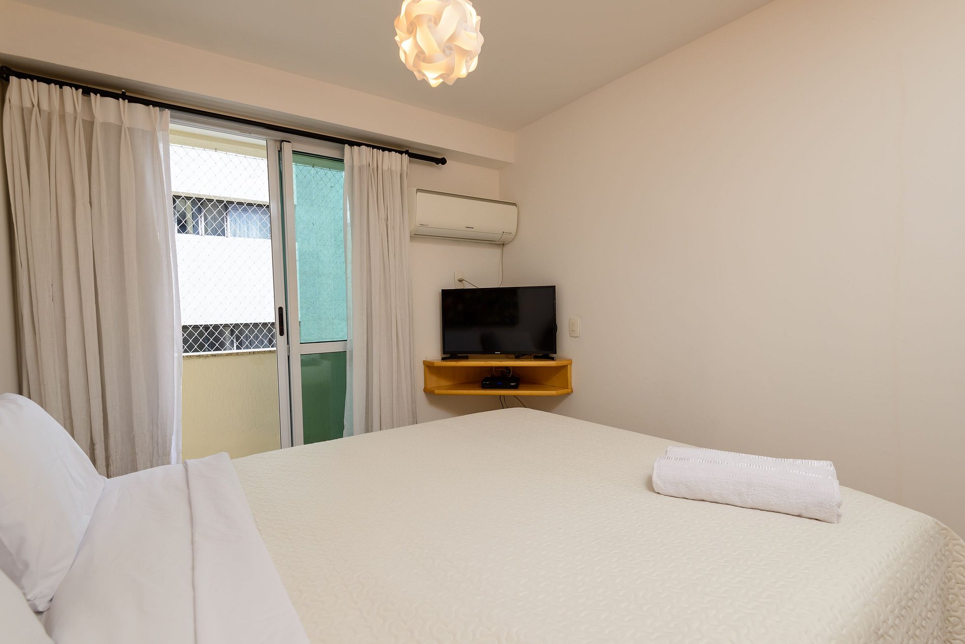 O quarto conta com armários, cama queen com enxoval completo, ar-condicionado, TV e acesso direto à varanda. O banheiro é completo, com chuveiro quente e enxoval de qualidade.