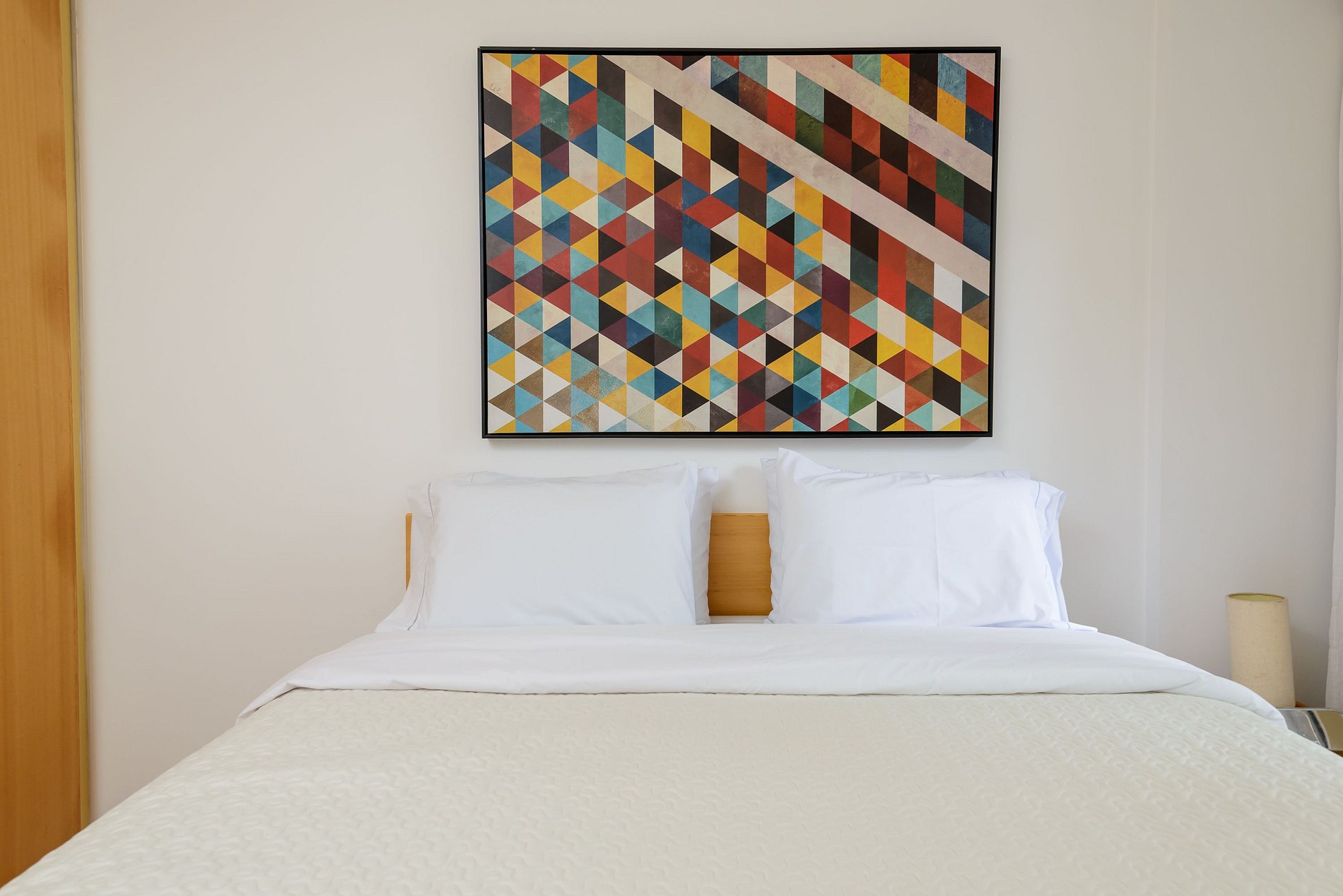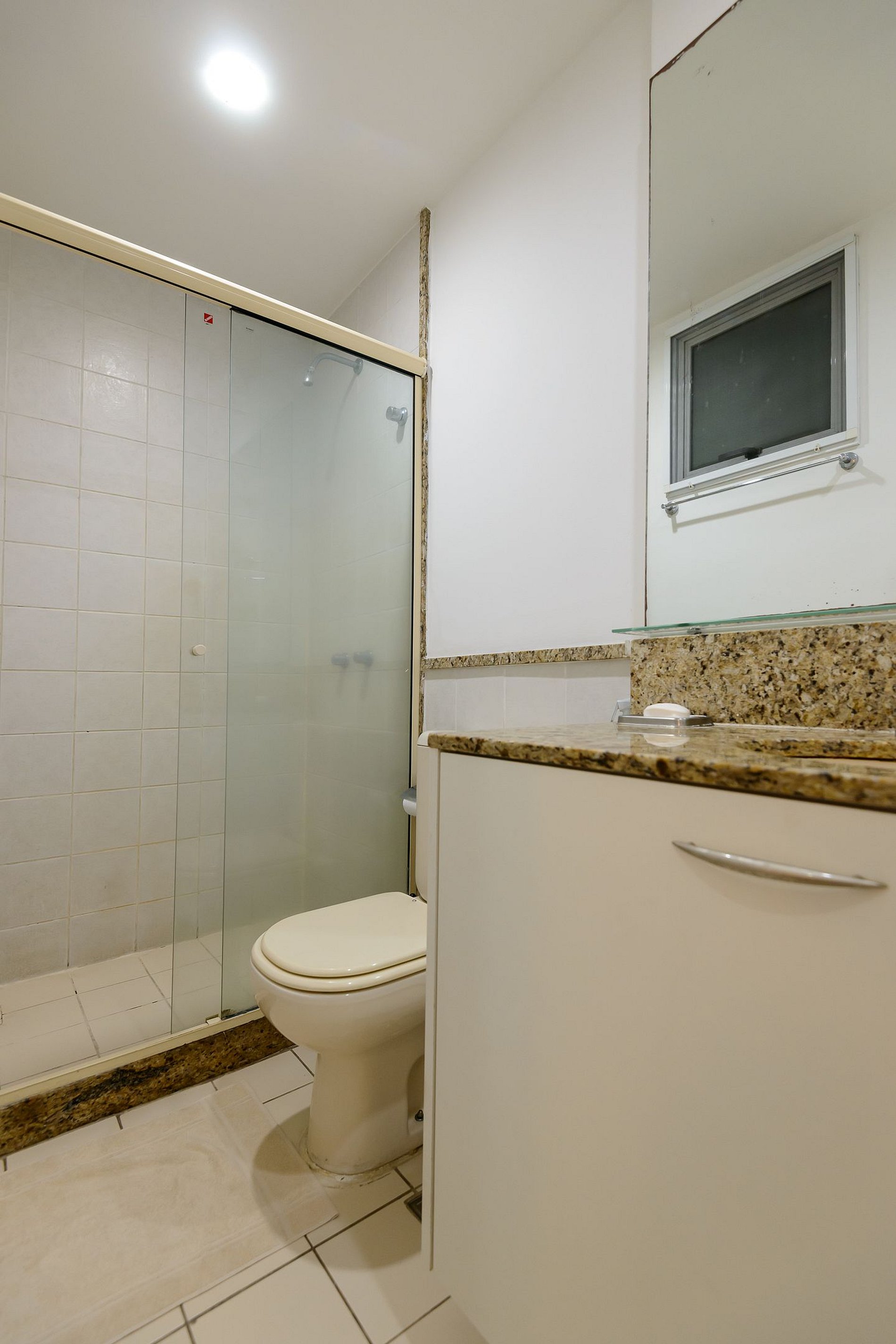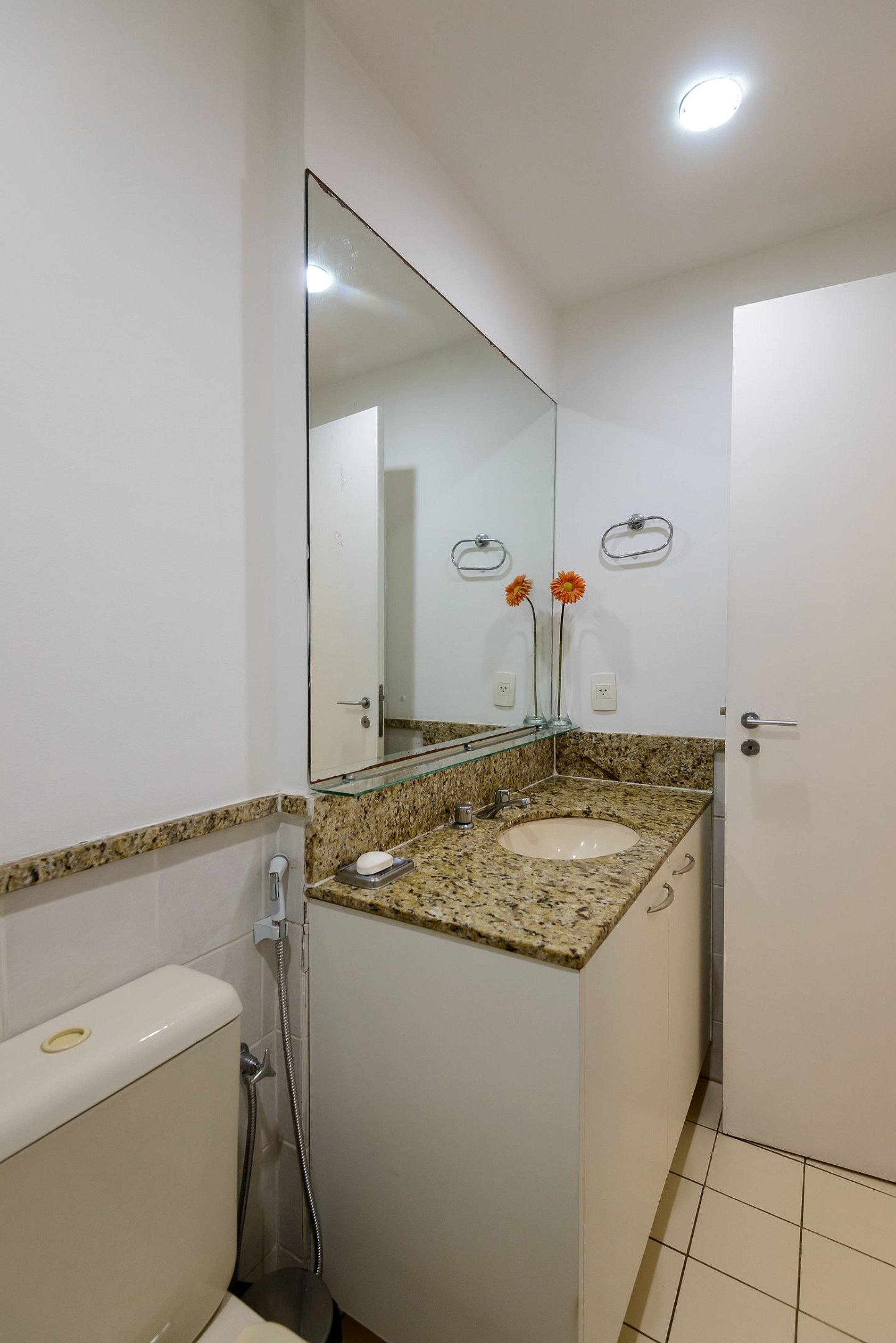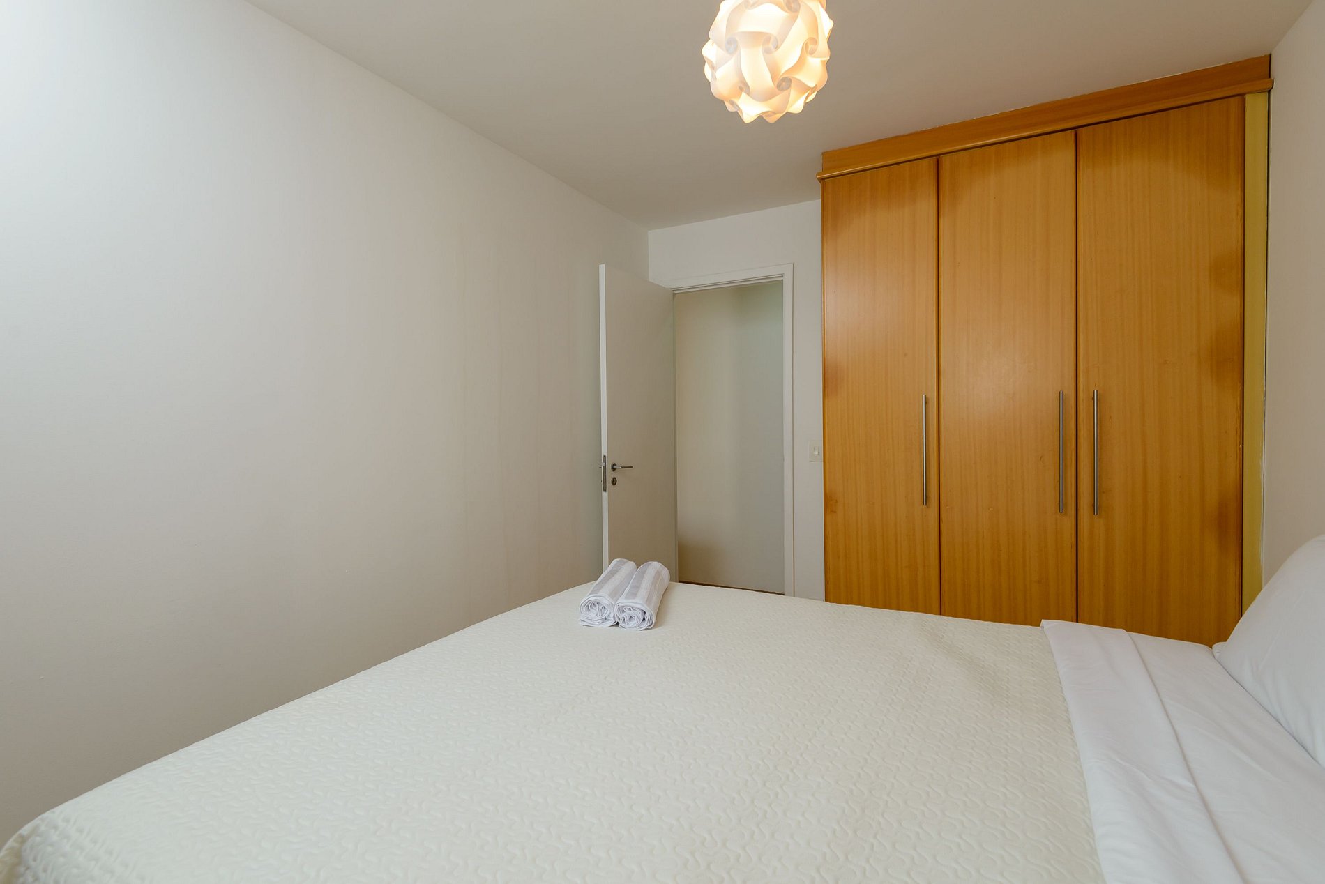 O quarto conta com armários, cama queen com enxoval completo, ar-condicionado, TV e acesso direto à varanda. O banheiro é completo, com chuveiro quente e enxoval de qualidade.