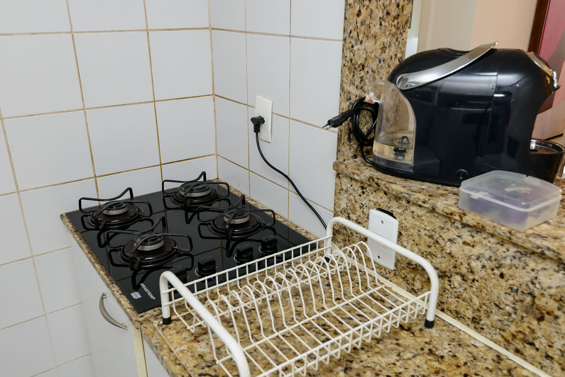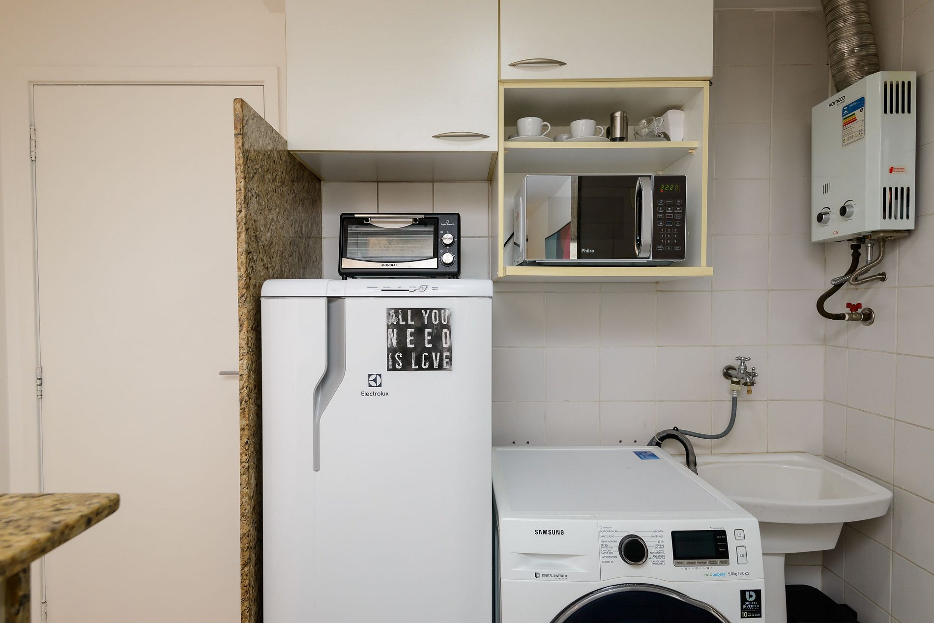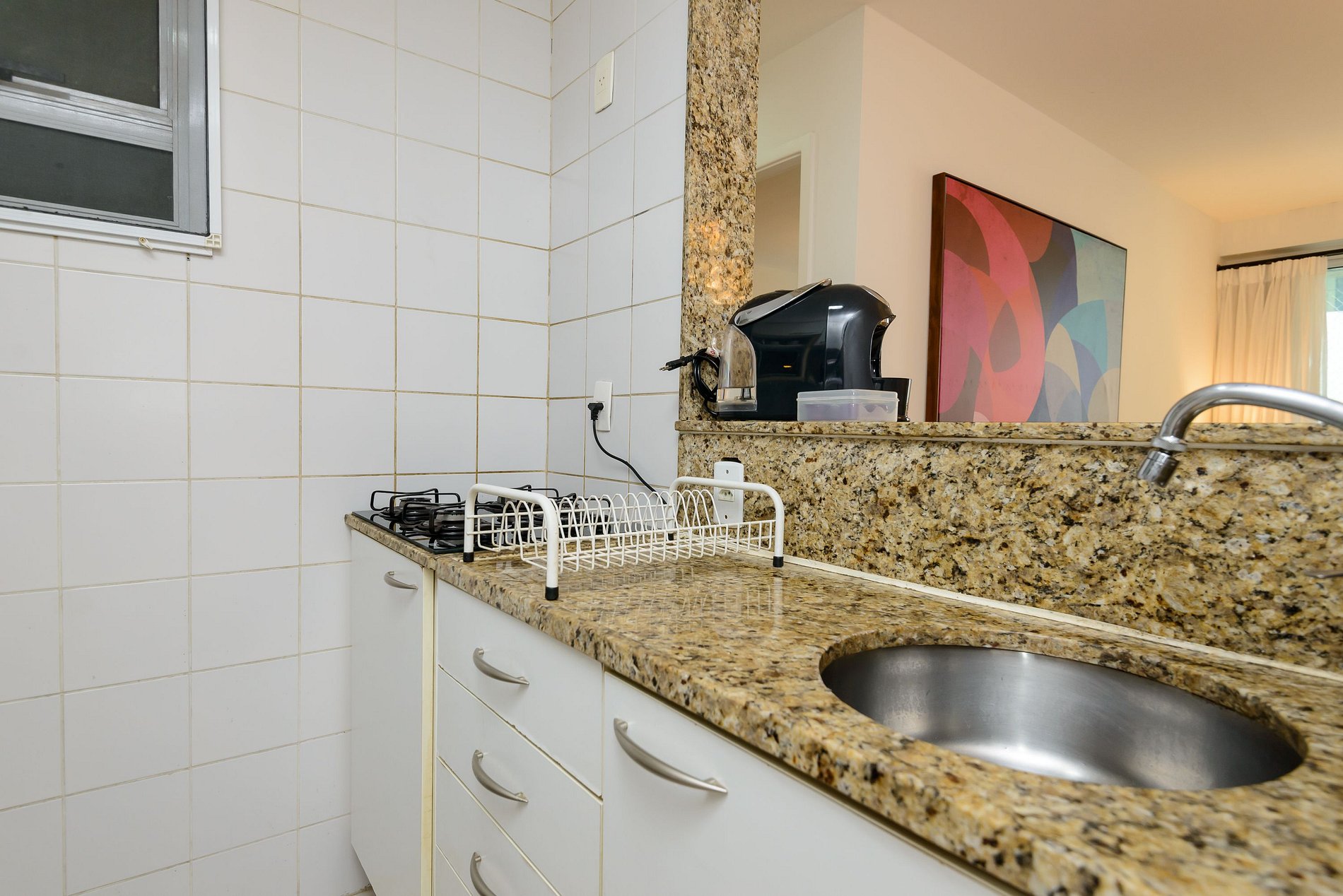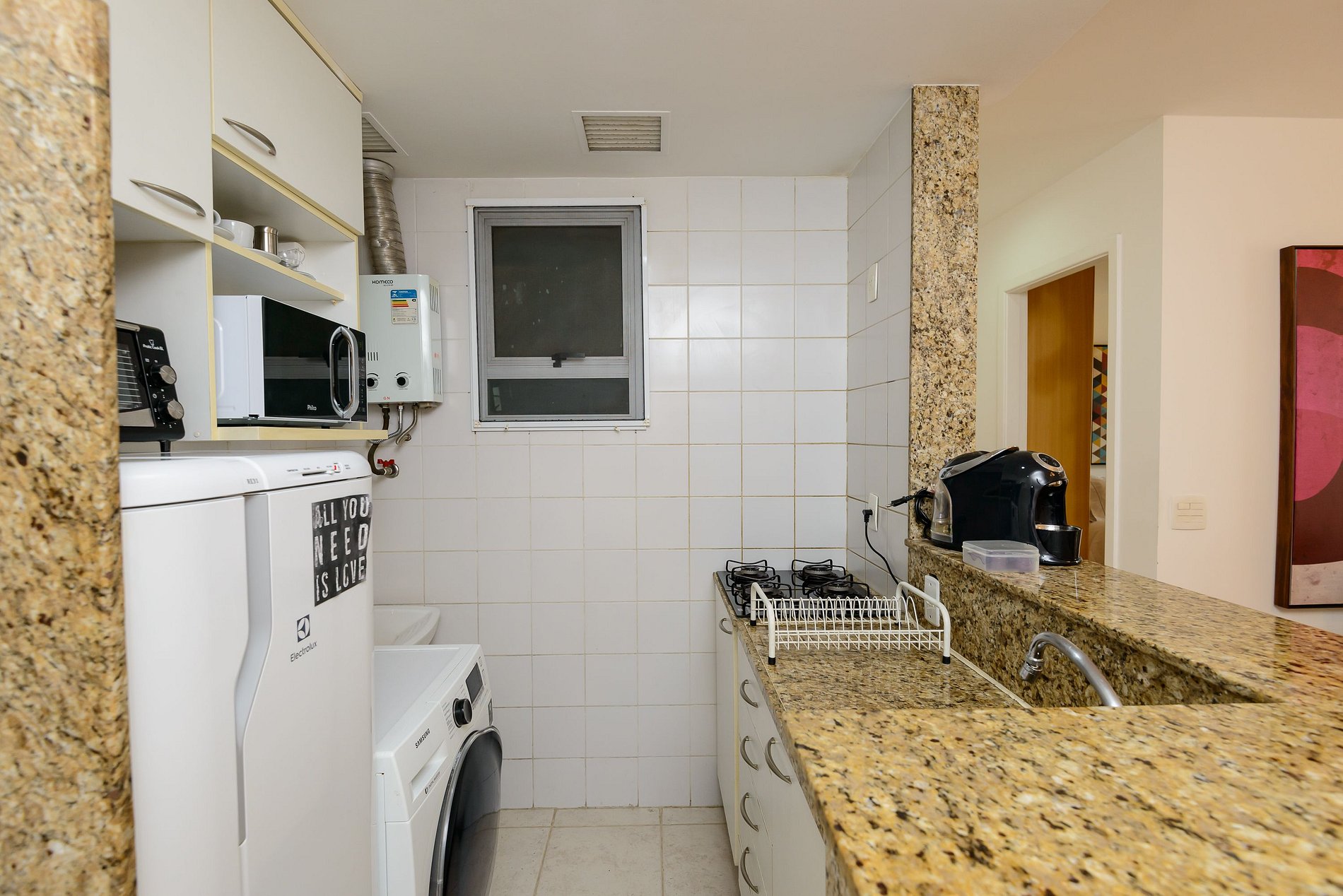 A cozinha é totalmente equipada com micro-ondas, fogão com forno, utensílios, geladeira, lava e seca, cafeteira elétrica, sanduicheira pia e bancada em granito.