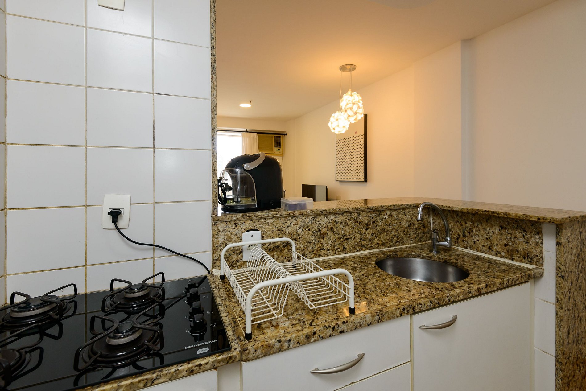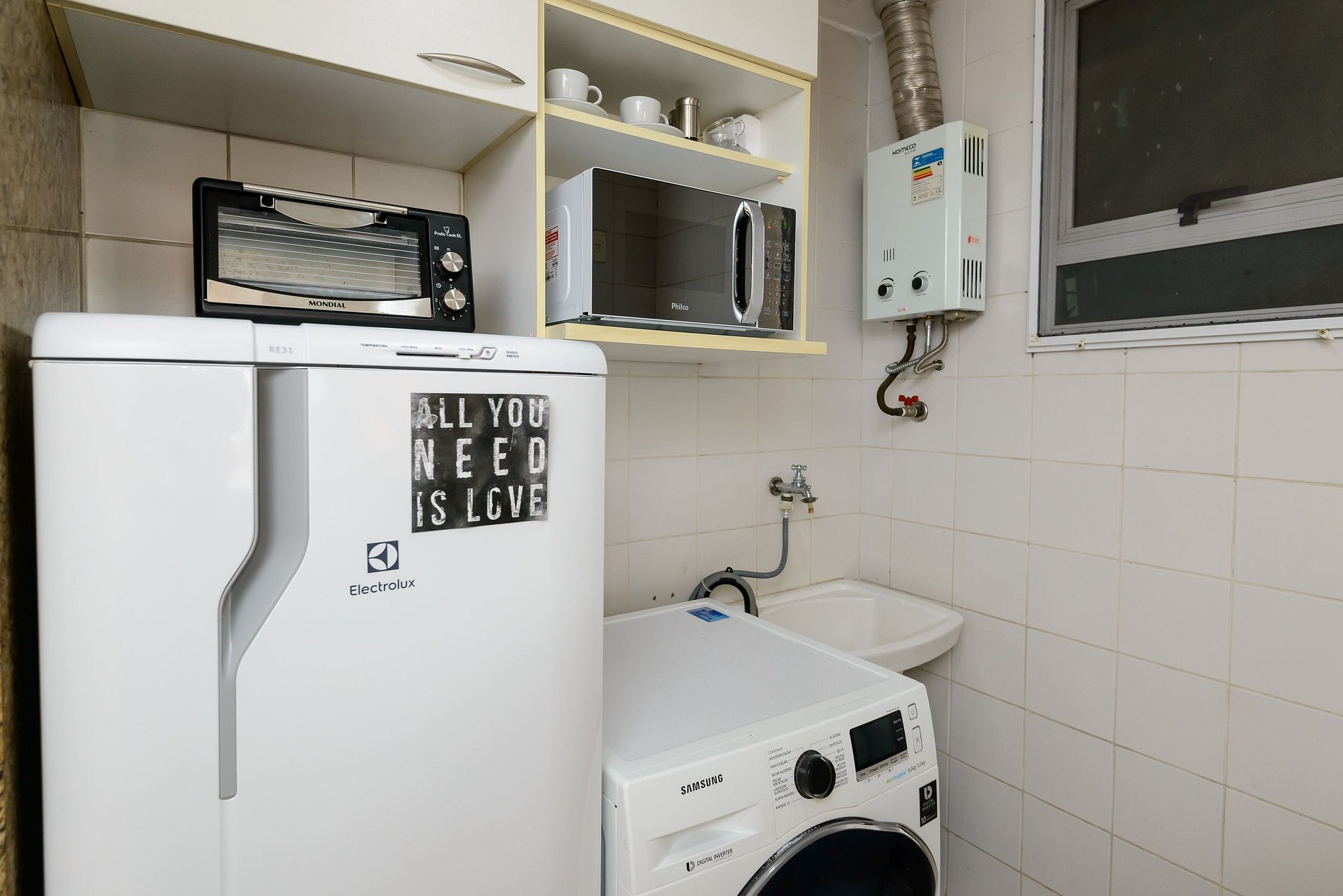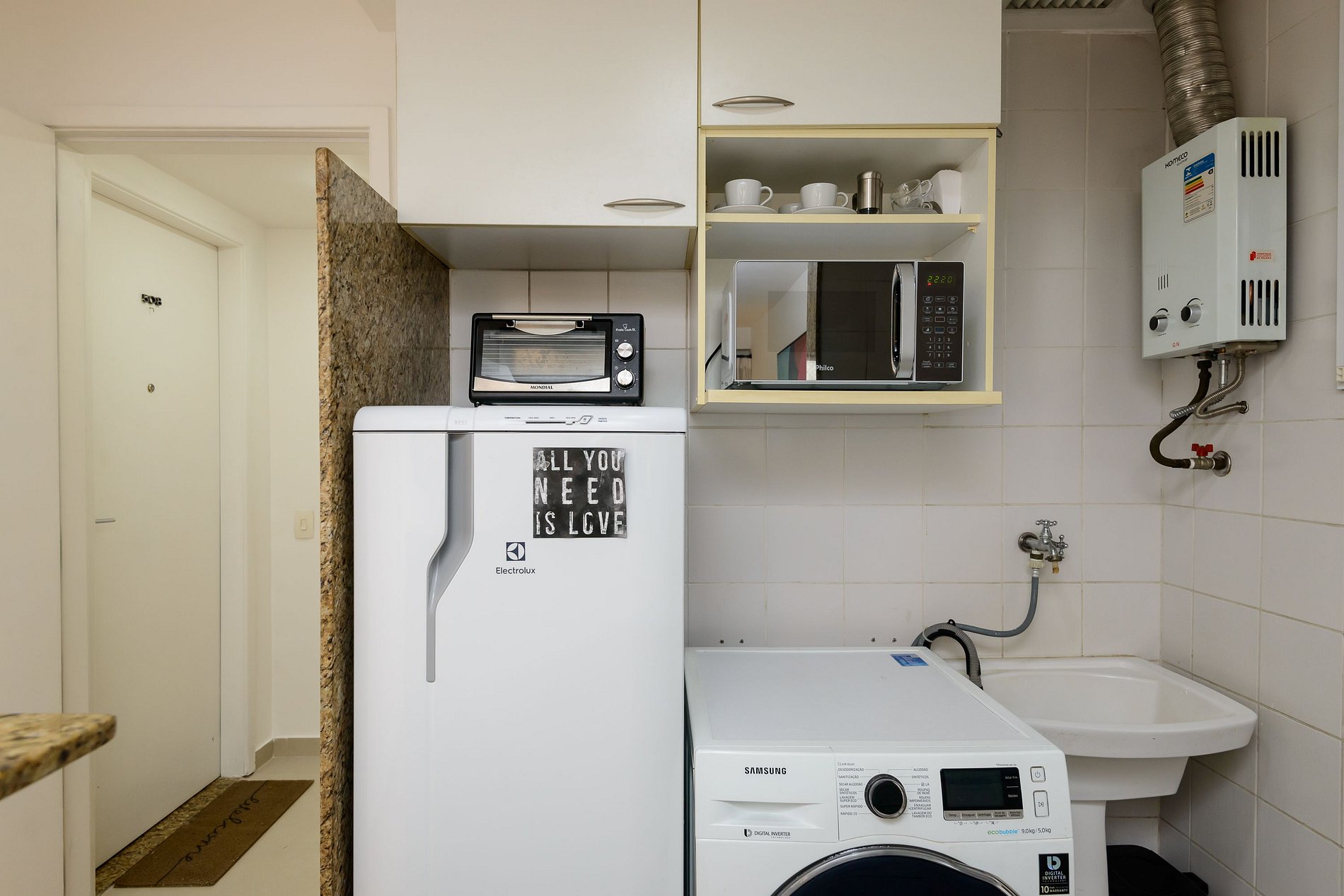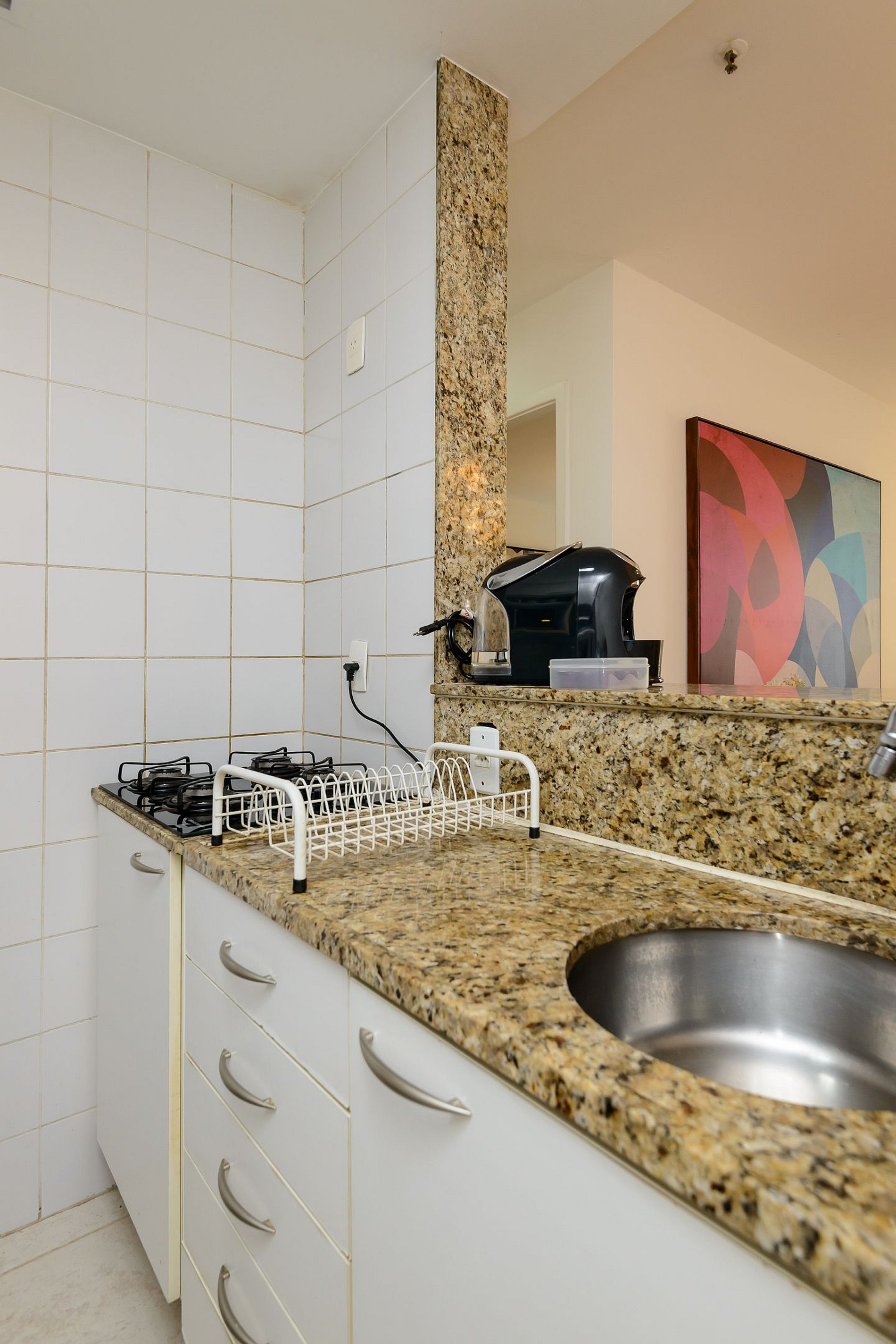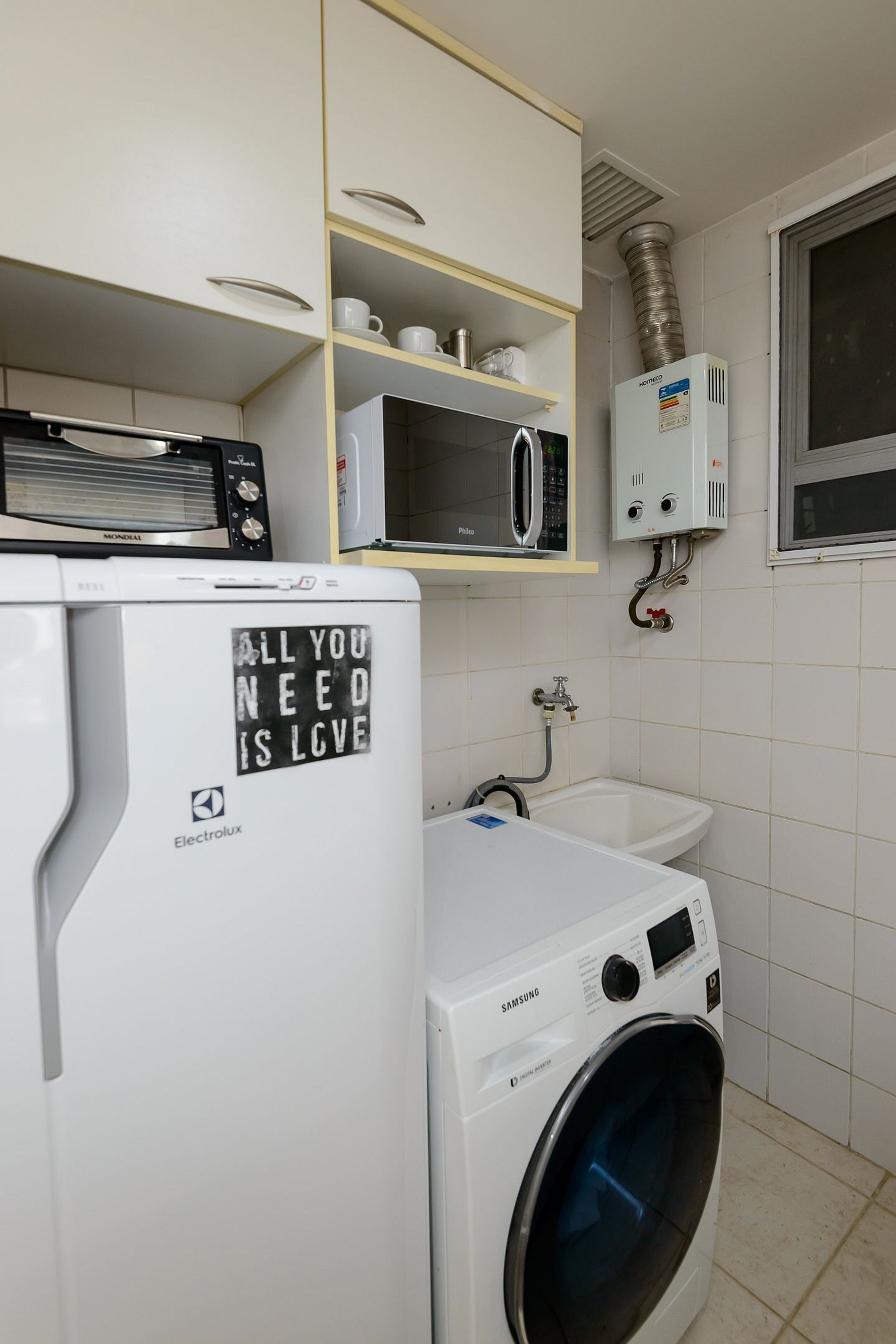 A cozinha é totalmente equipada com micro-ondas, fogão com forno, utensílios, geladeira, lava e seca, cafeteira elétrica, sanduicheira pia e bancada em granito.