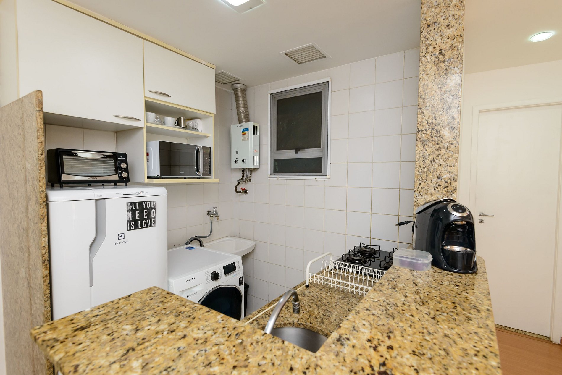 A cozinha é totalmente equipada com micro-ondas, fogão com forno, utensílios, geladeira, lava e seca, cafeteira elétrica, sanduicheira pia e bancada em granito.