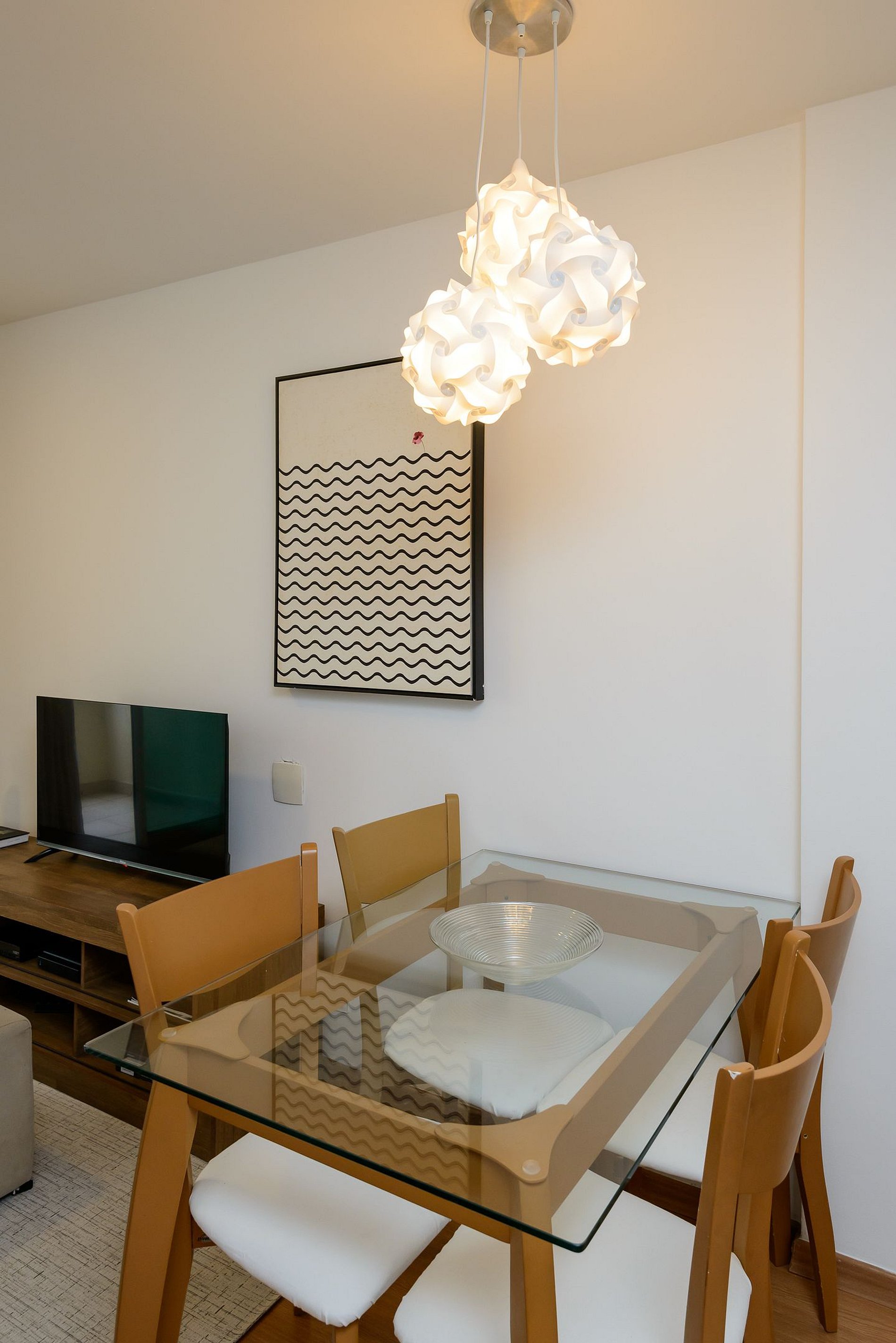 A sala é ampla, climatizada e decorada com obras vibrantes, sofá confortável, TV e mesa de jantar em vidro. A varanda traz luz natural e ventilação.