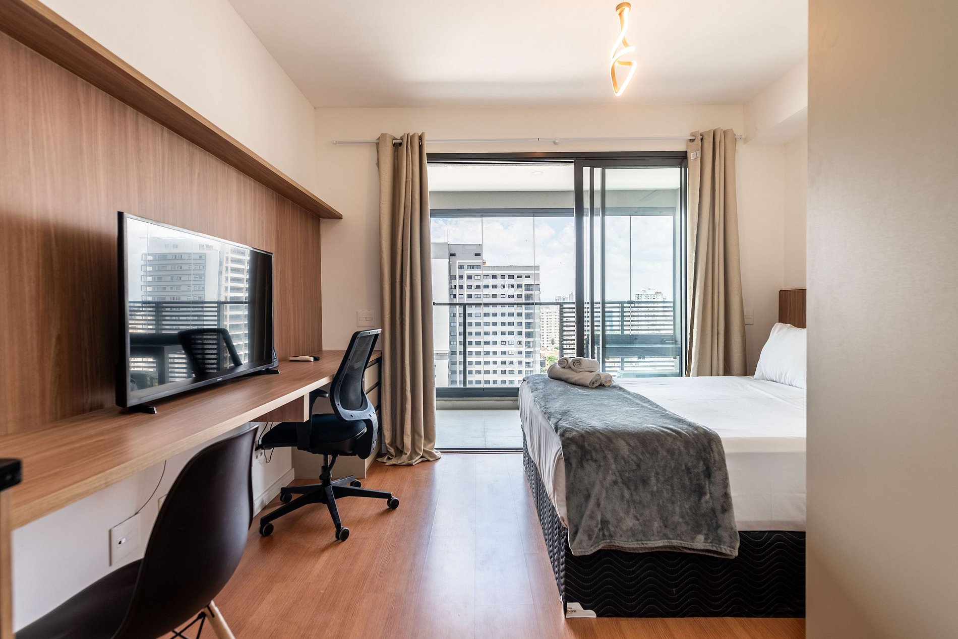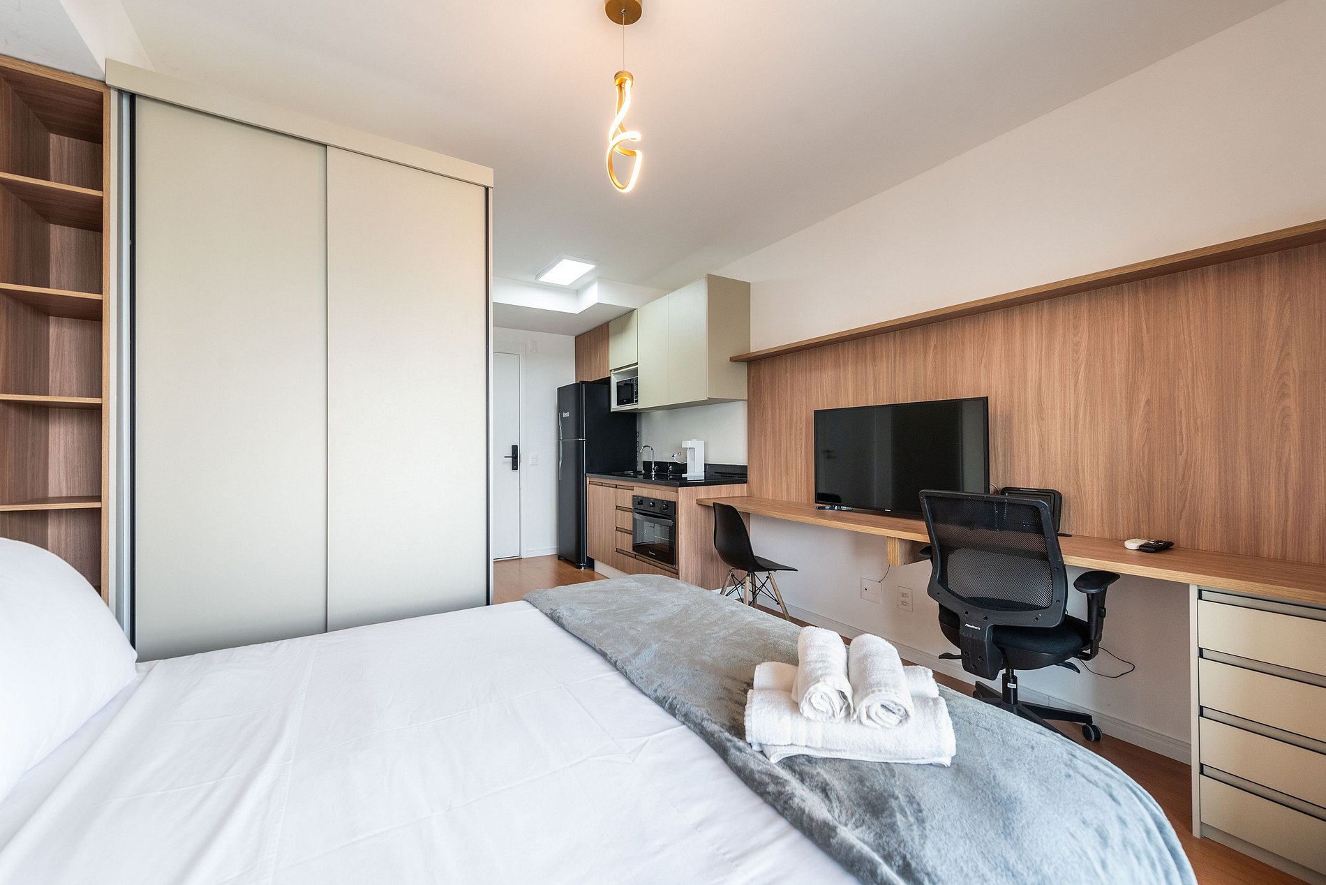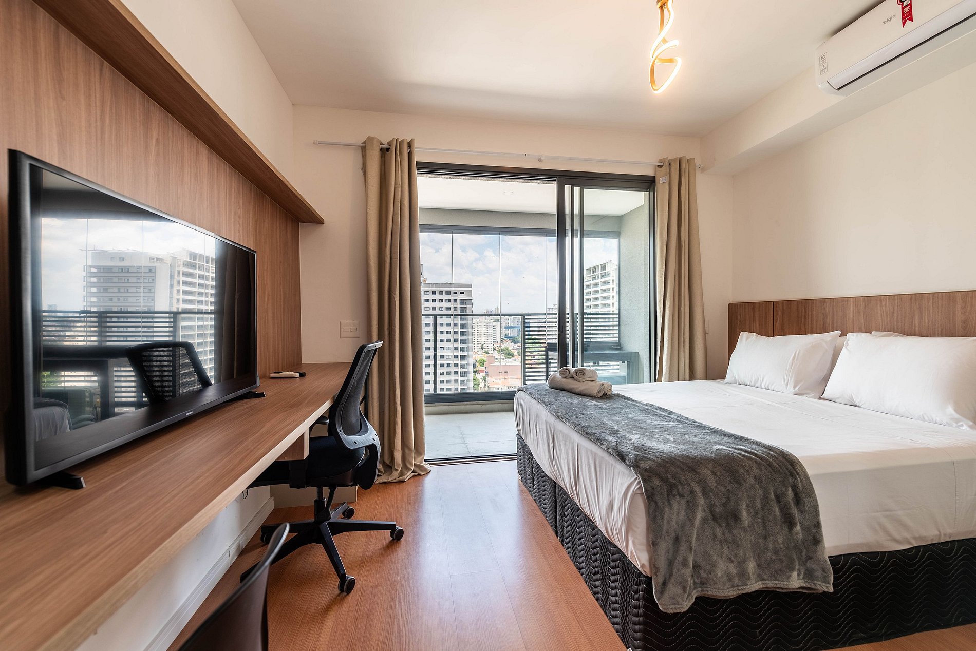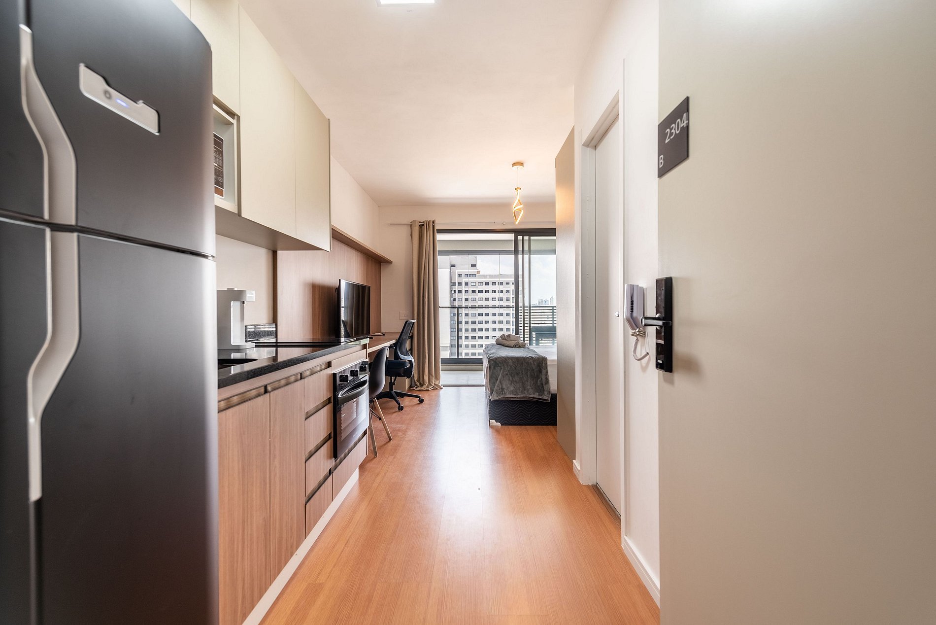 Este studio foi pensado para oferecer conforto, praticidade e uma experiência premium. A cozinha conta com geladeira grande, cooktop, micro-ondas e utensílios completos para preparar refeições. O ambiente possui uma cama queen size com enxoval de qualidade, TV grande com ótima iluminação e uma área de trabalho funcional. A varanda envidraçada com vista panorâmica da cidade traz um charme especial ao espaço, perfeita para relaxar ou trabalhar aproveitando a luz natural. O prédio é moderno, elegante e oferece comodidades de alto padrão: Piscina na cobertura com vista 360°, academia completa, coworking equipado, bicicletário, áreas comuns amplas e bem cuidadas. É a escolha ideal para quem busca praticidade, qualidade e boa localização.