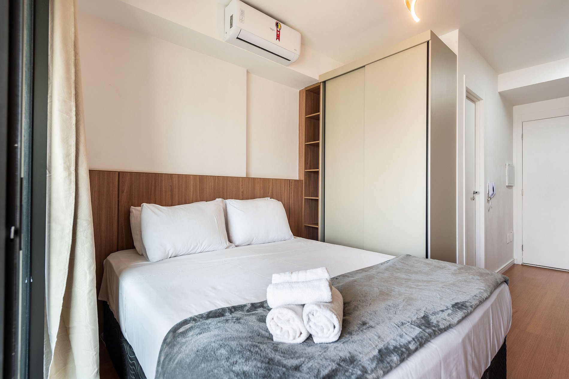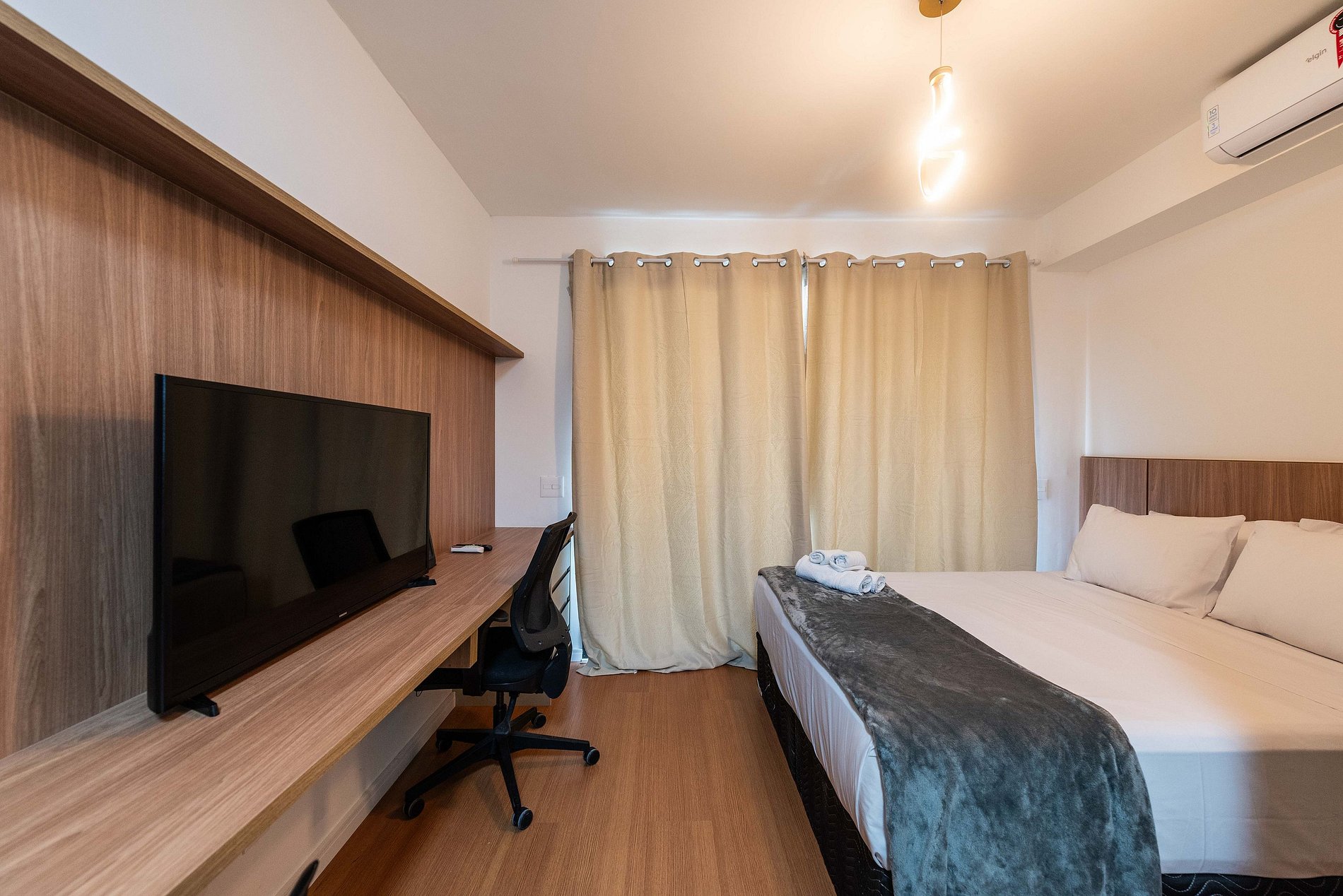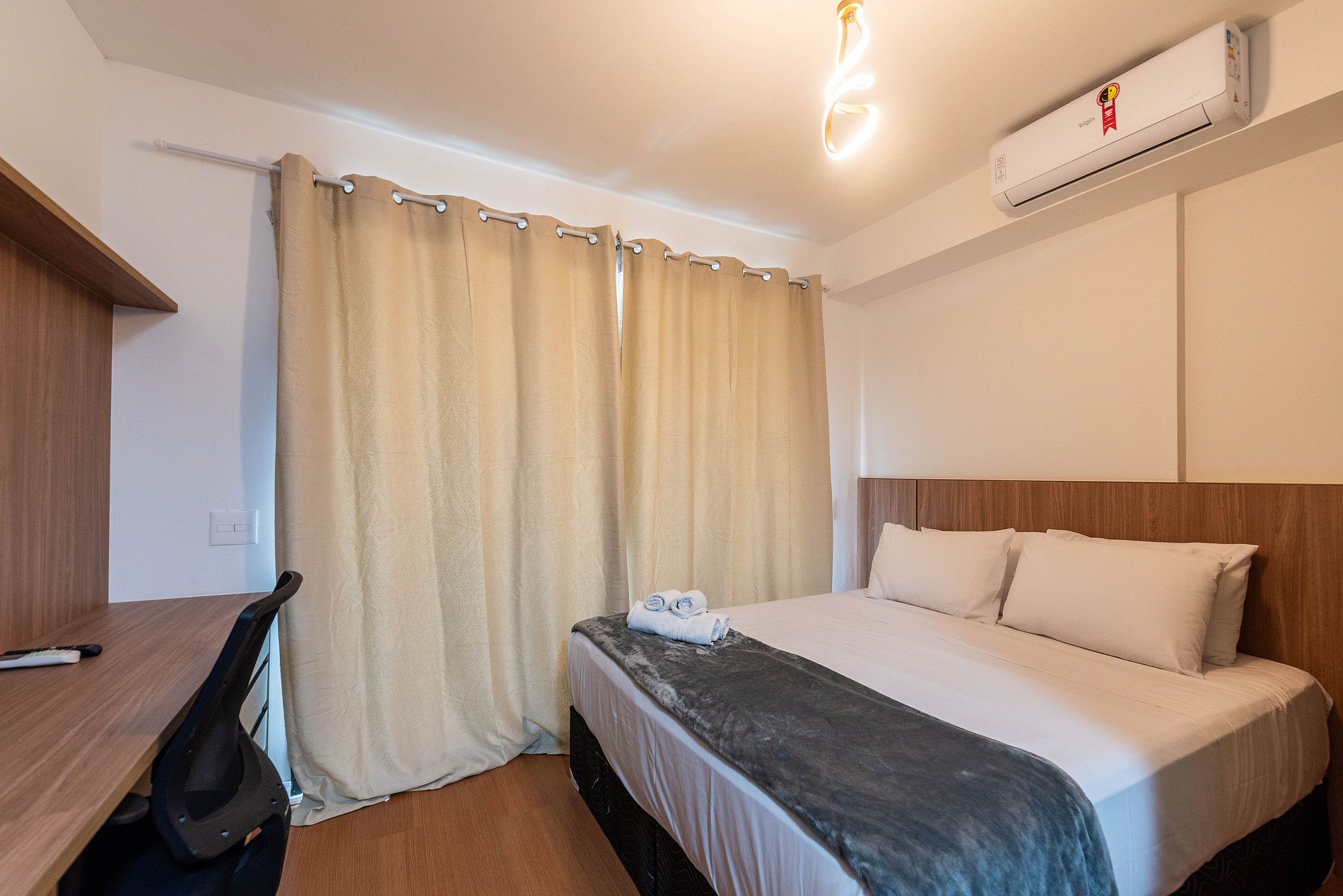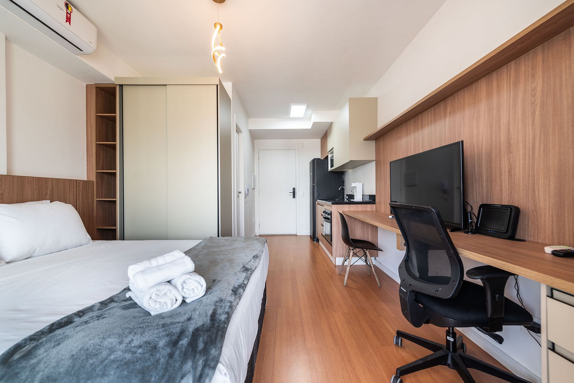 Este studio foi pensado para oferecer conforto, praticidade e uma experiência premium. A cozinha conta com geladeira grande, cooktop, micro-ondas e utensílios completos para preparar refeições. O ambiente possui uma cama queen size com enxoval de qualidade, TV grande com ótima iluminação e uma área de trabalho funcional. A varanda envidraçada com vista panorâmica da cidade traz um charme especial ao espaço, perfeita para relaxar ou trabalhar aproveitando a luz natural. O prédio é moderno, elegante e oferece comodidades de alto padrão: Piscina na cobertura com vista 360°, academia completa, coworking equipado, bicicletário, áreas comuns amplas e bem cuidadas. É a escolha ideal para quem busca praticidade, qualidade e boa localização.