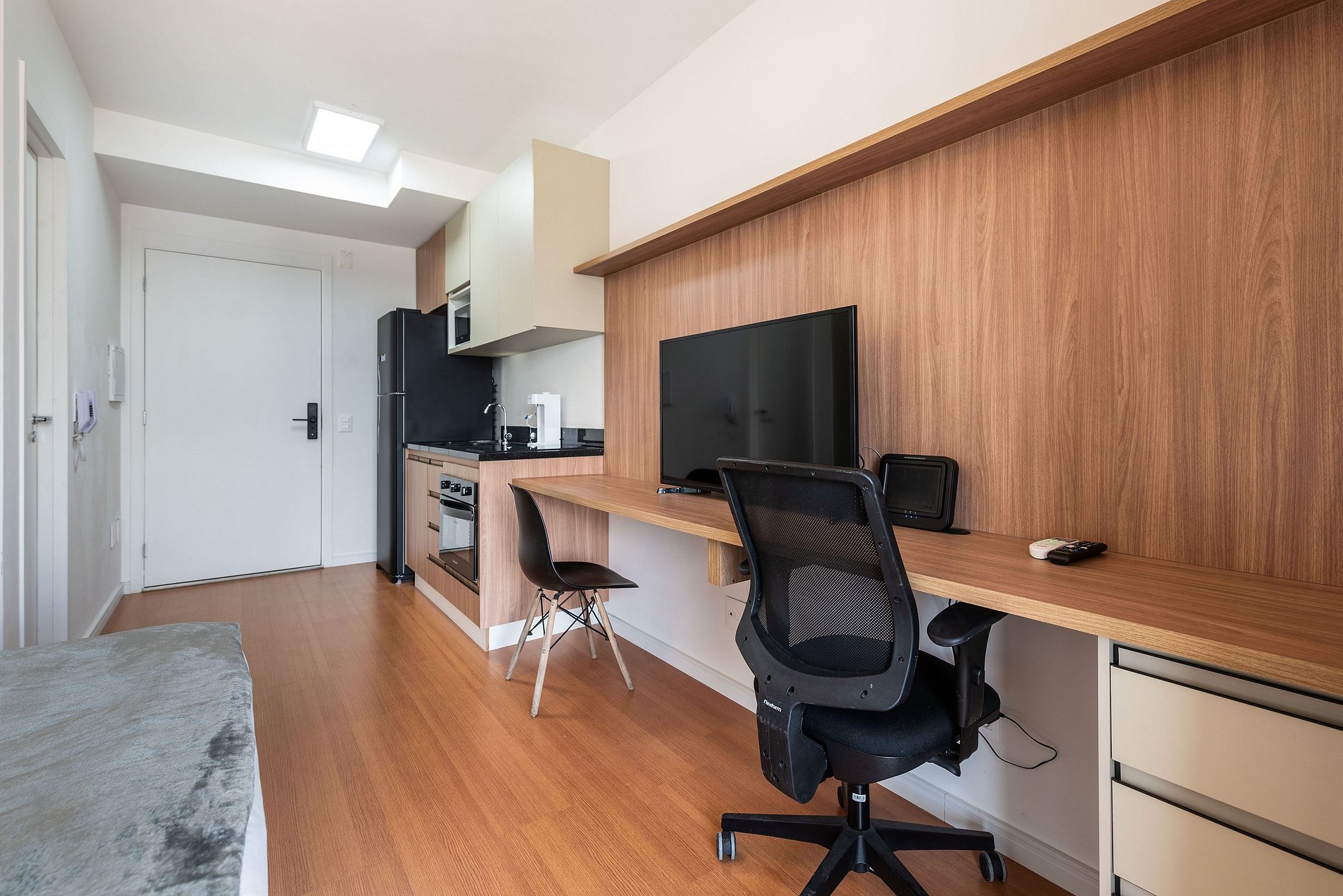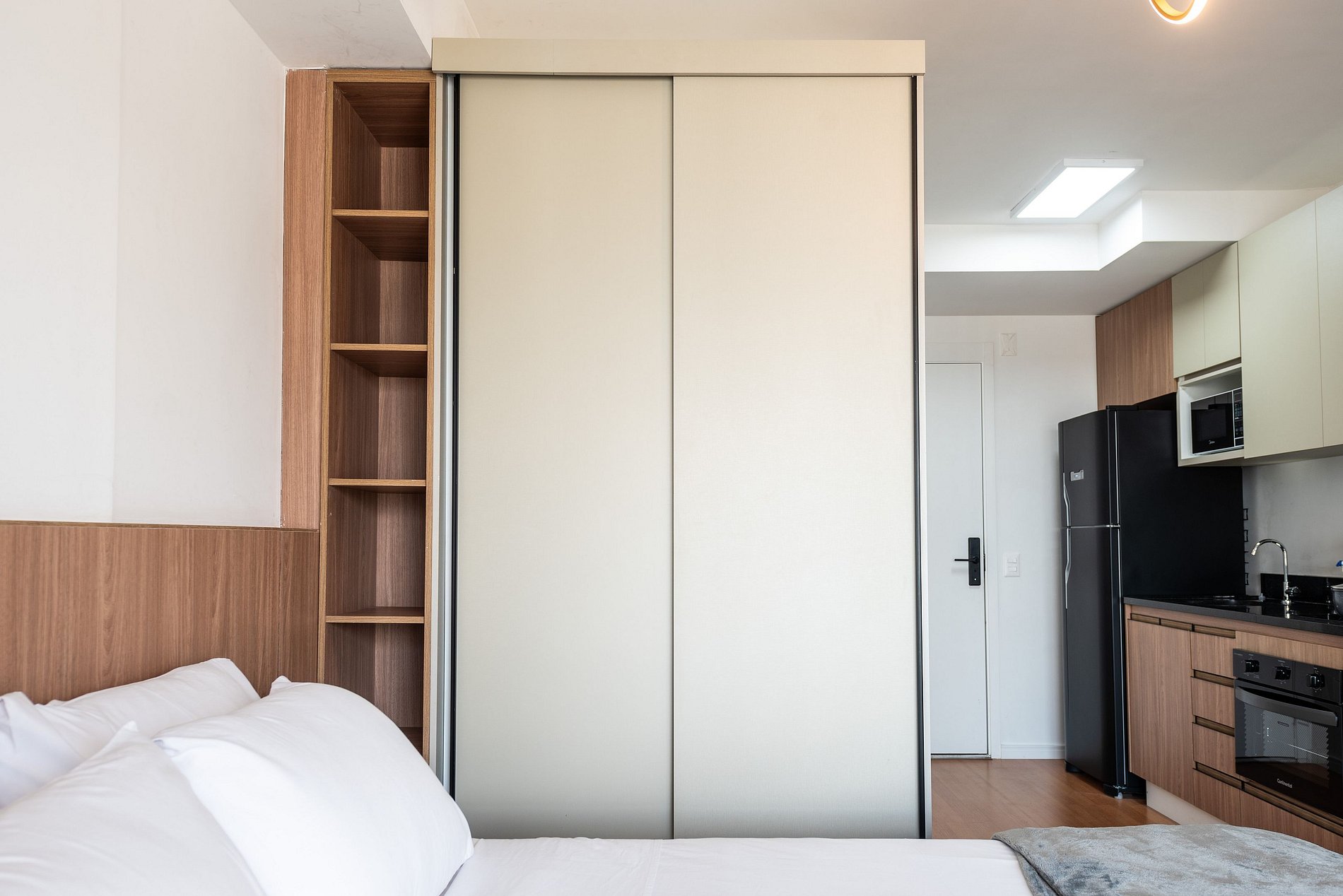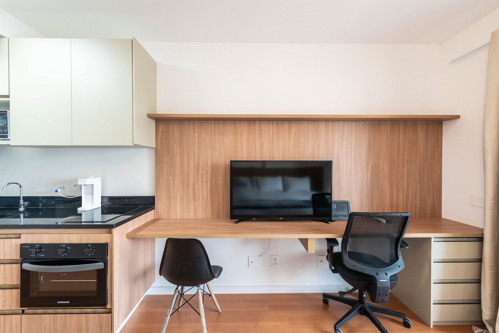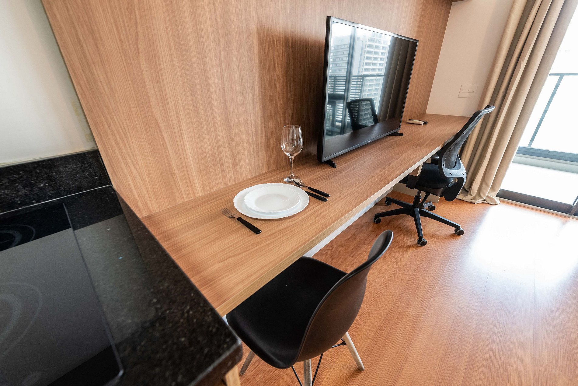 Este studio foi pensado para oferecer conforto, praticidade e uma experiência premium. A cozinha conta com geladeira grande, cooktop, micro-ondas e utensílios completos para preparar refeições. O ambiente possui uma cama queen size com enxoval de qualidade, TV grande com ótima iluminação e uma área de trabalho funcional. A varanda envidraçada com vista panorâmica da cidade traz um charme especial ao espaço, perfeita para relaxar ou trabalhar aproveitando a luz natural. O prédio é moderno, elegante e oferece comodidades de alto padrão: Piscina na cobertura com vista 360°, academia completa, coworking equipado, bicicletário, áreas comuns amplas e bem cuidadas. É a escolha ideal para quem busca praticidade, qualidade e boa localização.
