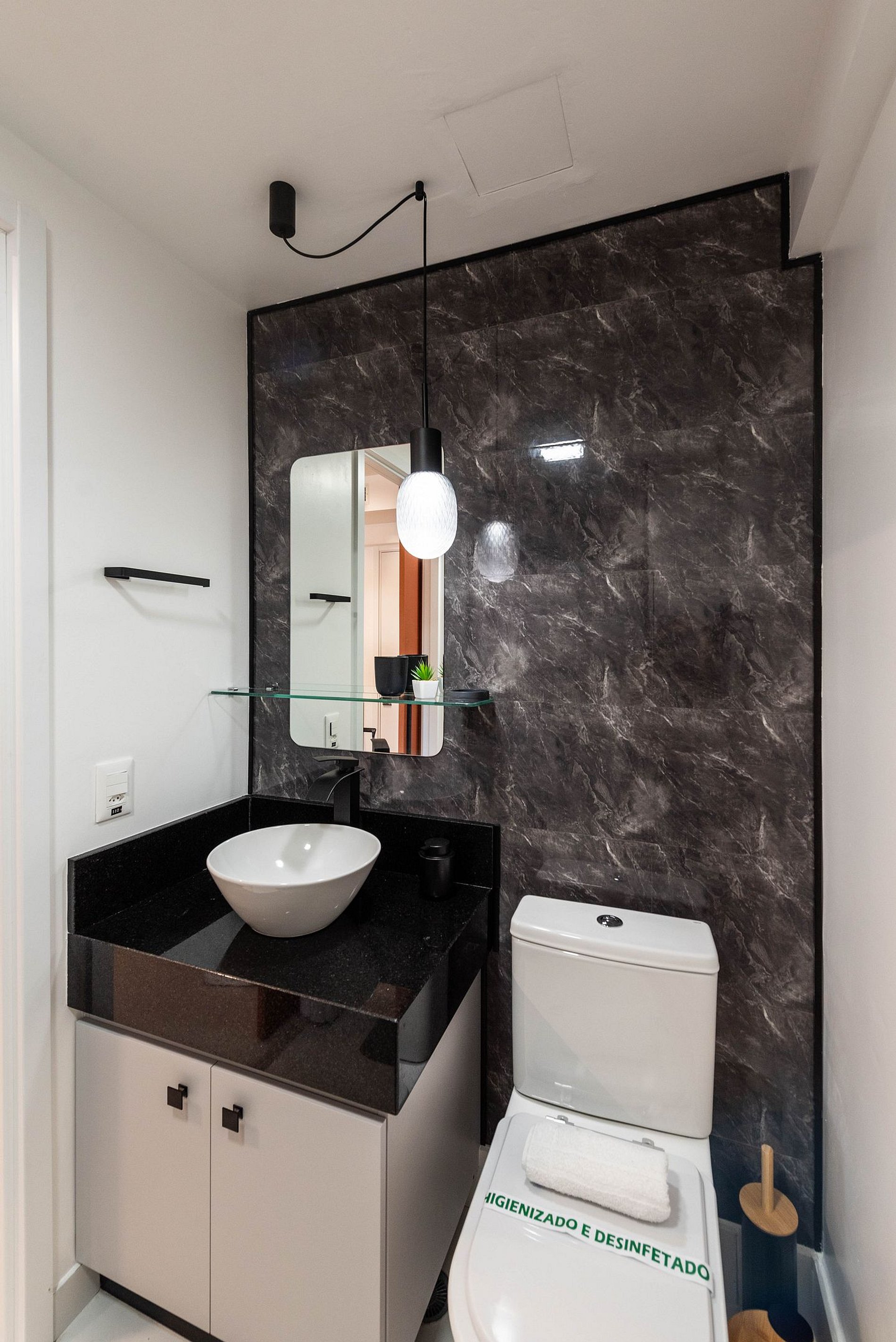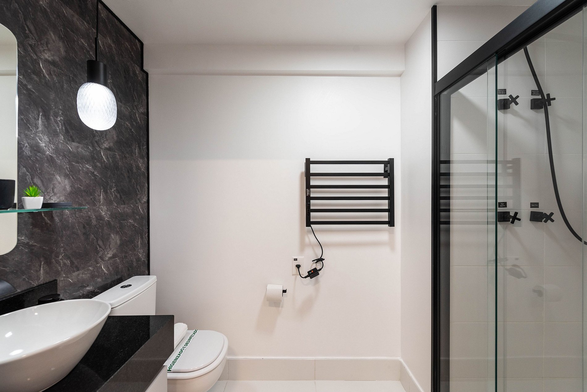 Banheiro: Acabamento em pedra escura, cuba de sobrepor e iluminação pendente e toalheiro elétrico, proporcionando uma experiência de spa.