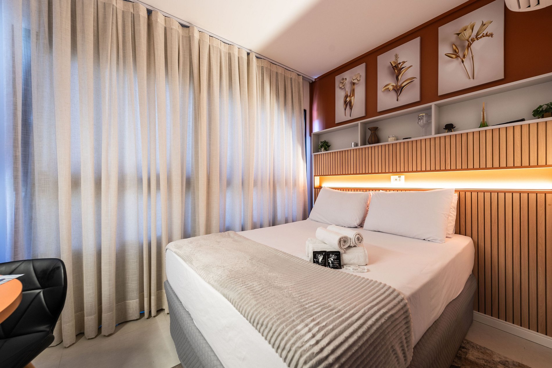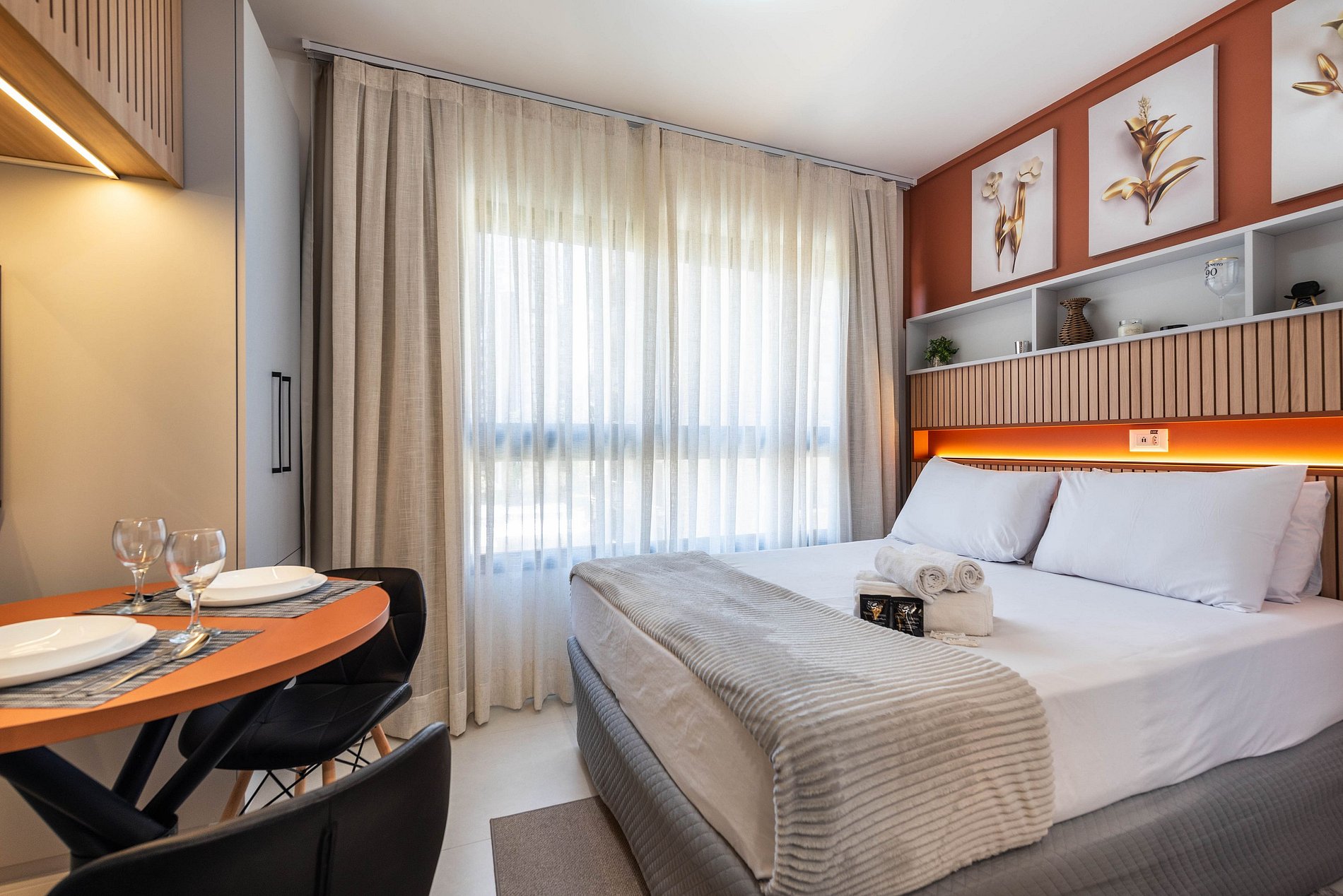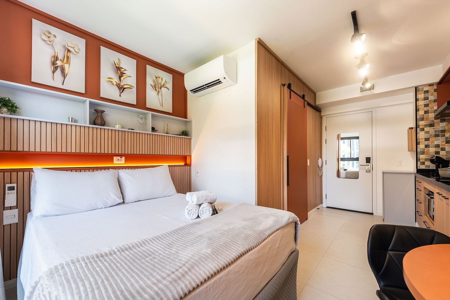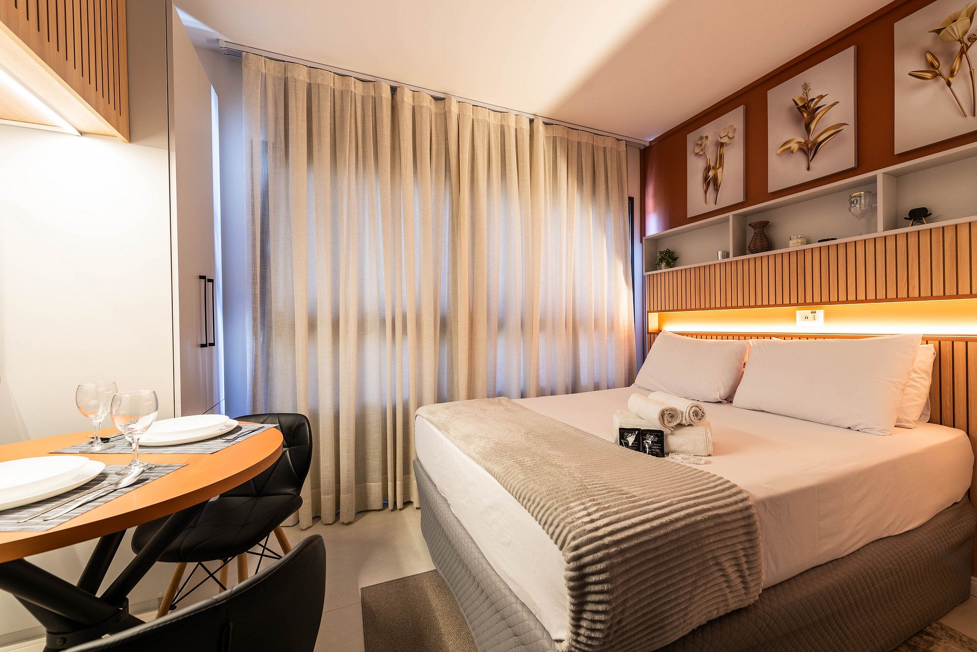 Design & Conforto: O ambiente integra quarto e sala com marcenaria planejada, painel ripado e iluminação em trilho, criando uma atmosfera acolhedora e moderna. A cama Queen Size possui enxoval de alta qualidade para garantir noites de sono reparadoras.