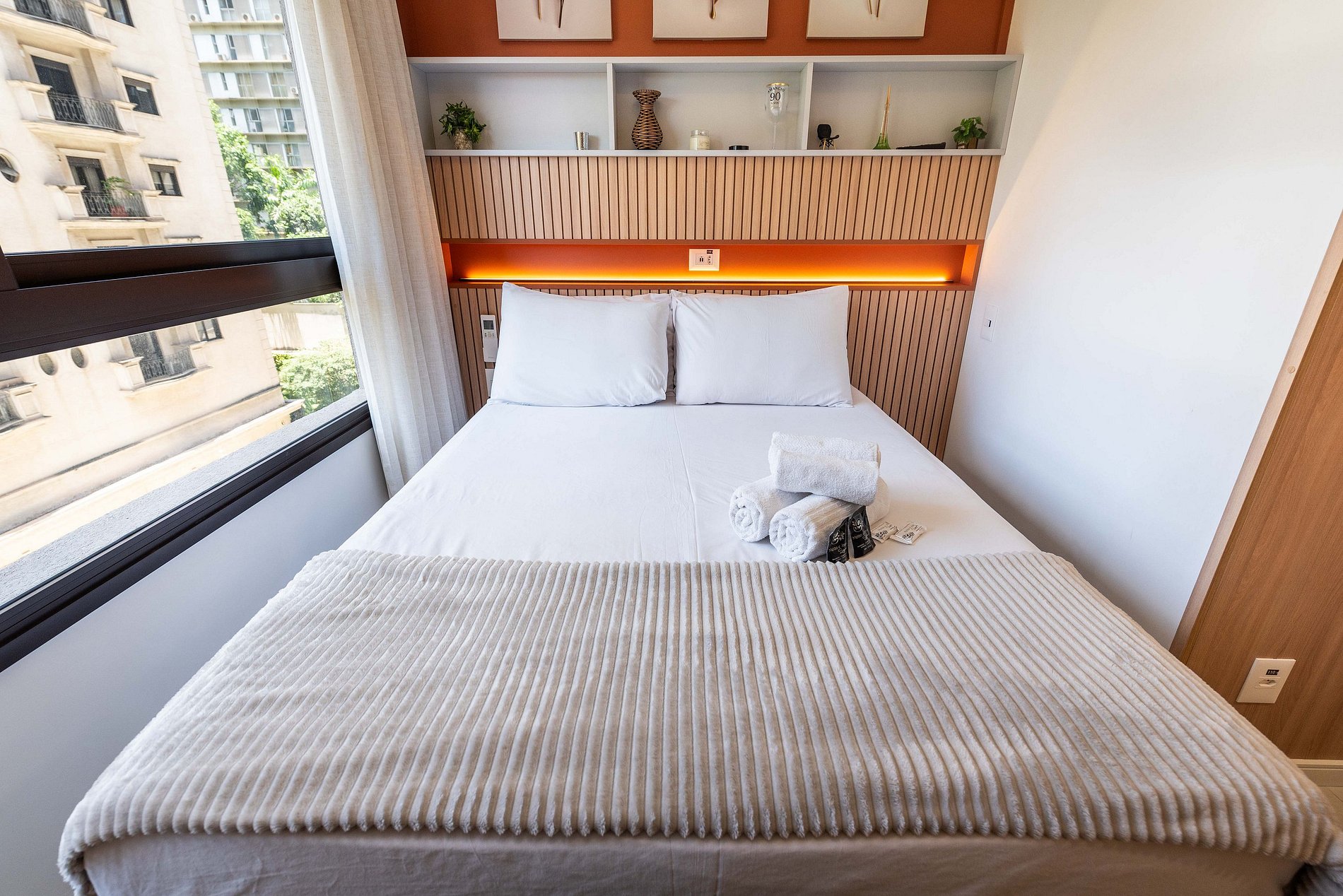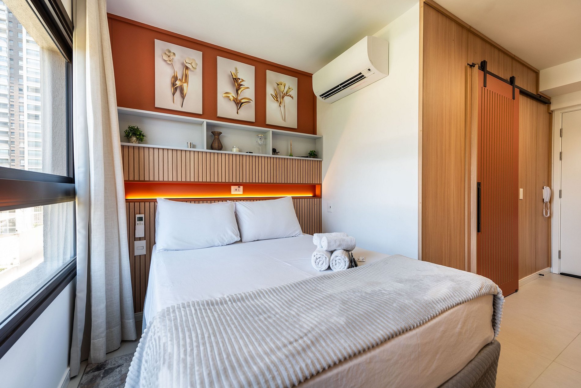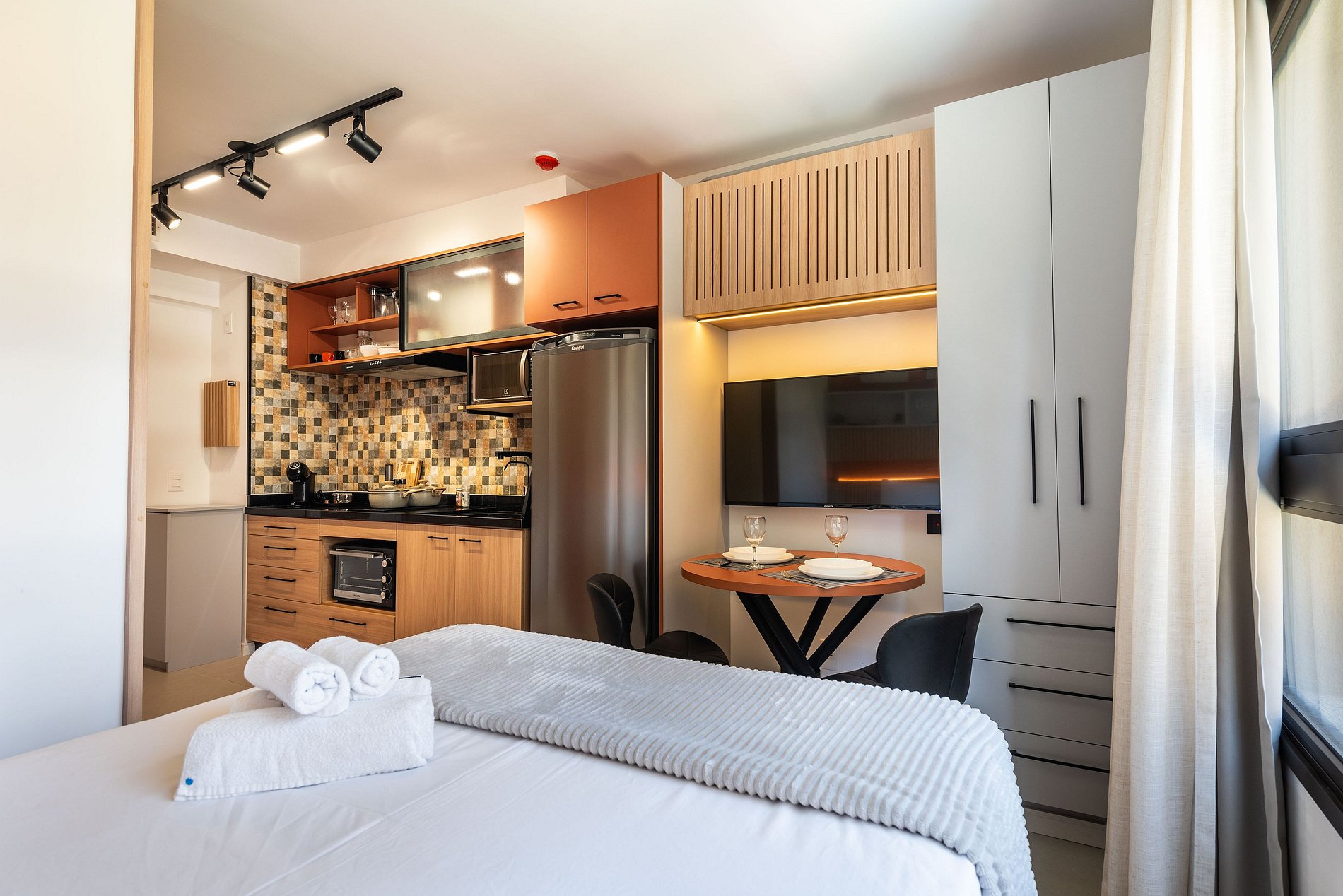 Design & Conforto: O ambiente integra quarto e sala com marcenaria planejada, painel ripado e iluminação em trilho, criando uma atmosfera acolhedora e moderna. A cama Queen Size possui enxoval de alta qualidade para garantir noites de sono reparadoras.