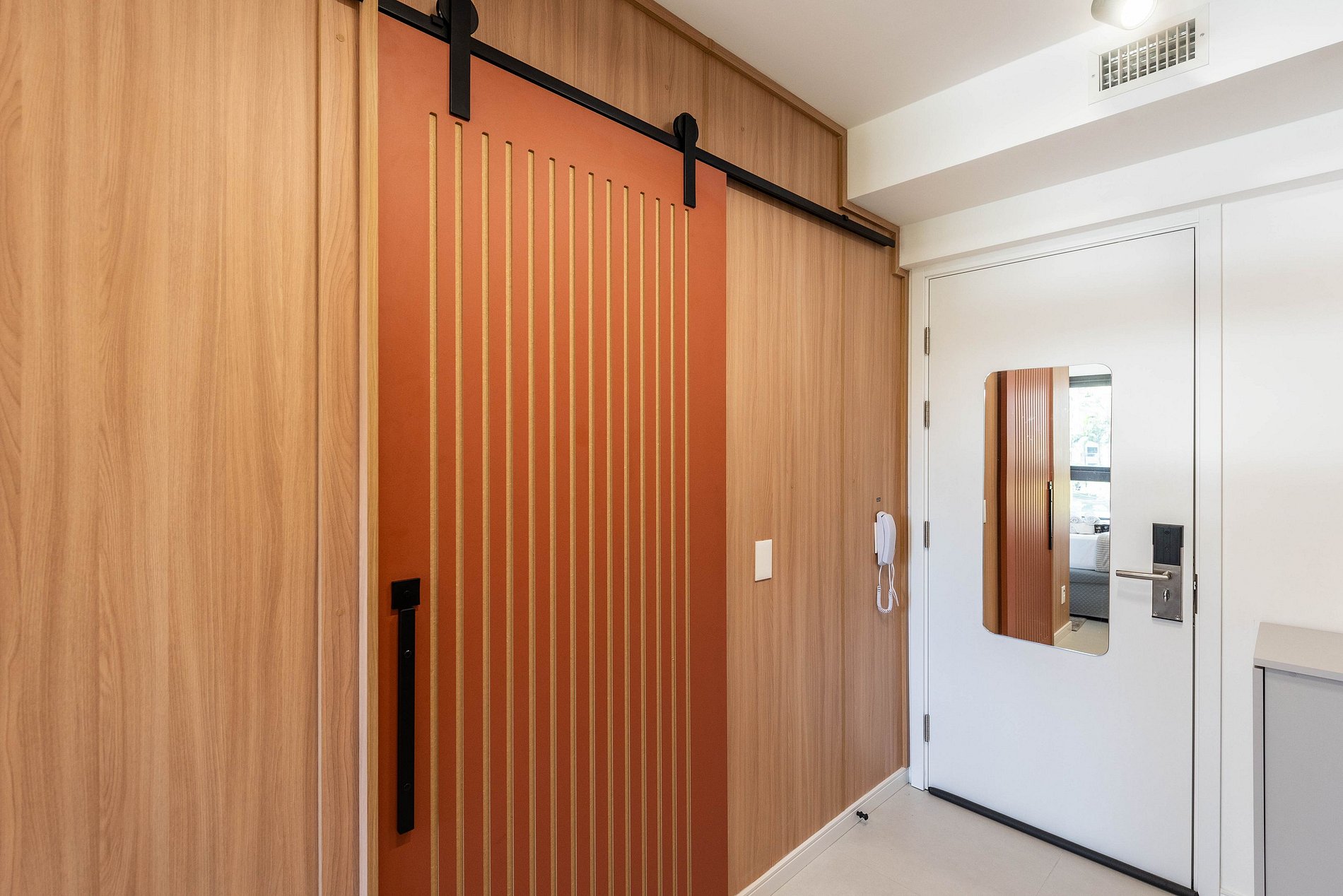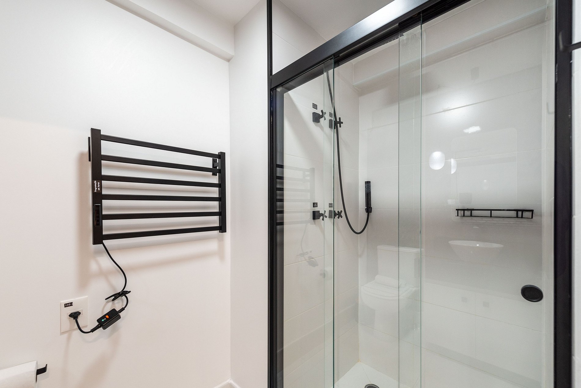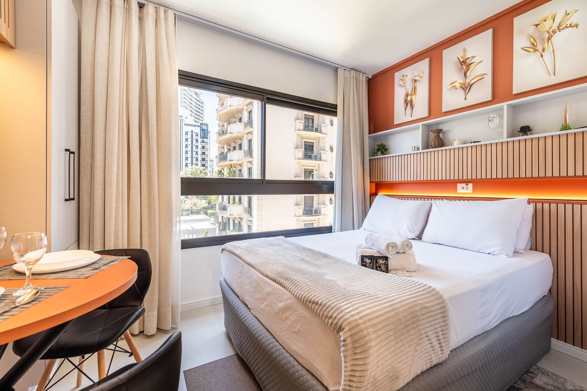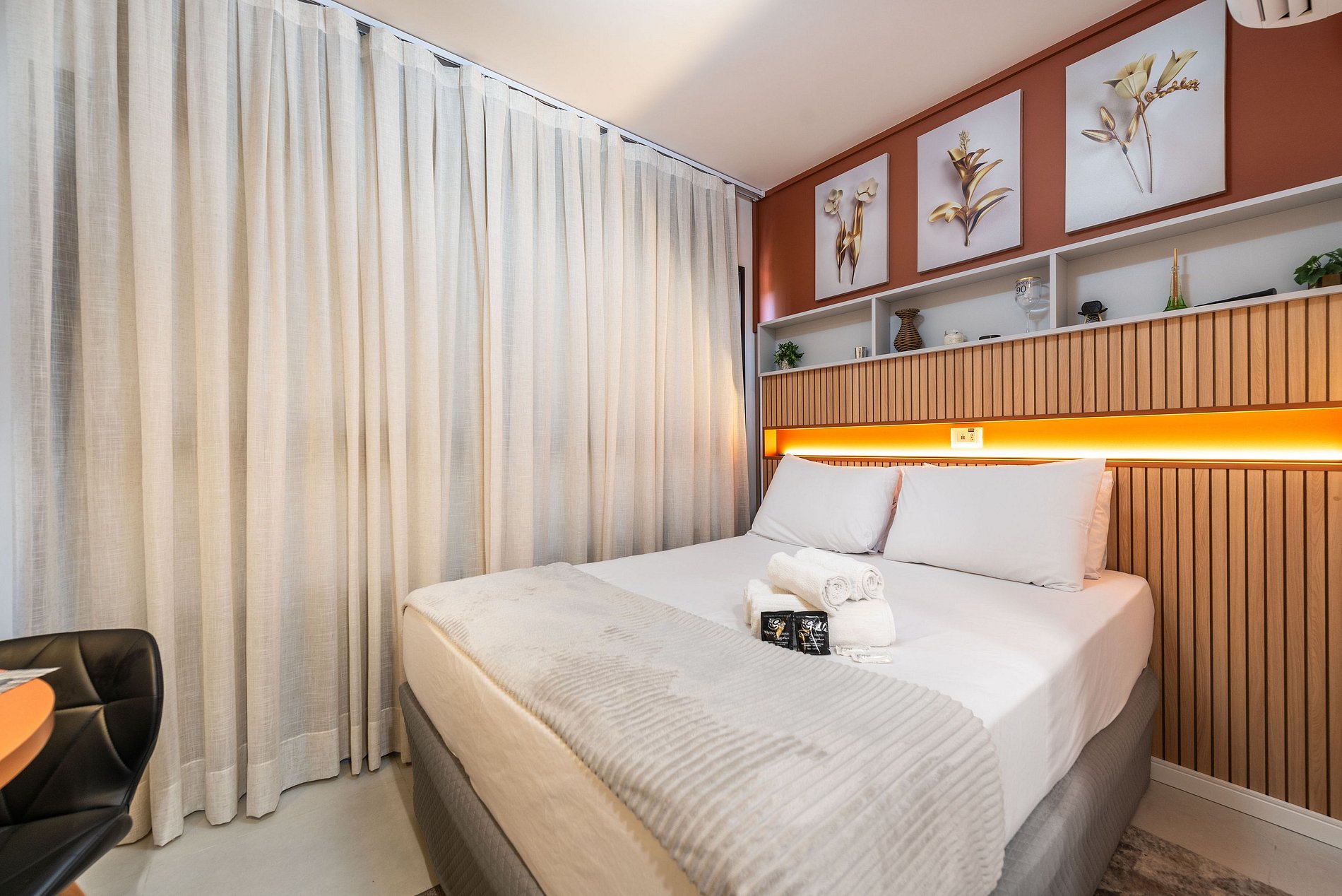 Design & Conforto: O ambiente integra quarto e sala com marcenaria planejada, painel ripado e iluminação em trilho, criando uma atmosfera acolhedora e moderna. A cama Queen Size possui enxoval de alta qualidade para garantir noites de sono reparadoras.