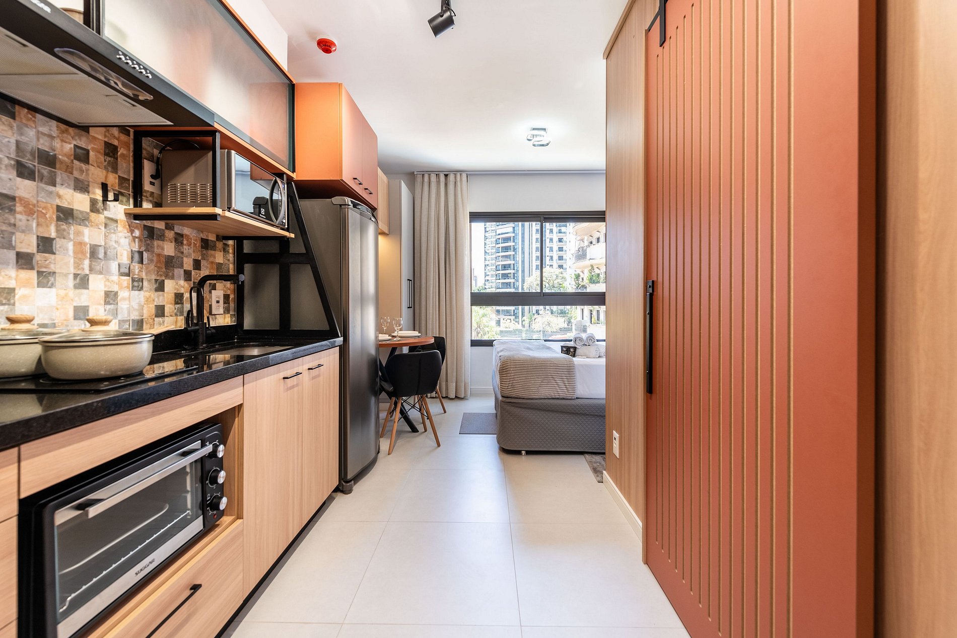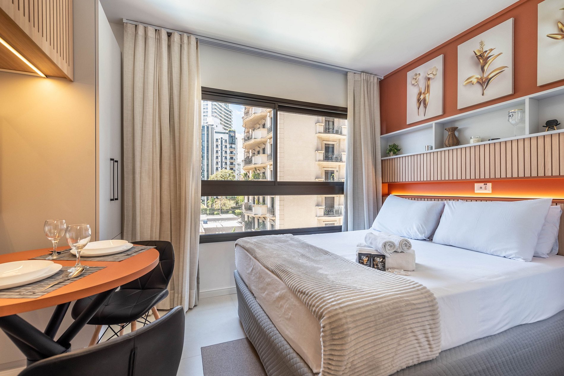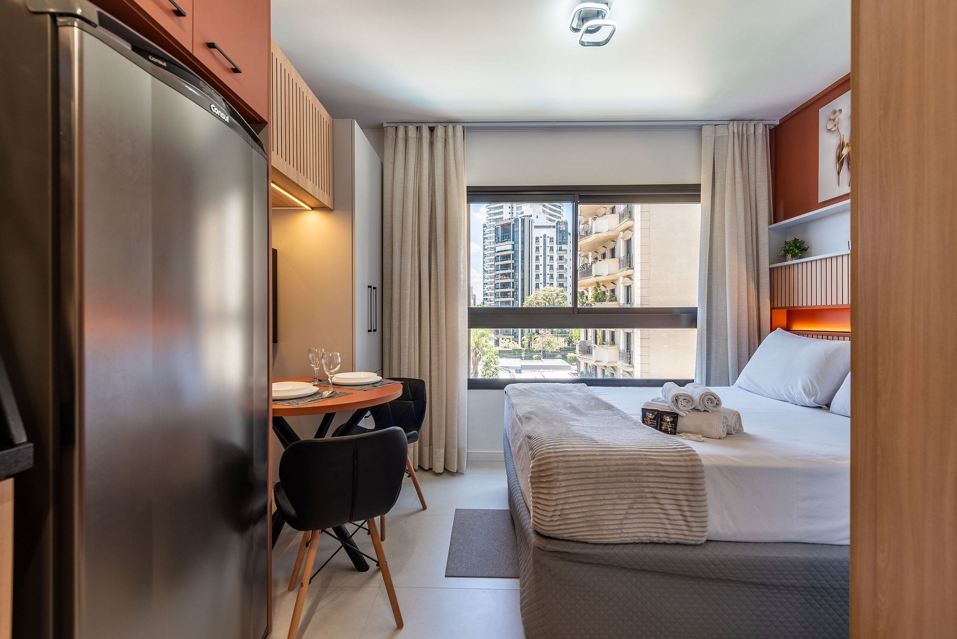 Hospede-se com estilo neste studio recém-reformado na Av. Agami, no coração de Moema. Decoração moderna em tons terracota, cama queen confortável, cozinha completa com cafeteira e banheiro com toalheiro elétrico. Ideal para executivos ou casais, o espaço oferece Wi-Fi rápido e Smart TV. Localização imbatível: caminhe até restaurantes renomados, esteja a 5 min do Aeroporto de Congonhas e próximo ao Parque Ibirapuera. Prédio seguro e moderno.