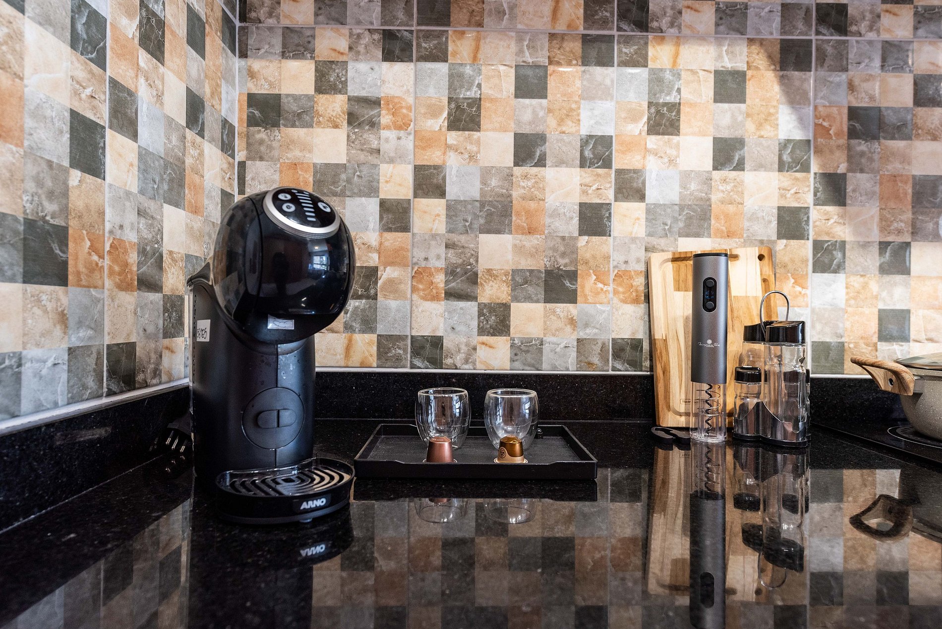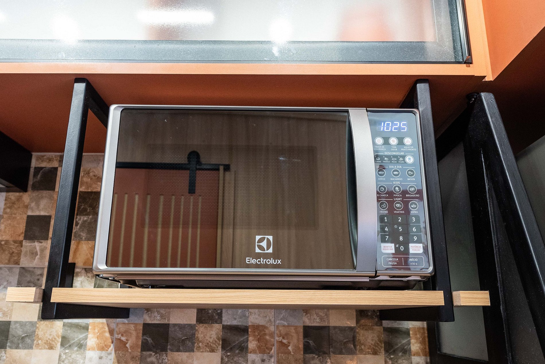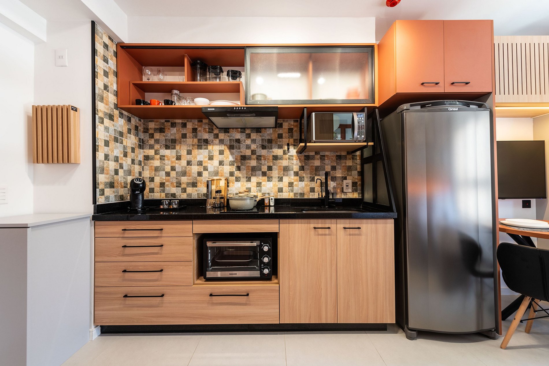 Cozinha Gourmet Compacta: Totalmente equipada para estadias curtas ou longas. Conta com geladeira duplex inox, cooktop elétrico, forno elétrico, micro-ondas, sanduicheira e, claro, uma cafeteira elétrica para começar bem o dia.