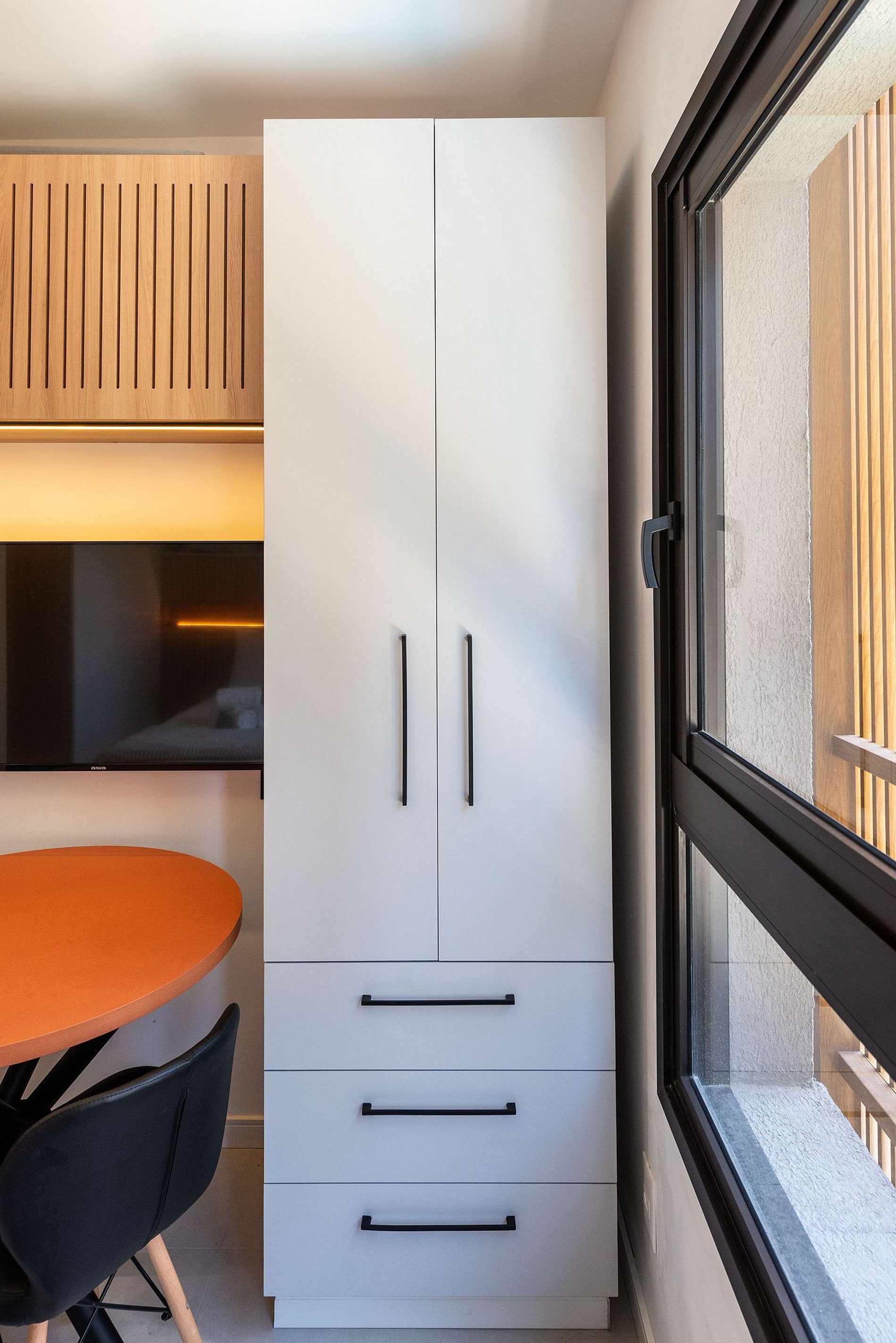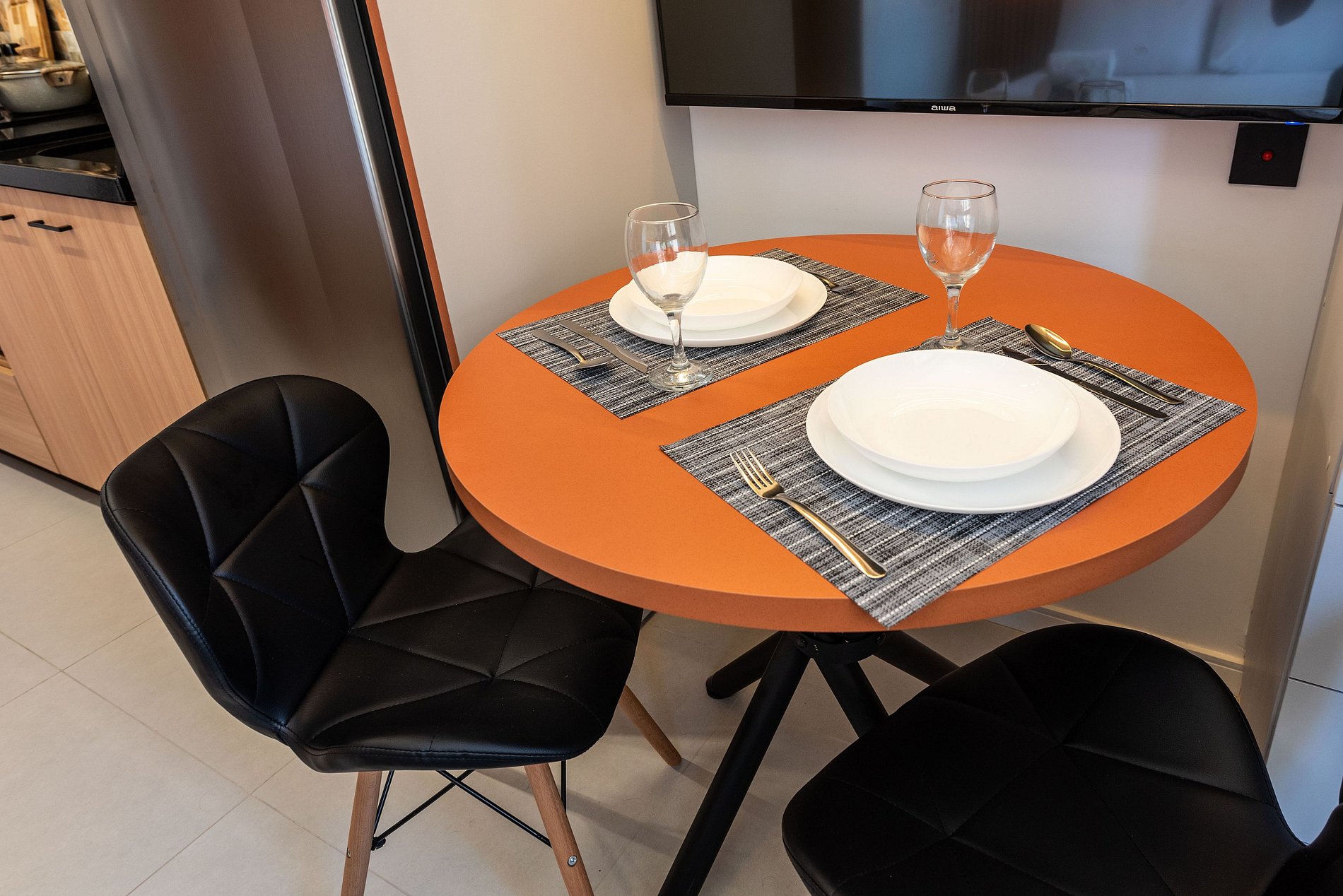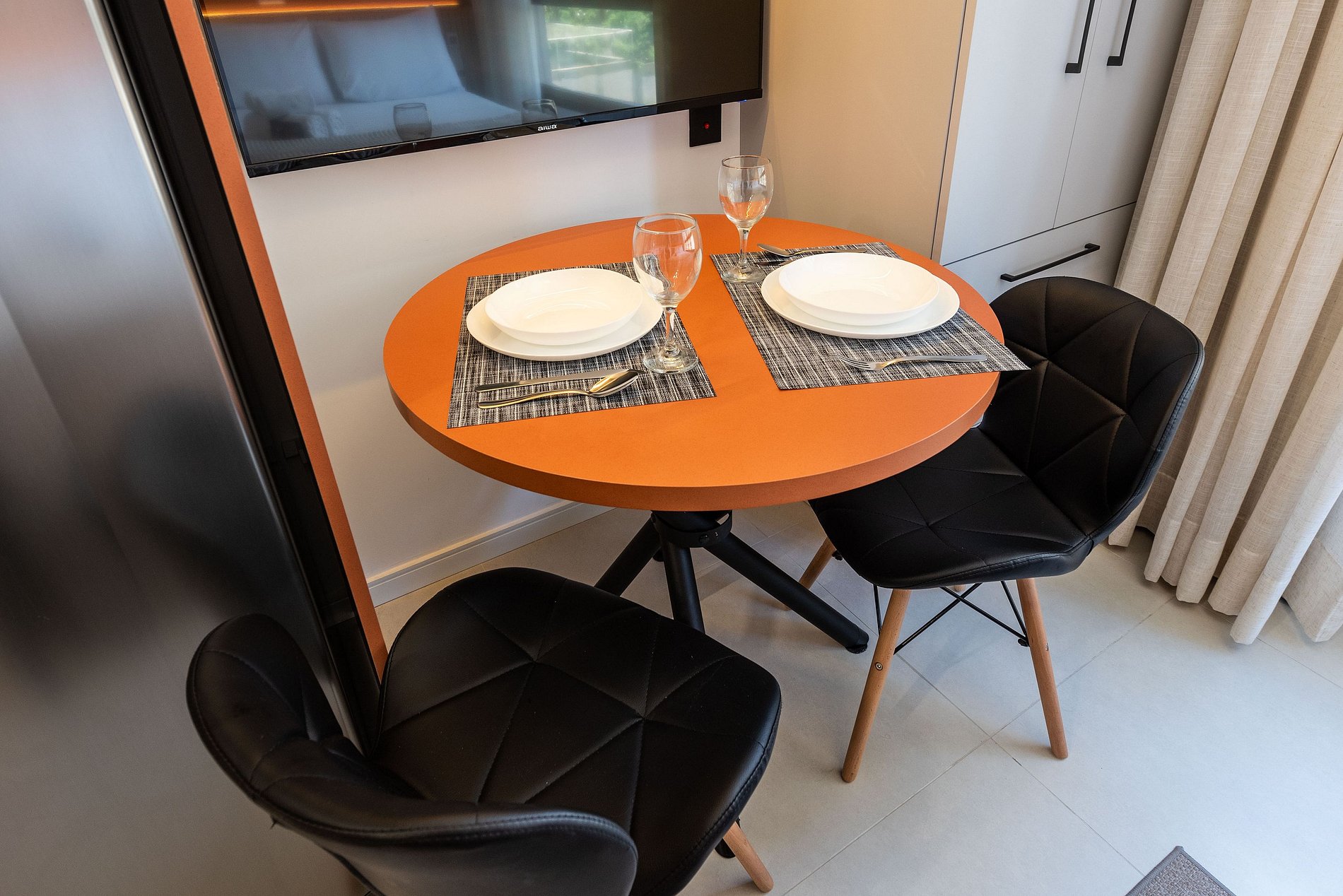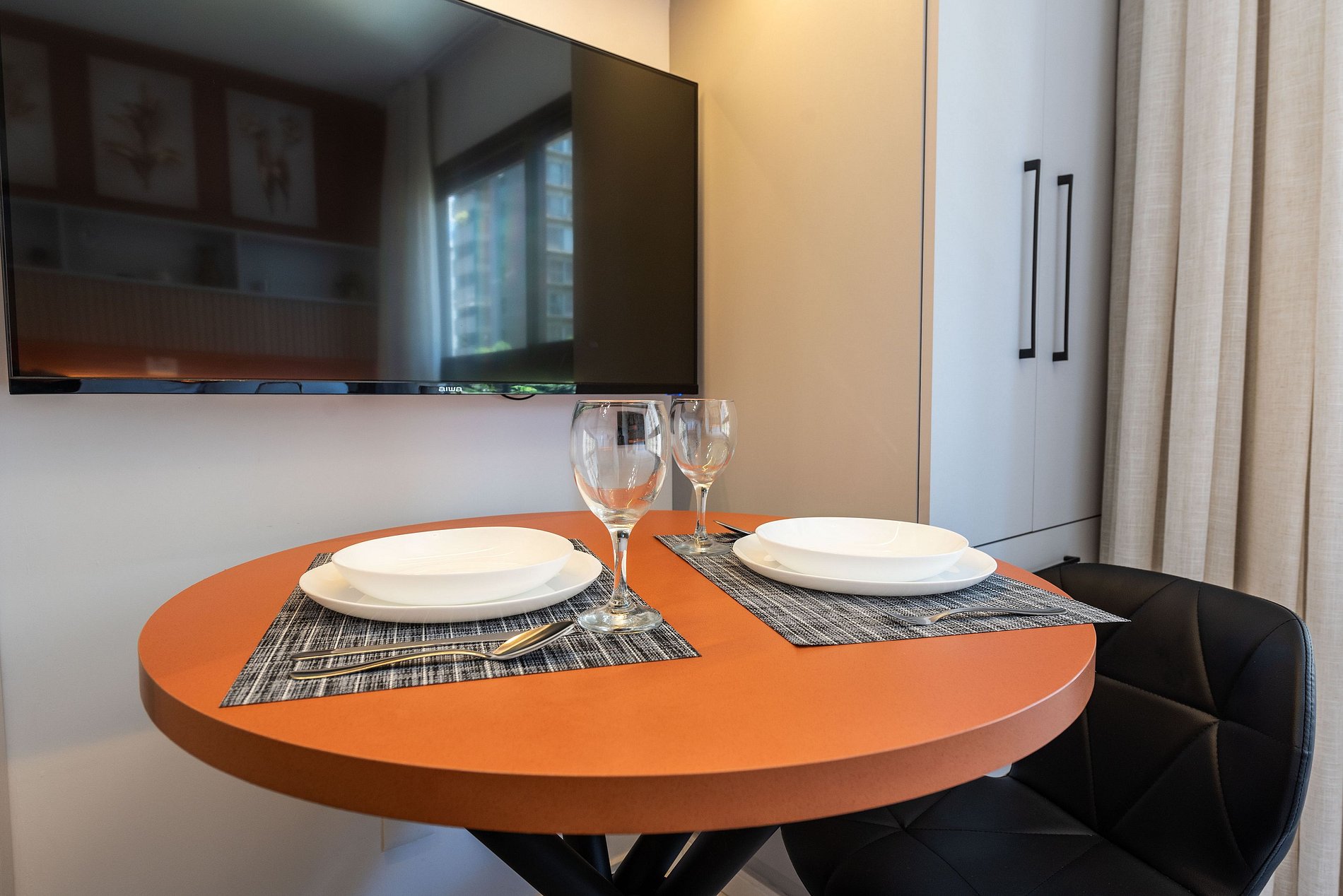 Home Office & Jantar: Uma mesa redonda charmosa serve perfeitamente para refeições a dois ou como estação de trabalho, com tomadas próximas.