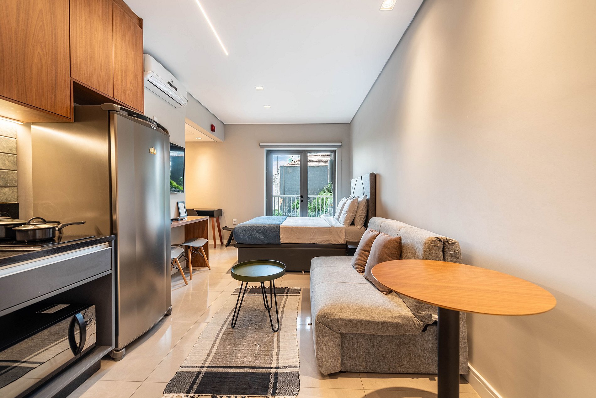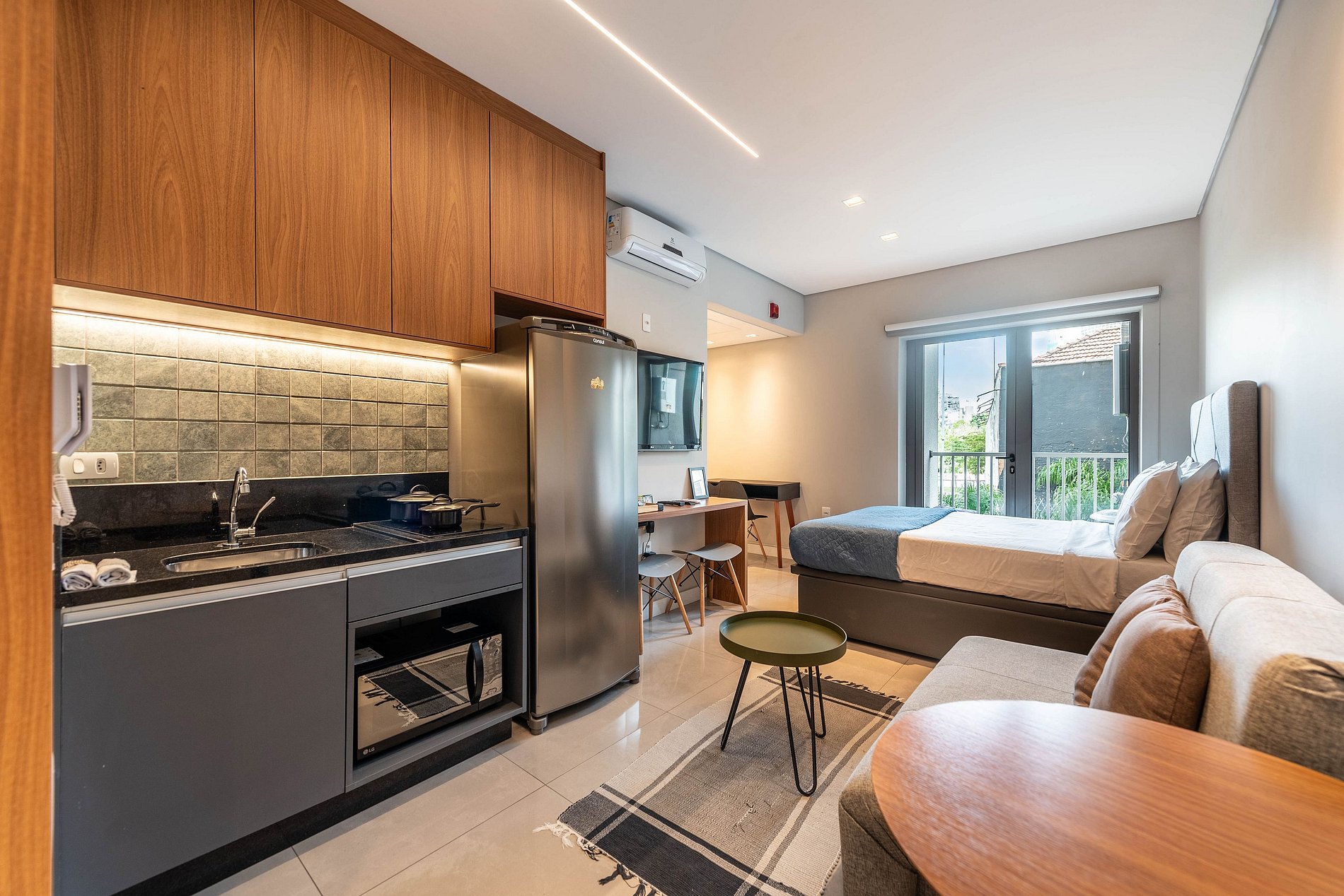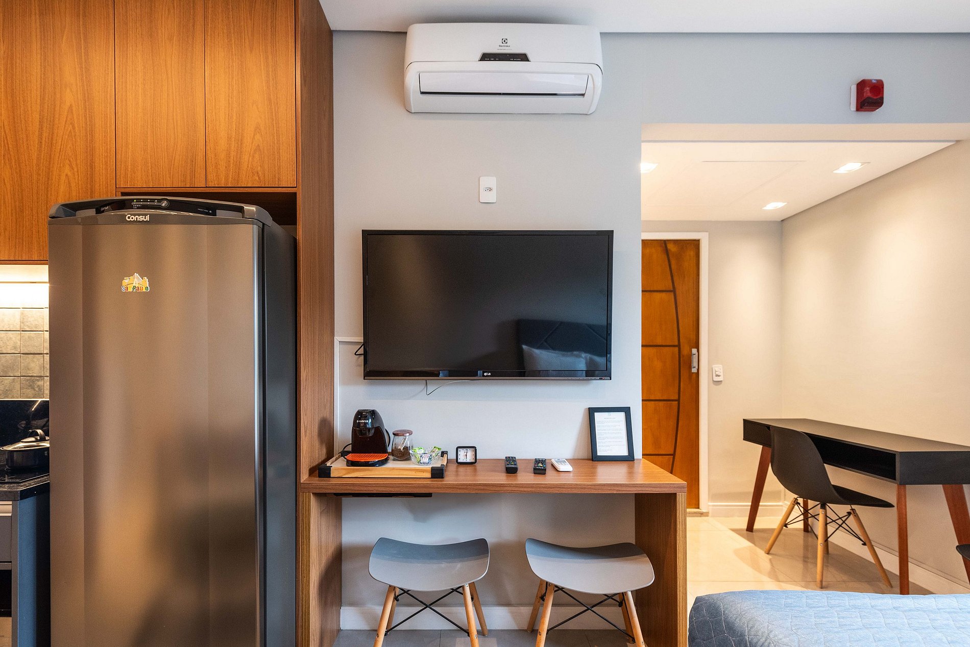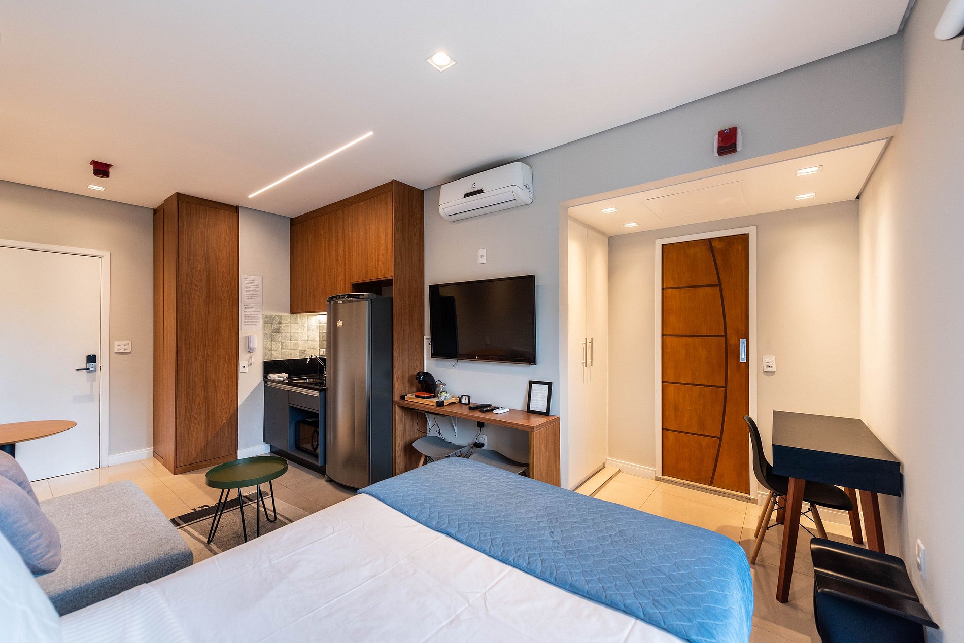 Este studio foi planejado para oferecer conforto e funcionalidade. Conta com cama de casal com enxoval de alto padrão, Smart TV, ar-condicionado, mesa de trabalho com cadeiras, cozinha completa com cooktop, micro-ondas, geladeira grande e utensílios para preparar refeições. O banheiro é moderno, com ducha quente e enxoval macio. O apartamento recebe luz natural e possui uma atmosfera elegante, ideal para estadias curtas ou longas.