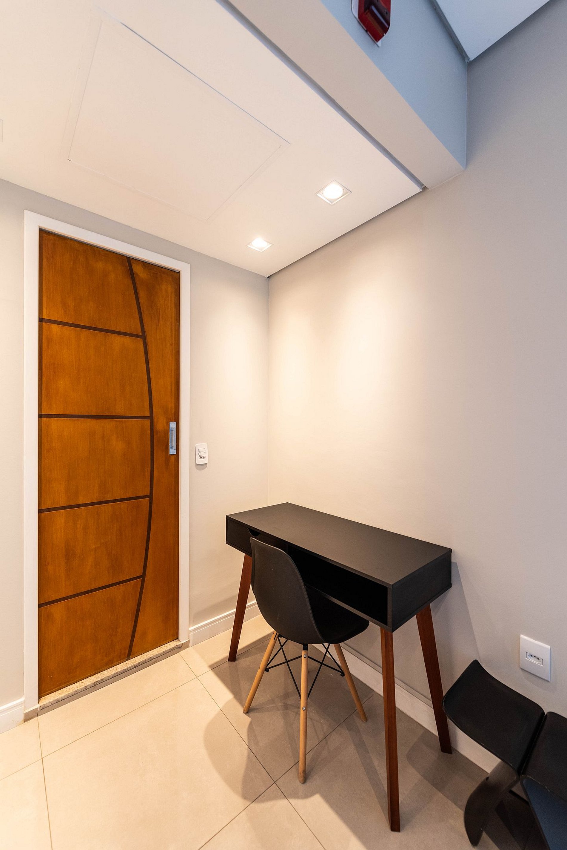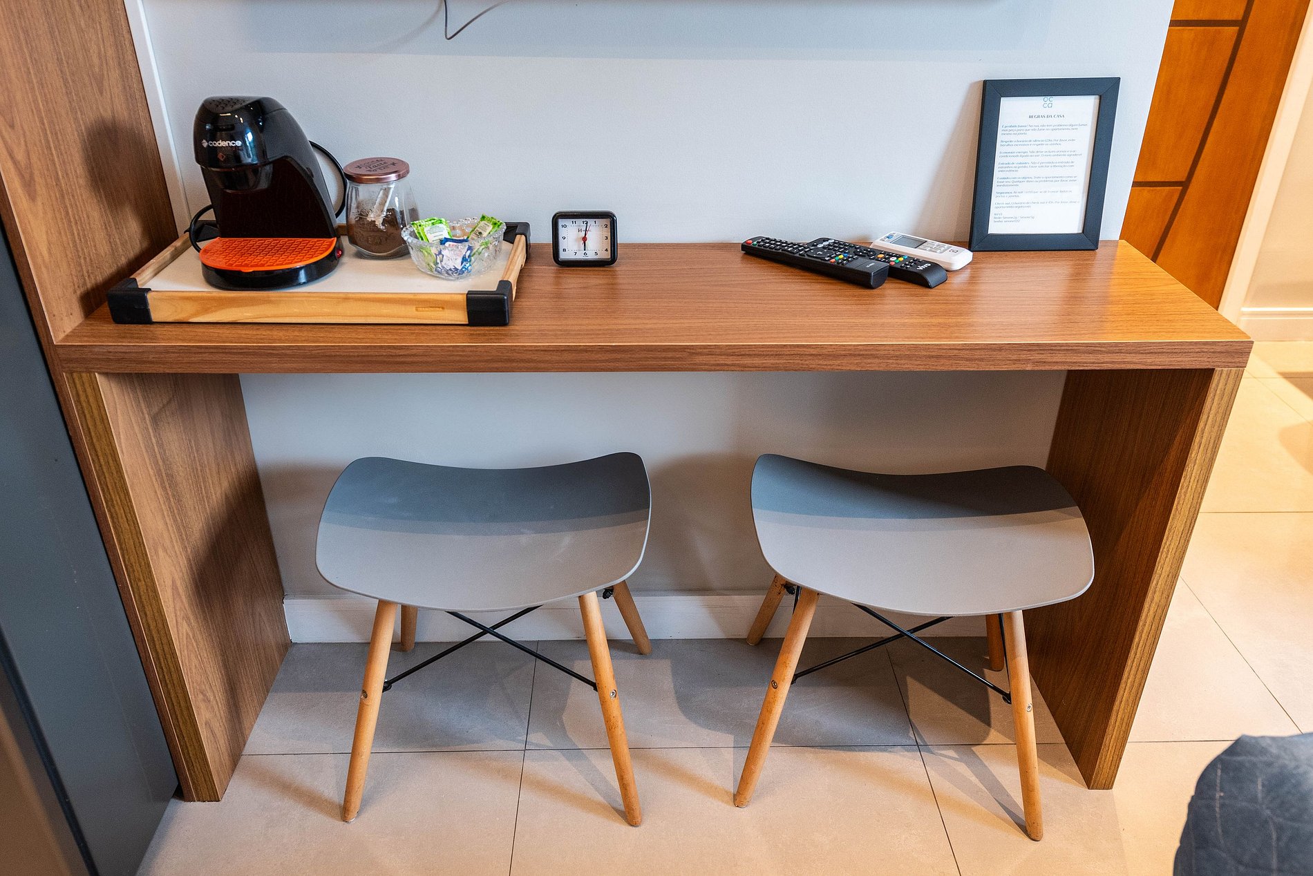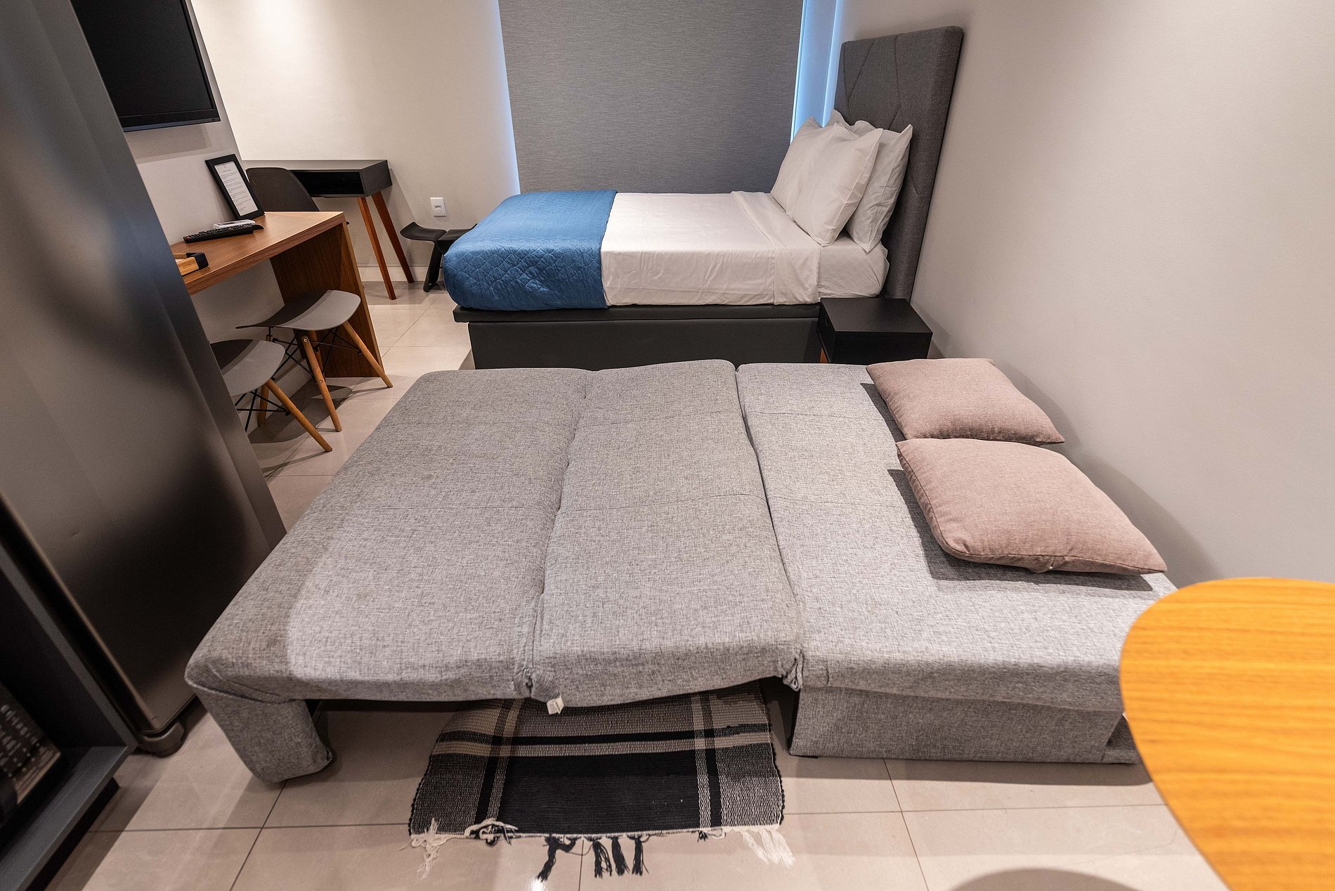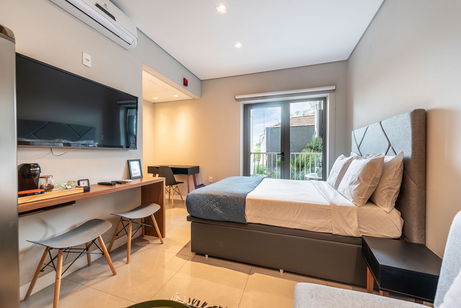 Este studio foi planejado para oferecer conforto e funcionalidade. Conta com cama de casal com enxoval de alto padrão, Smart TV, ar-condicionado, mesa de trabalho com cadeiras, cozinha completa com cooktop, micro-ondas, geladeira grande e utensílios para preparar refeições. O banheiro é moderno, com ducha quente e enxoval macio. O apartamento recebe luz natural e possui uma atmosfera elegante, ideal para estadias curtas ou longas.
