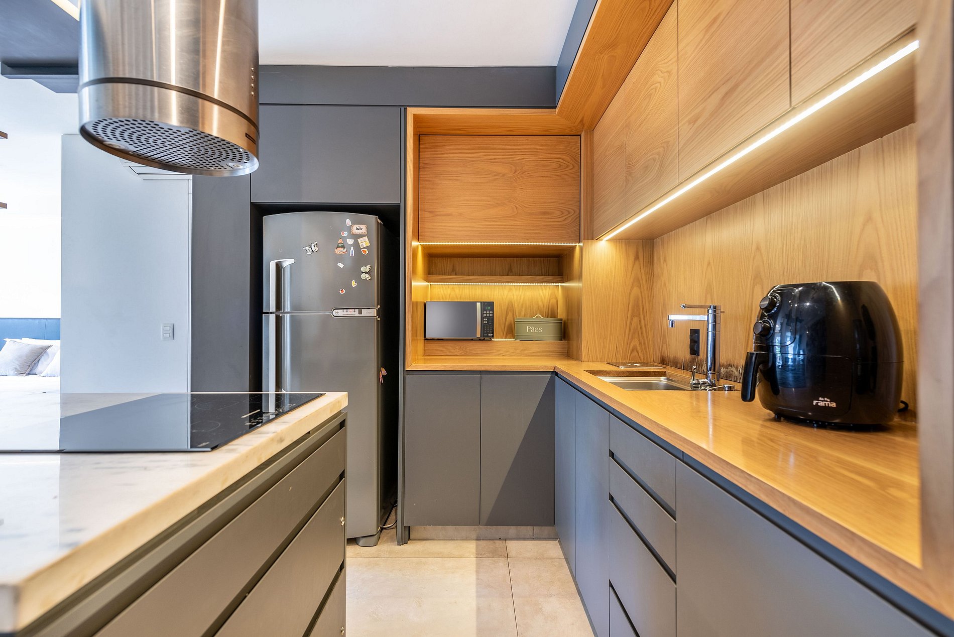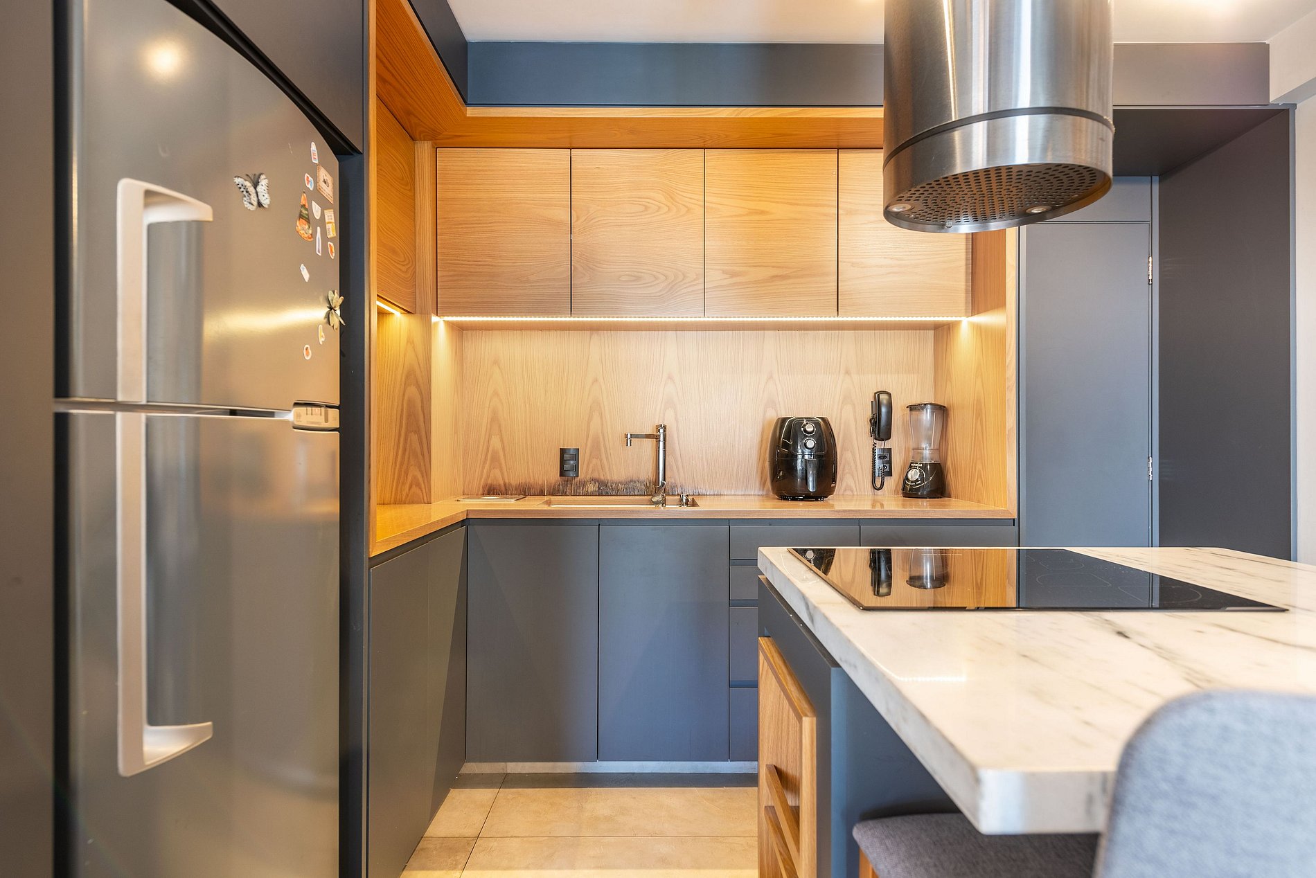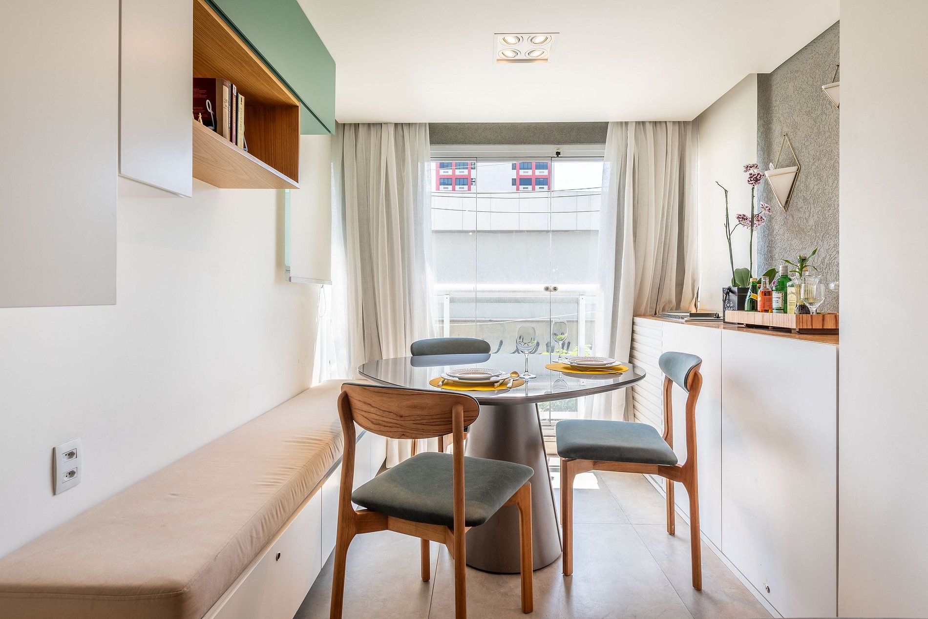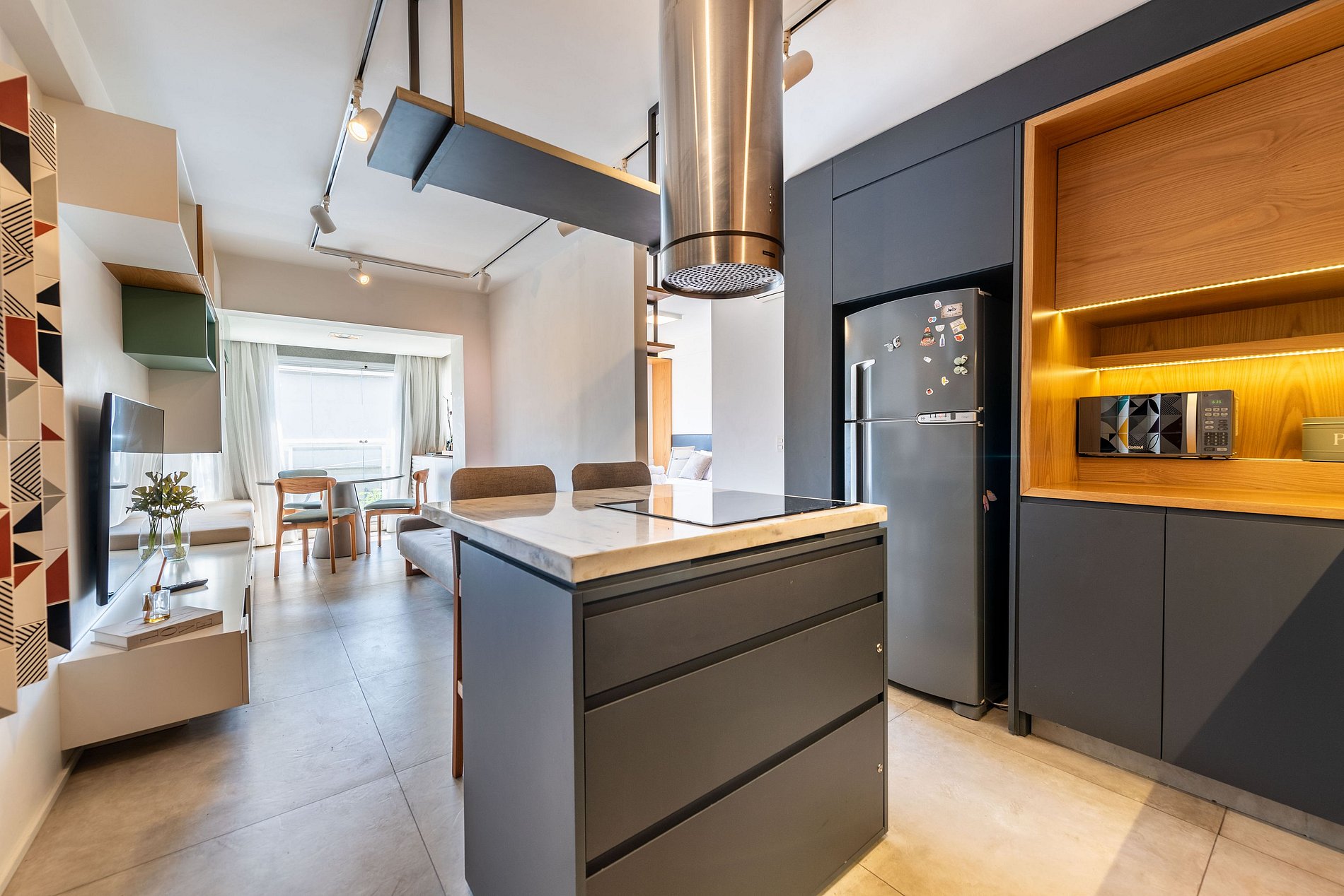 O apartamento conta com ambiente integrado, bem iluminado e mobiliado, ideal para estadias curtas ou longas. A cozinha é compacta e funcional, perfeita para o dia a dia. O espaço é silencioso, confortável e preparado para quem trabalha remotamente ou deseja relaxar após um dia na cidade.