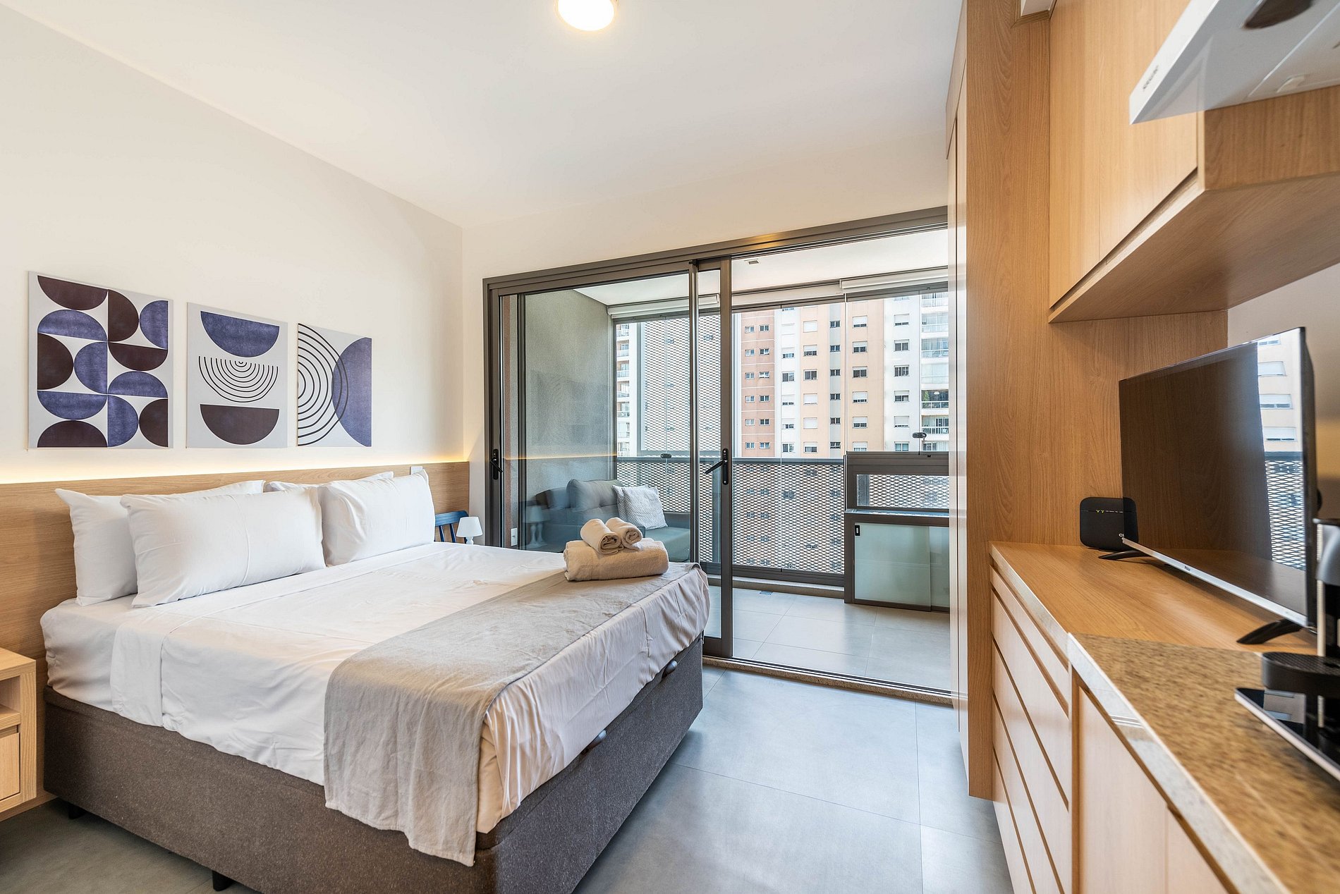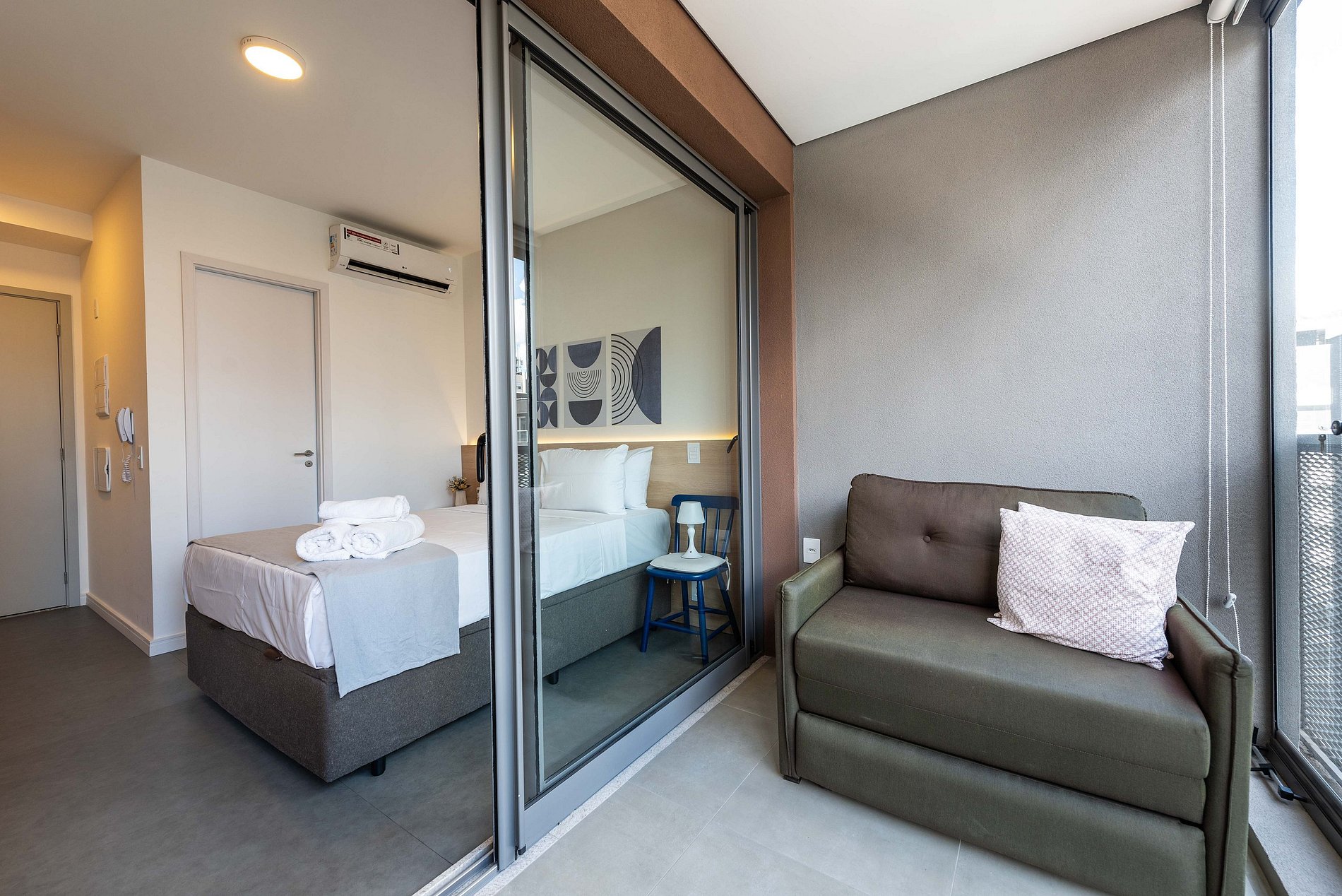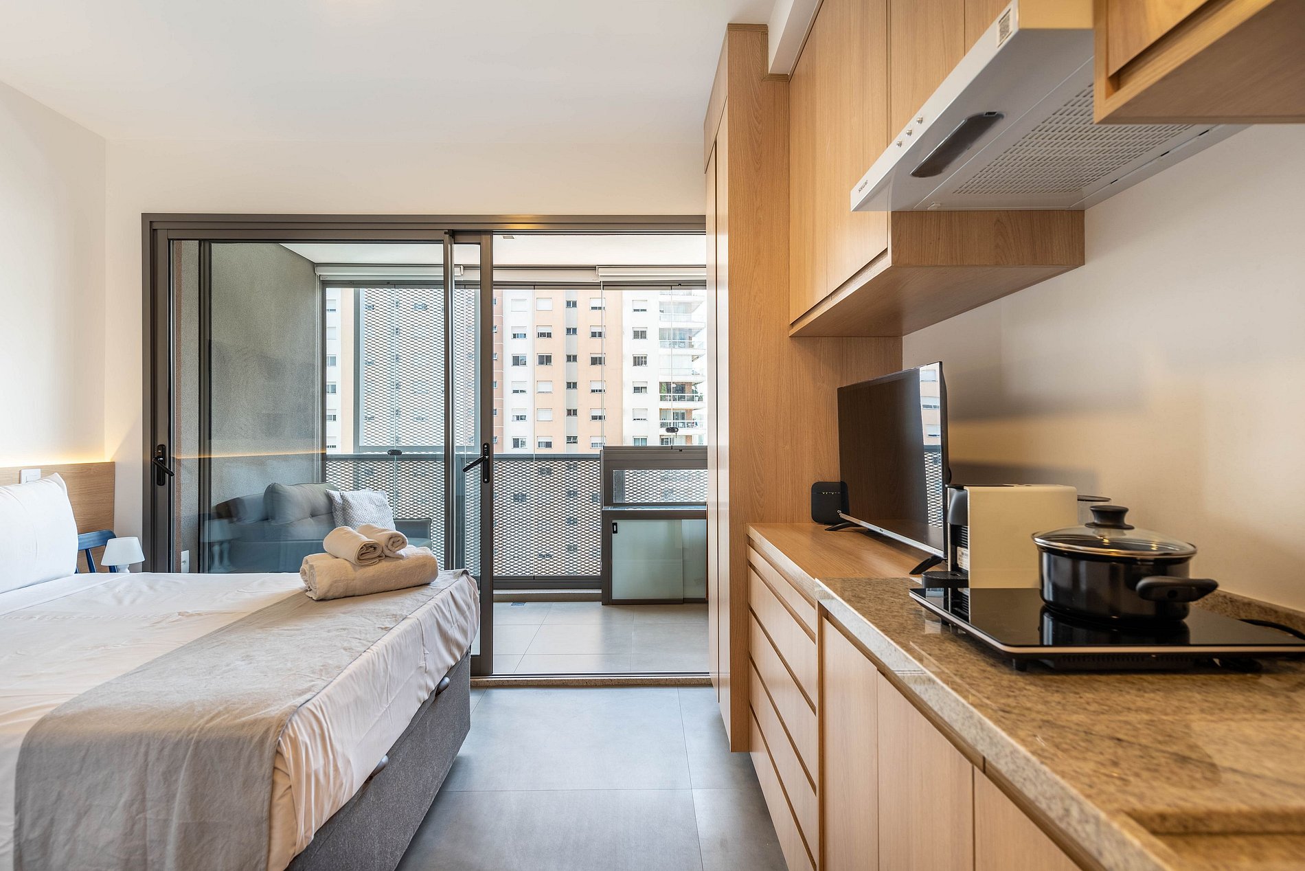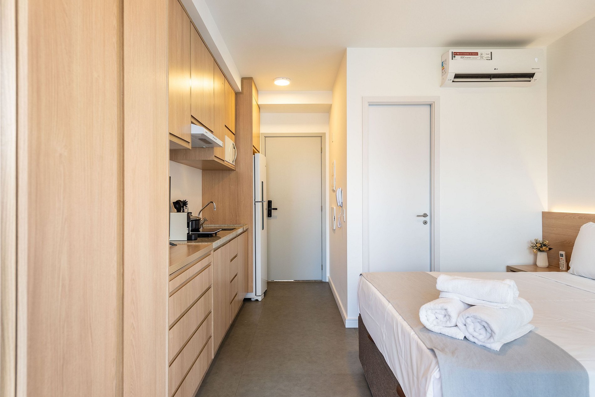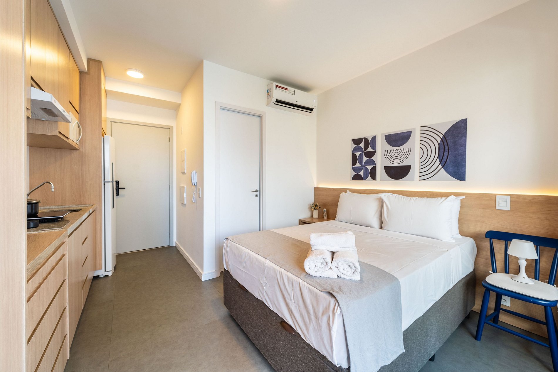 O apartamento conta com ambiente integrado, decoração moderna e otimizada para o máximo aproveitamento do espaço. Ideal para casais, viajantes solo ou profissionais em viagem a trabalho.