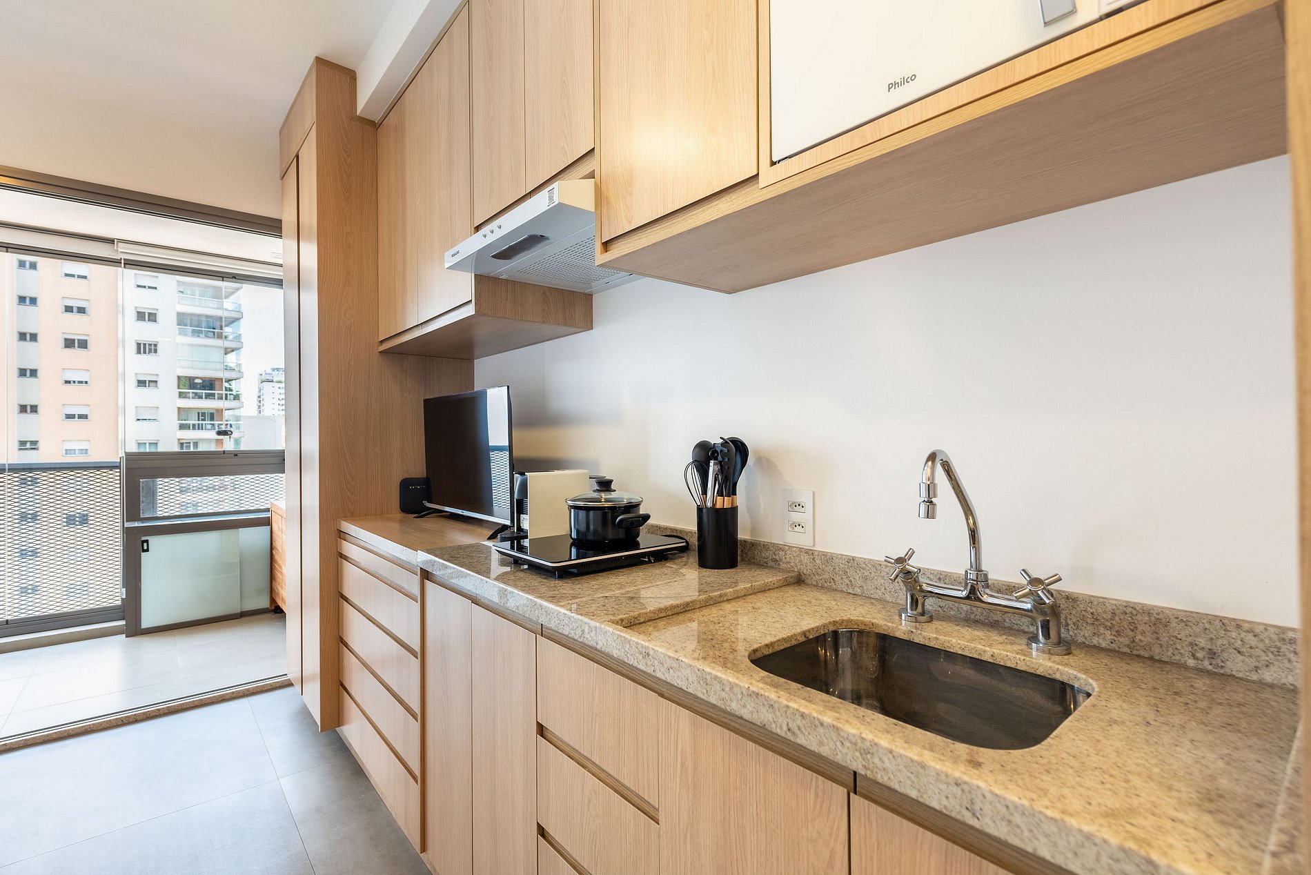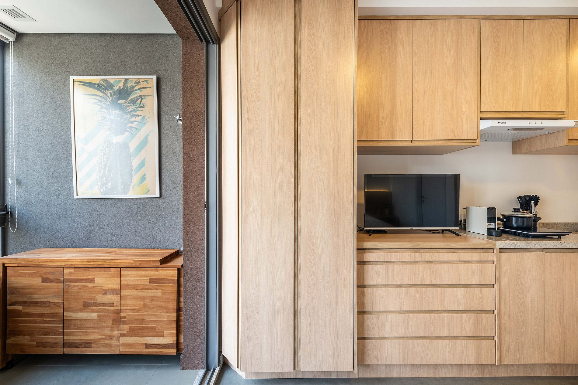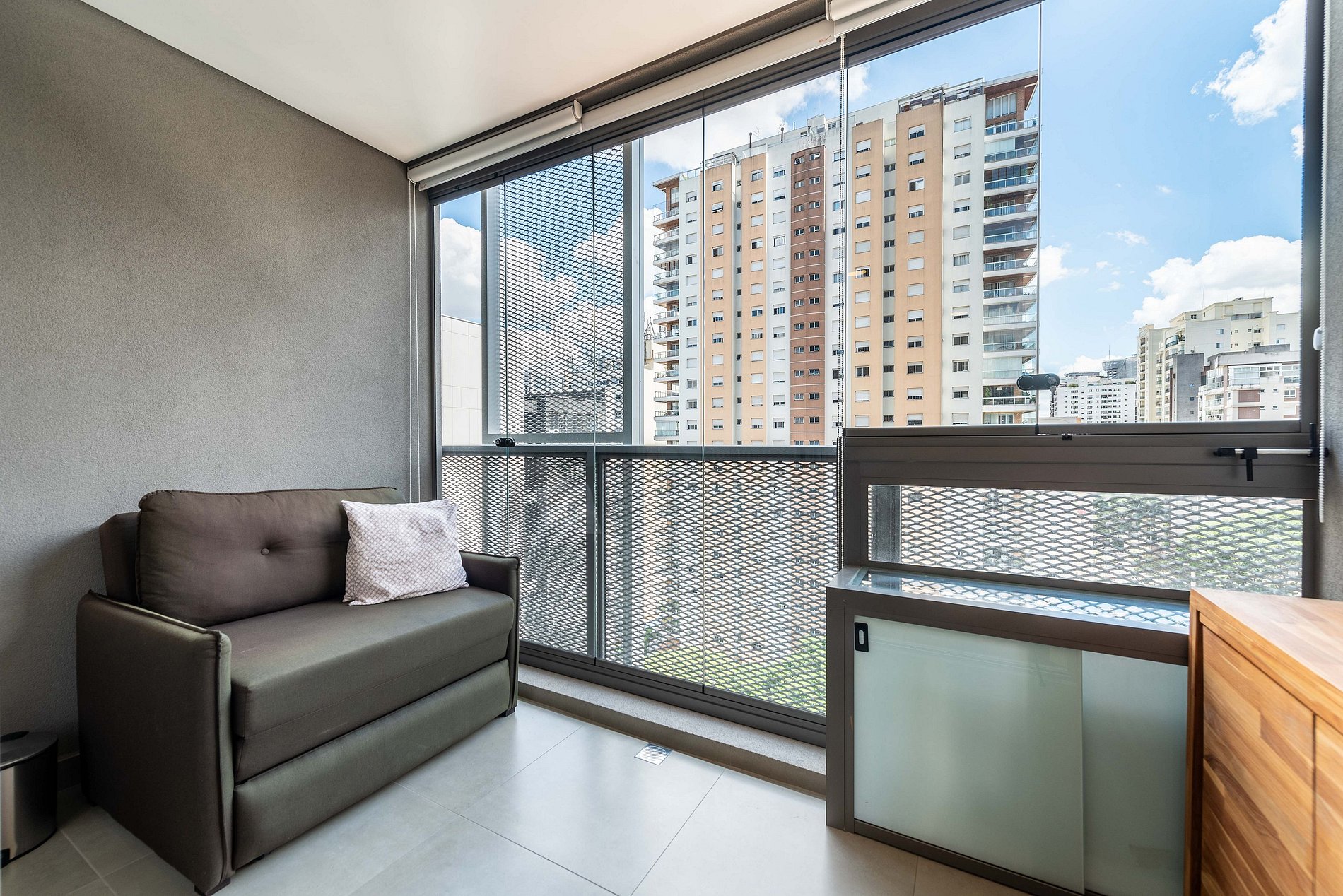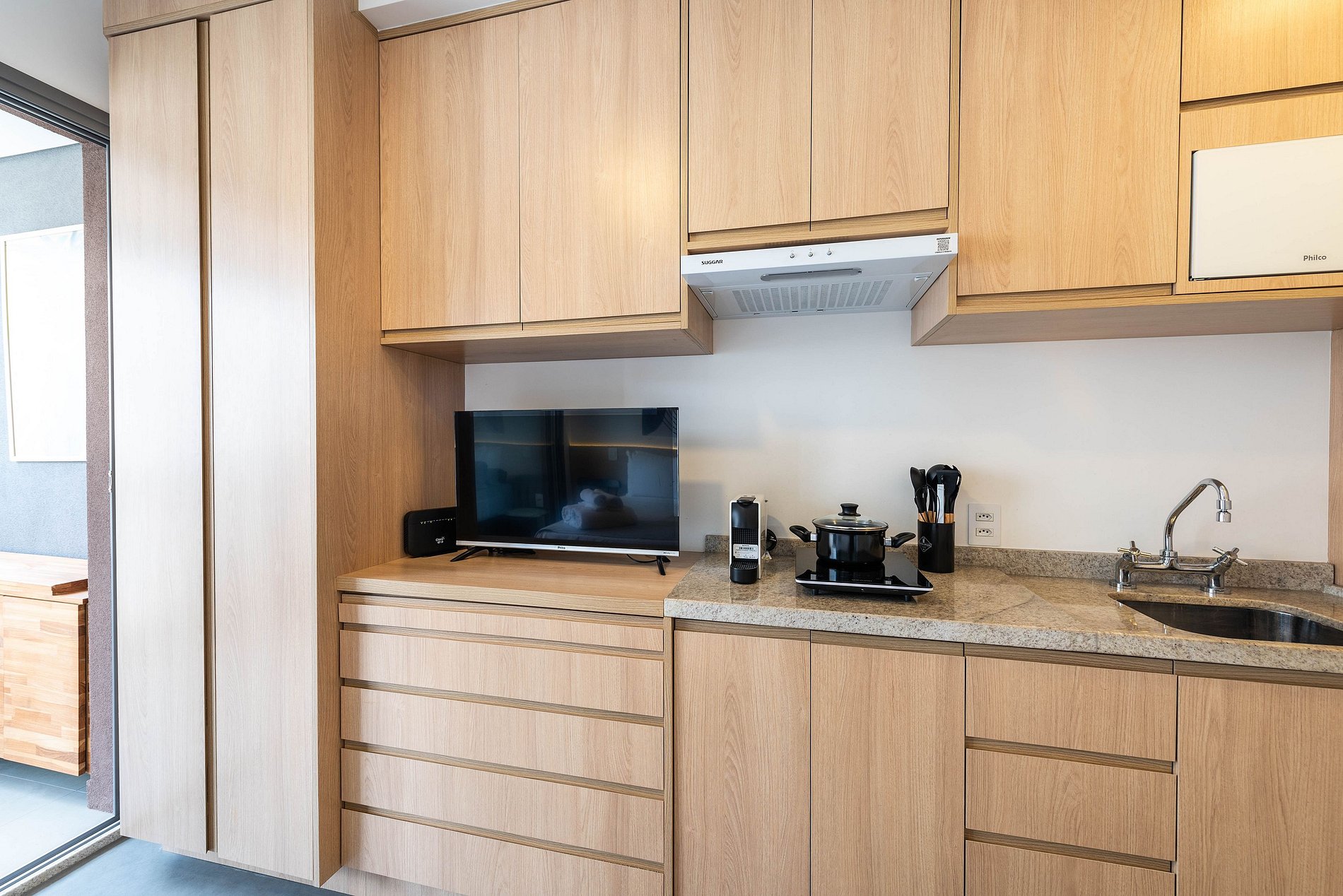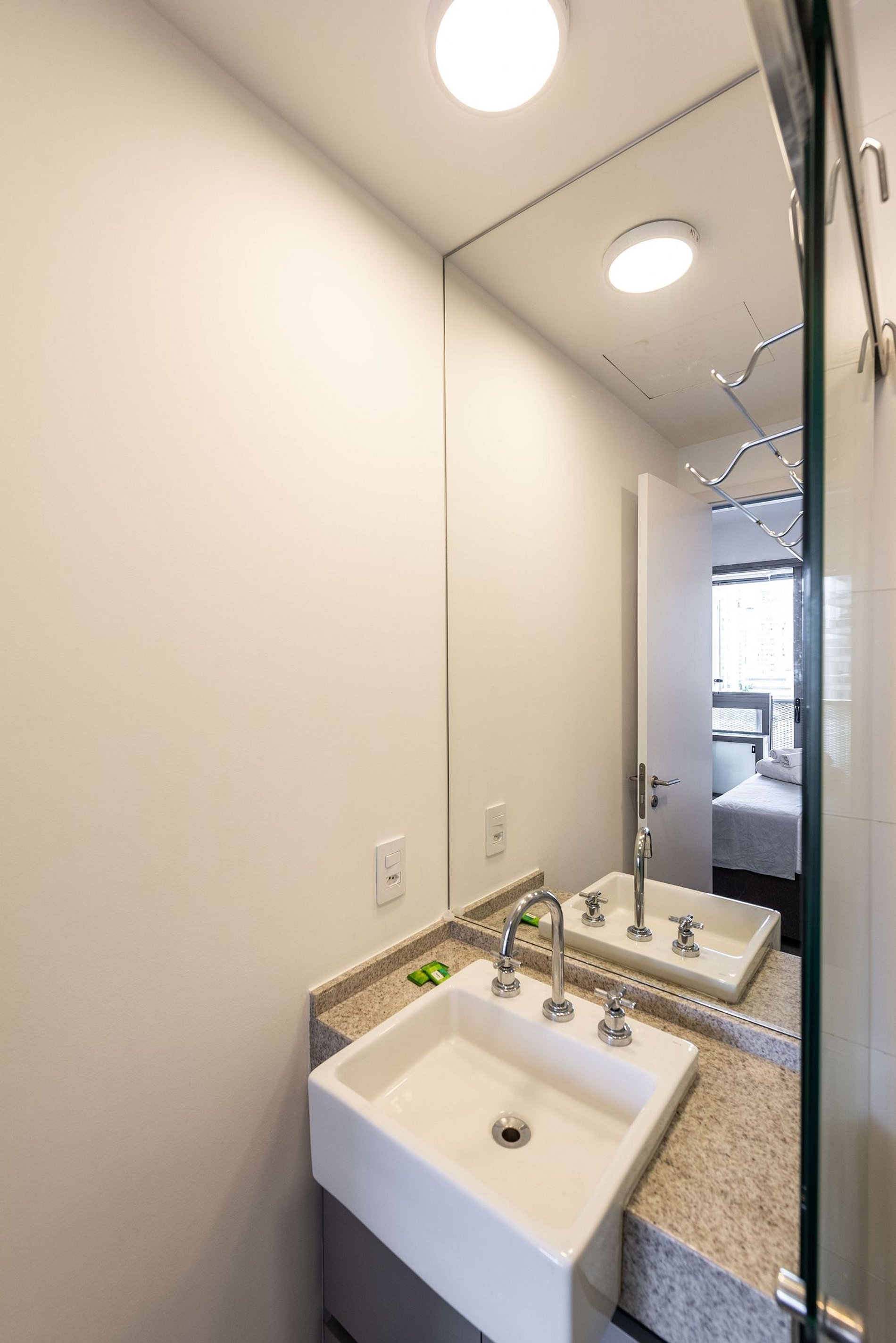 O apartamento conta com ambiente integrado, decoração moderna e otimizada para o máximo aproveitamento do espaço. Ideal para casais, viajantes solo ou profissionais em viagem a trabalho.