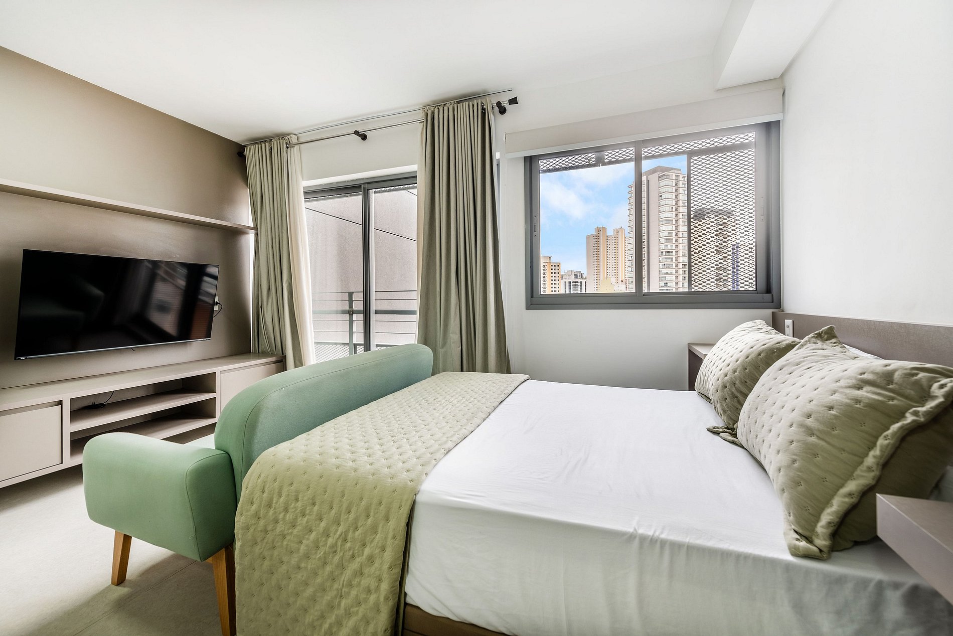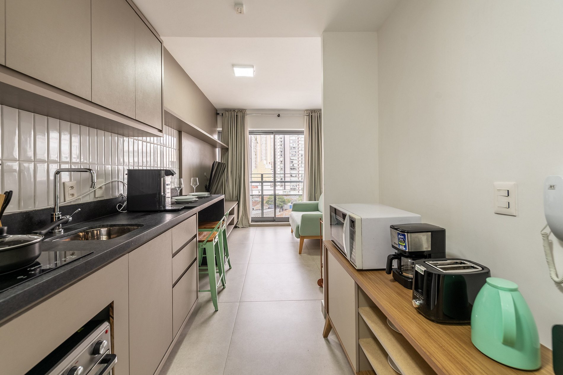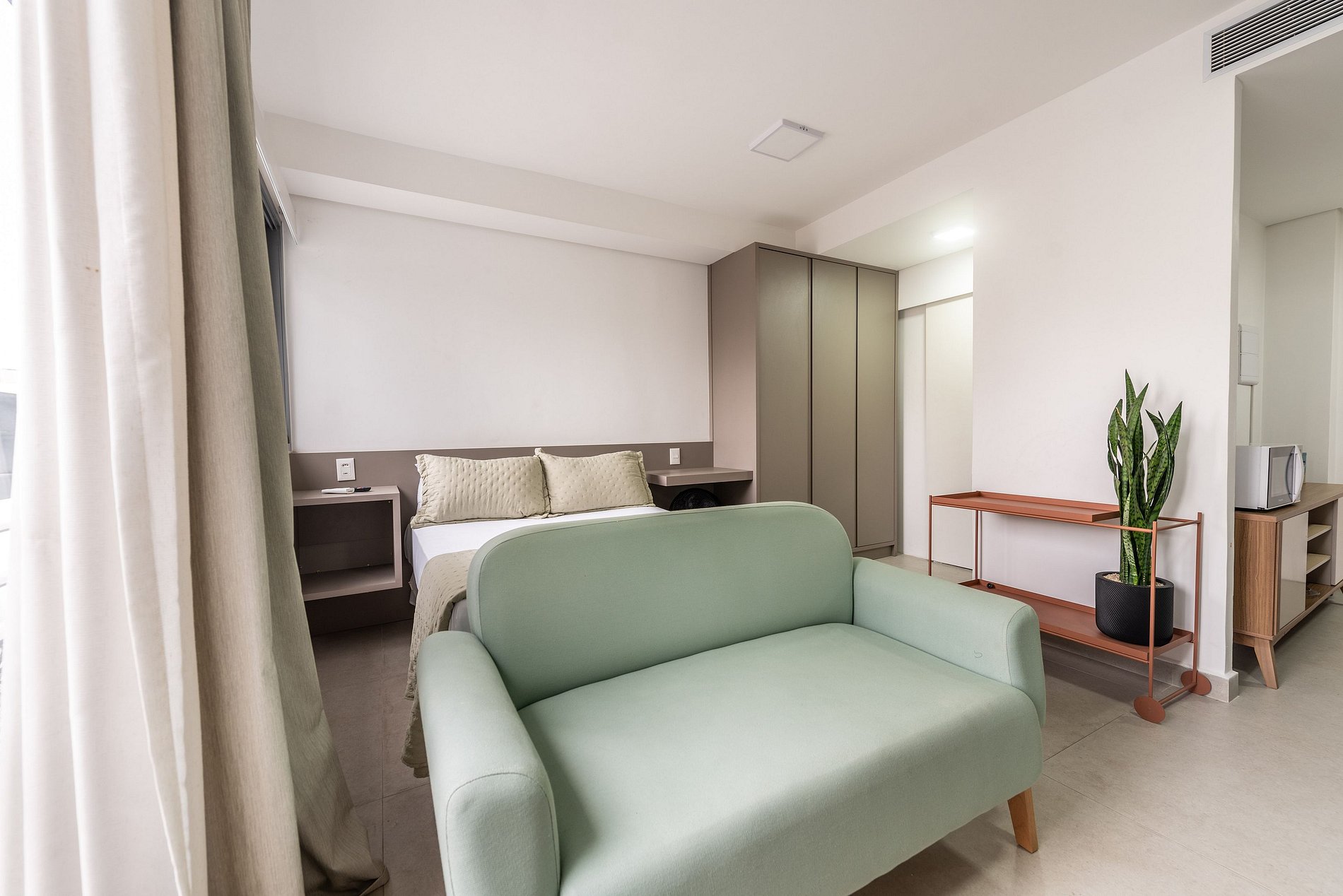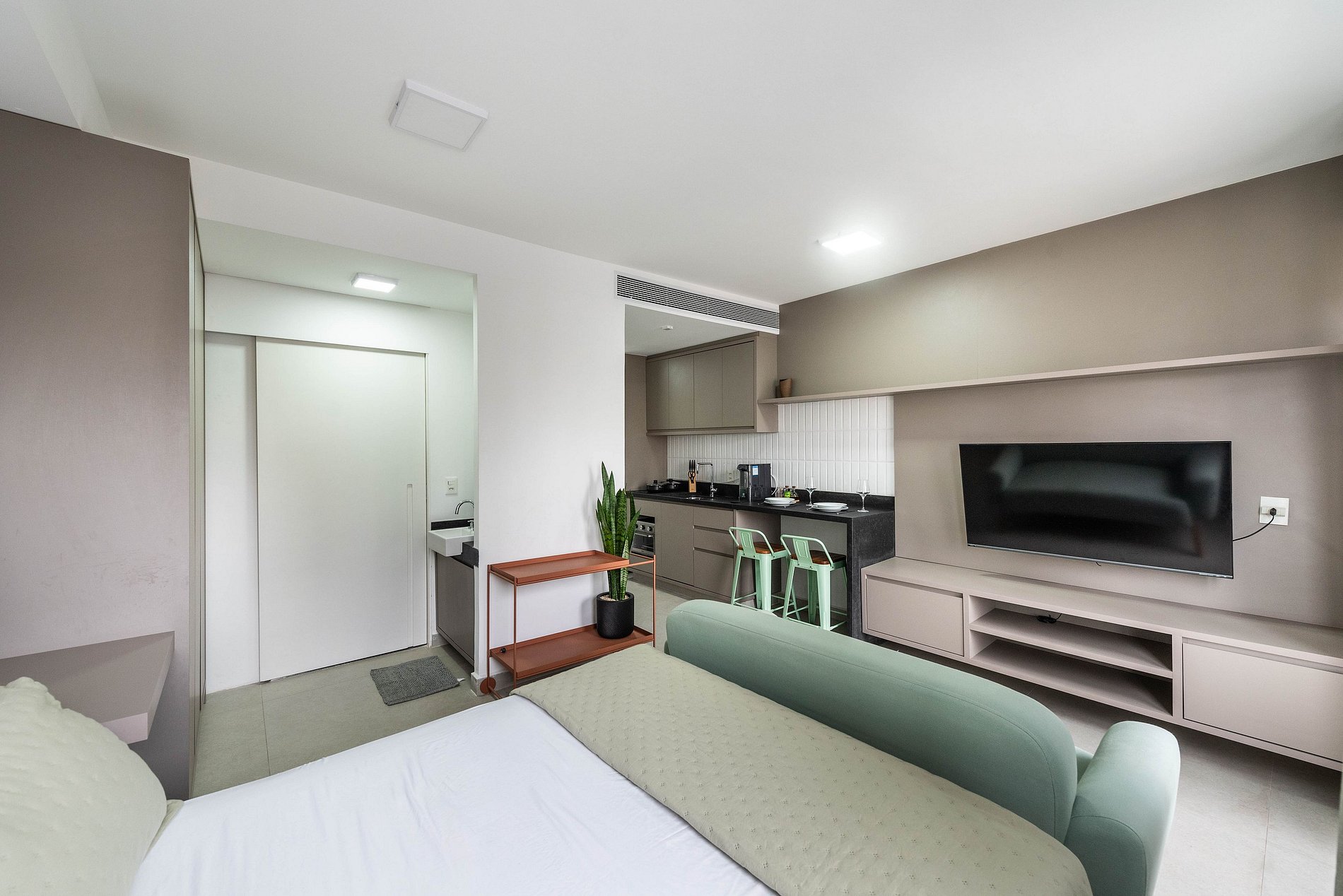 Este moderno studio foi inteiramente reformado e oferece o máximo de praticidade e conforto. O ambiente é decorado com móveis novos e funcionais, incluindo uma cama de casal, smart TV e sofá. A cozinha é completa, com cooktop, forno elétrico, micro-ondas, geladeira e todos os utensílios para preparar refeições. A bancada para refeições também serve como espaço de home office. O studio conta ainda com ar-condicionado e um amplo armário para suas roupas.