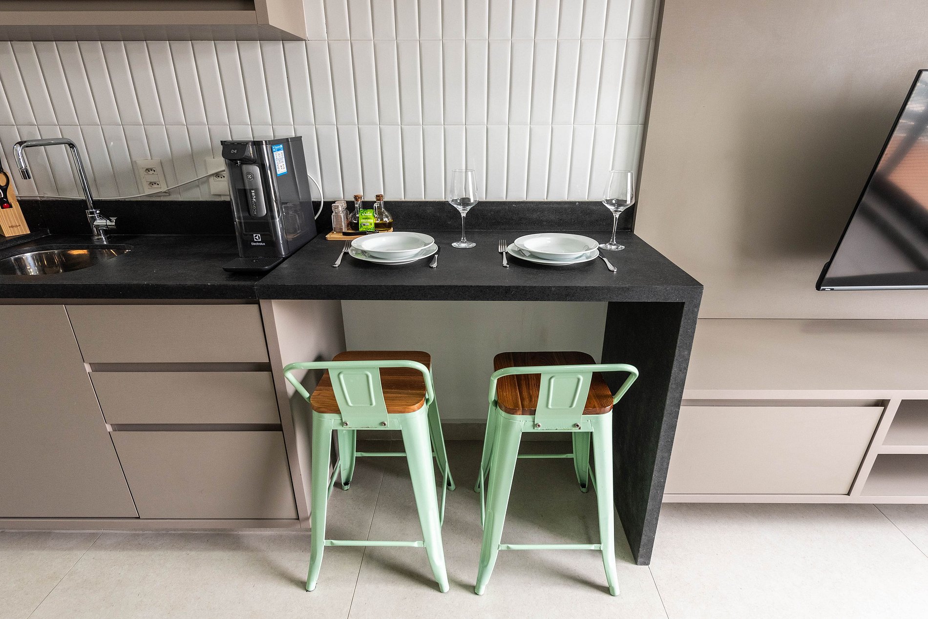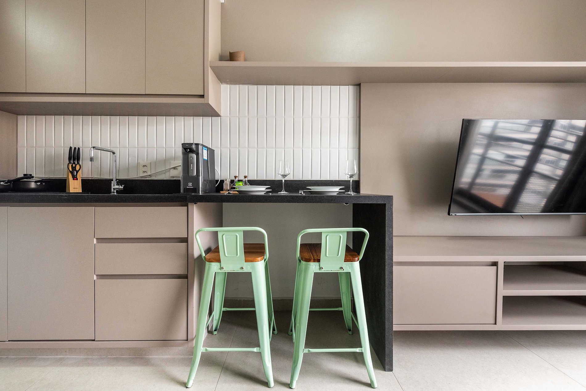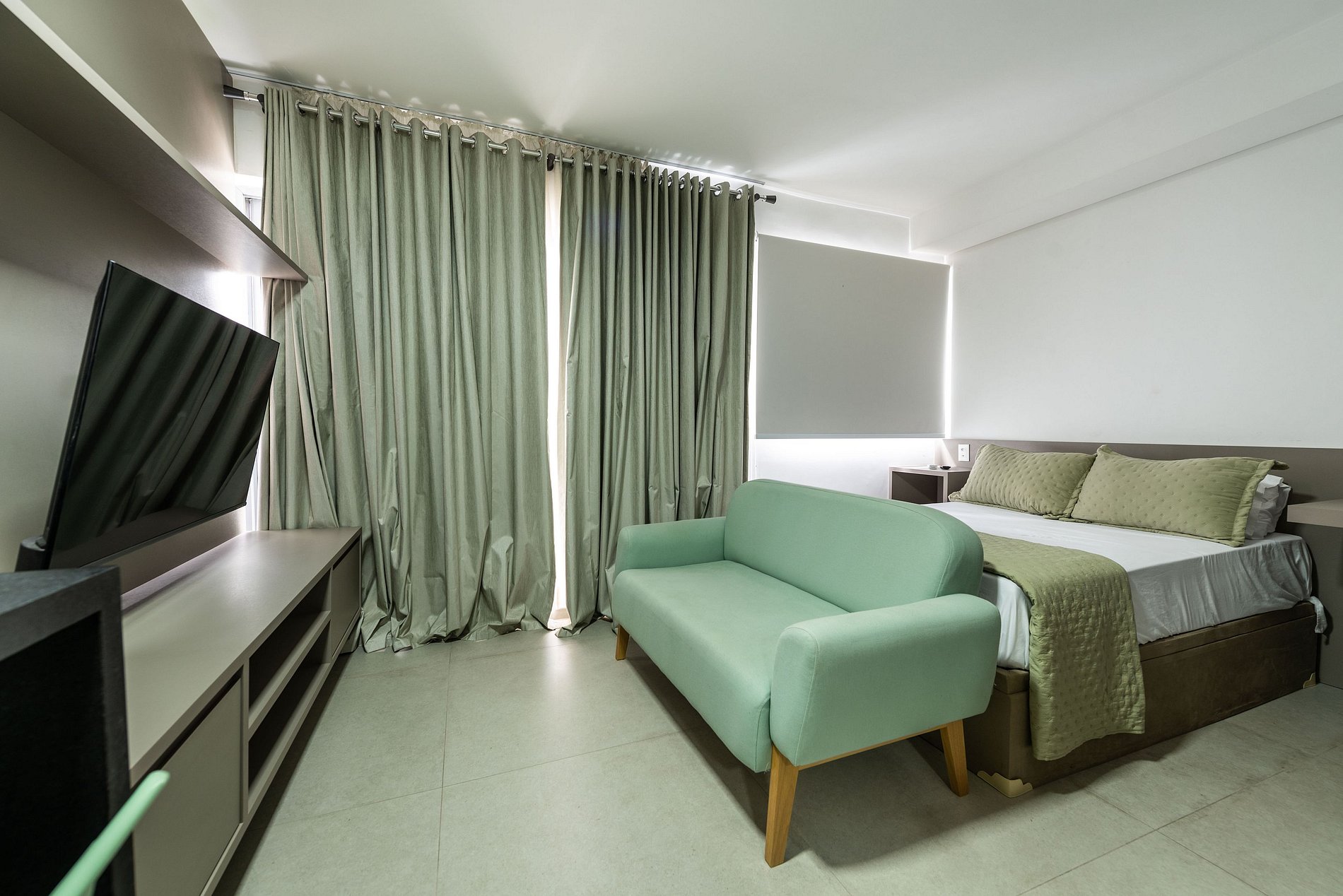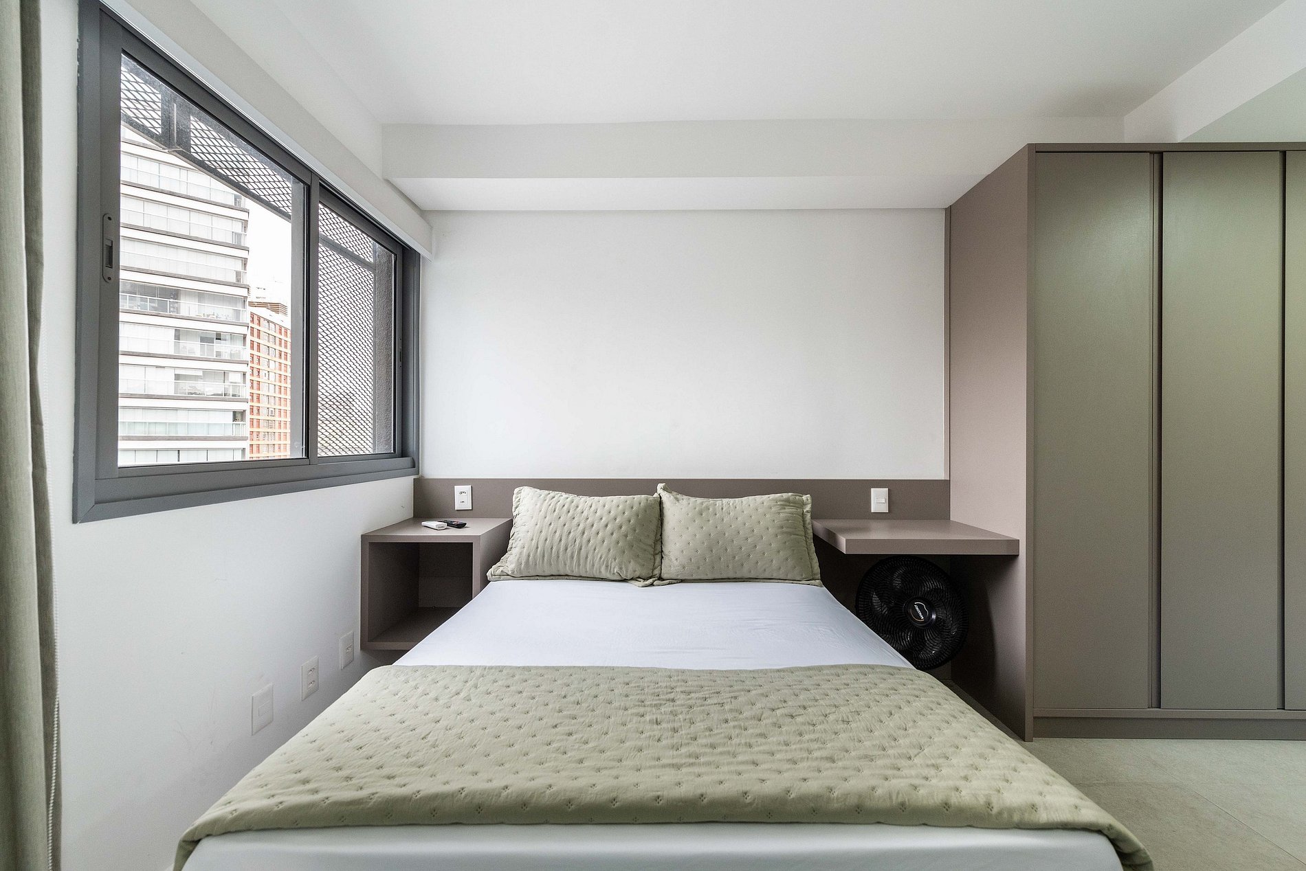 Este moderno studio foi inteiramente reformado e oferece o máximo de praticidade e conforto. O ambiente é decorado com móveis novos e funcionais, incluindo uma cama de casal, smart TV e sofá. A cozinha é completa, com cooktop, forno elétrico, micro-ondas, geladeira e todos os utensílios para preparar refeições. A bancada para refeições também serve como espaço de home office. O studio conta ainda com ar-condicionado e um amplo armário para suas roupas.