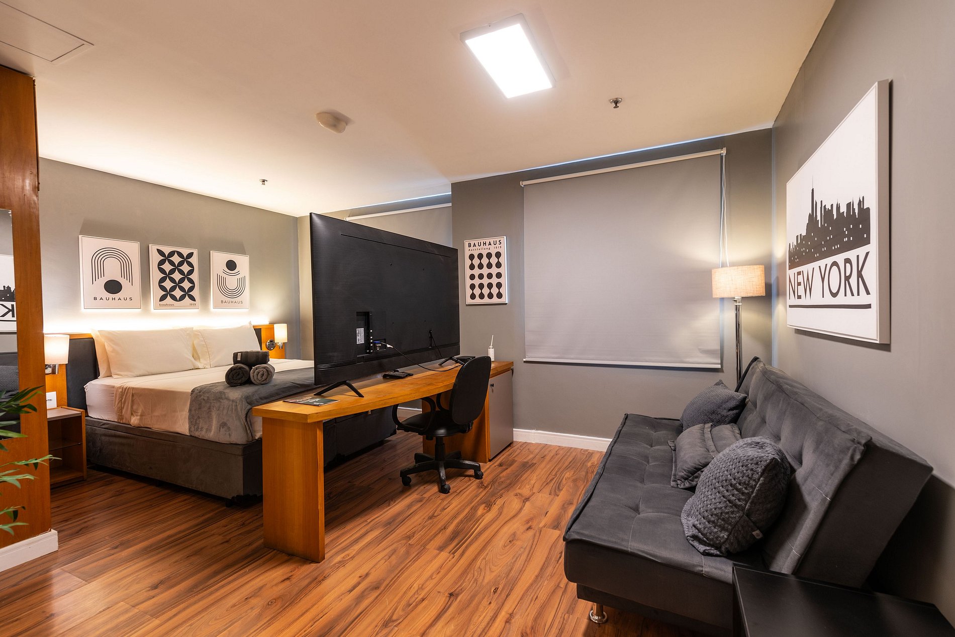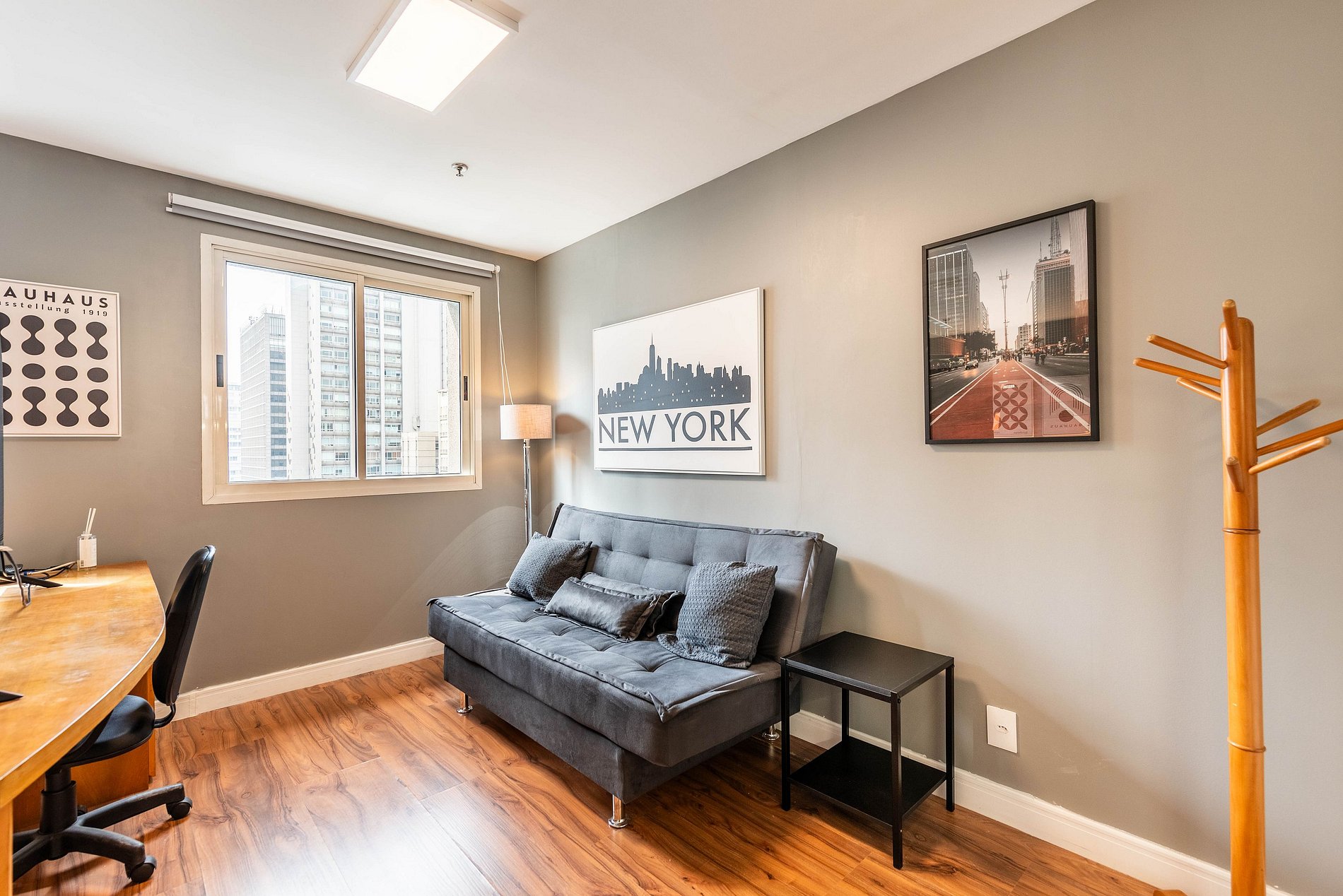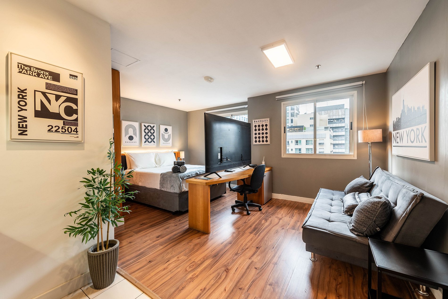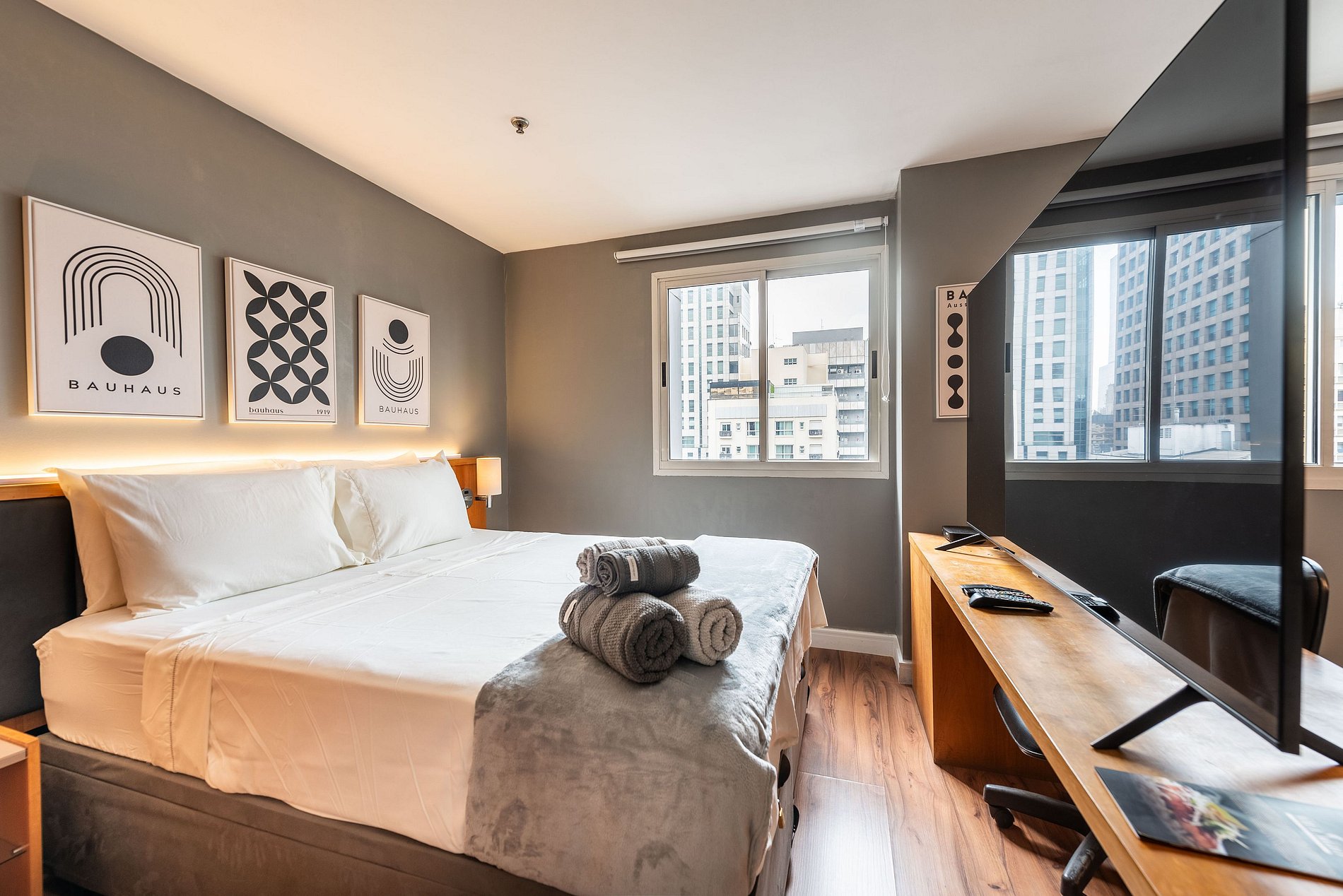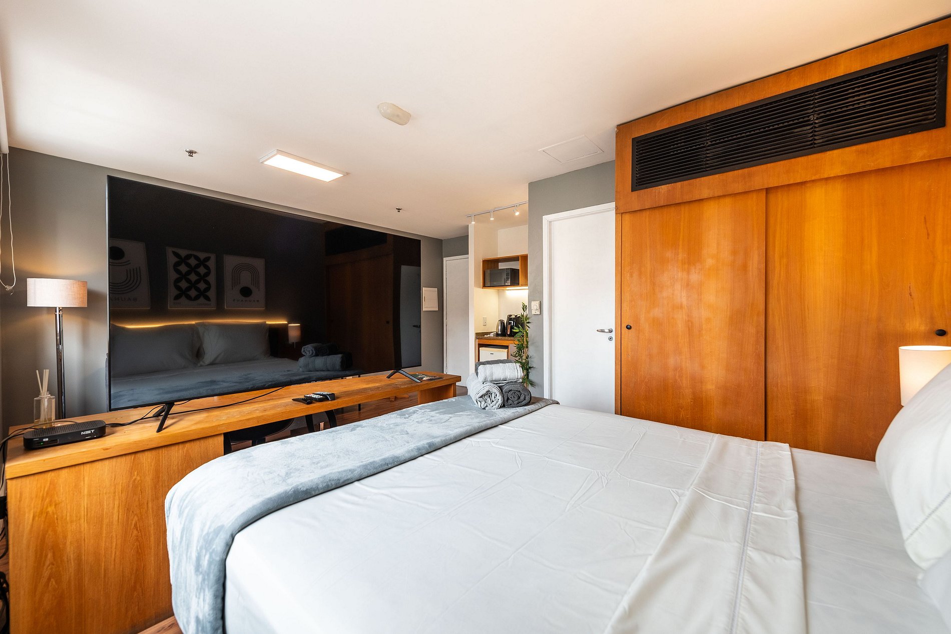 Studio reformado dentro de Hotel 4 estrelas, a 1 quadra do MASP e da Av. Paulista. Vista incrível, cama confortável, sofá, TV, Wi-Fi rápido, ar-condicionado, cozinha equipada e espaço de trabalho. Inclui limpeza diária, recepção 24h, academia, piscina e estacionamento com manobrista. Ideal para negócios ou lazer.