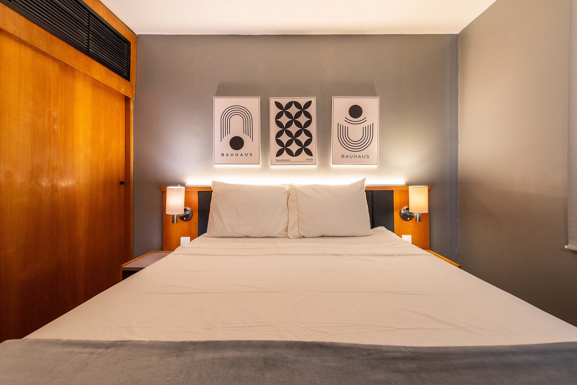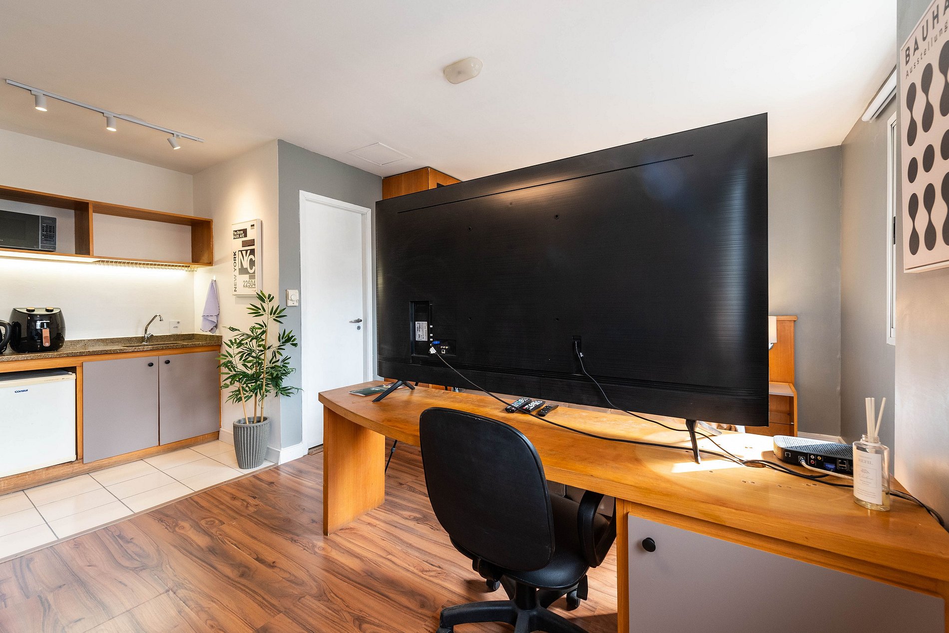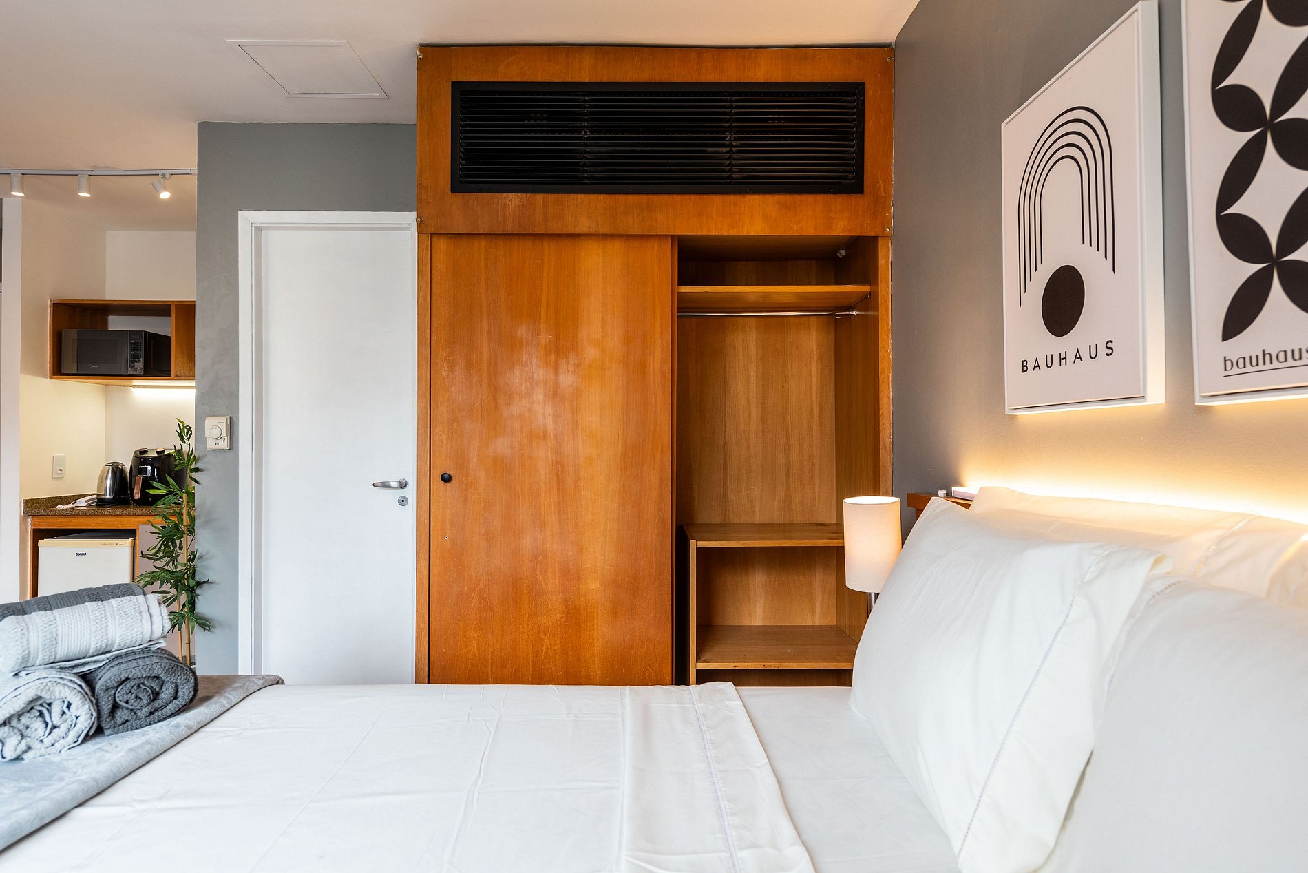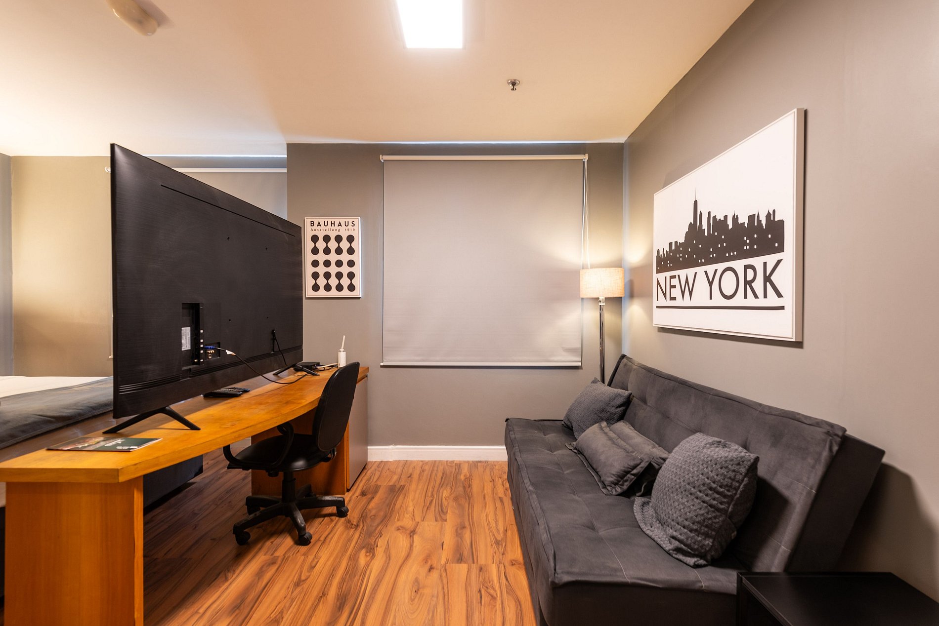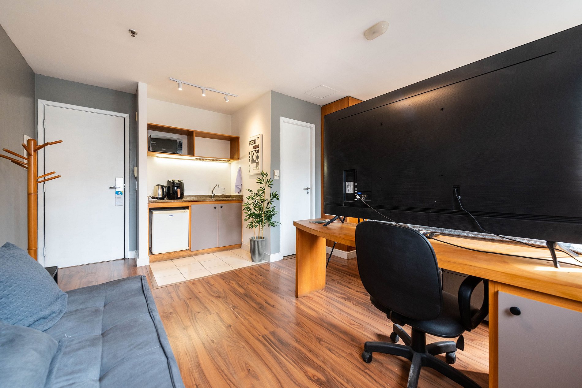 Studio reformado dentro de Hotel 4 estrelas, a 1 quadra do MASP e da Av. Paulista. Vista incrível, cama confortável, sofá, TV, Wi-Fi rápido, ar-condicionado, cozinha equipada e espaço de trabalho. Inclui limpeza diária, recepção 24h, academia, piscina e estacionamento com manobrista. Ideal para negócios ou lazer.