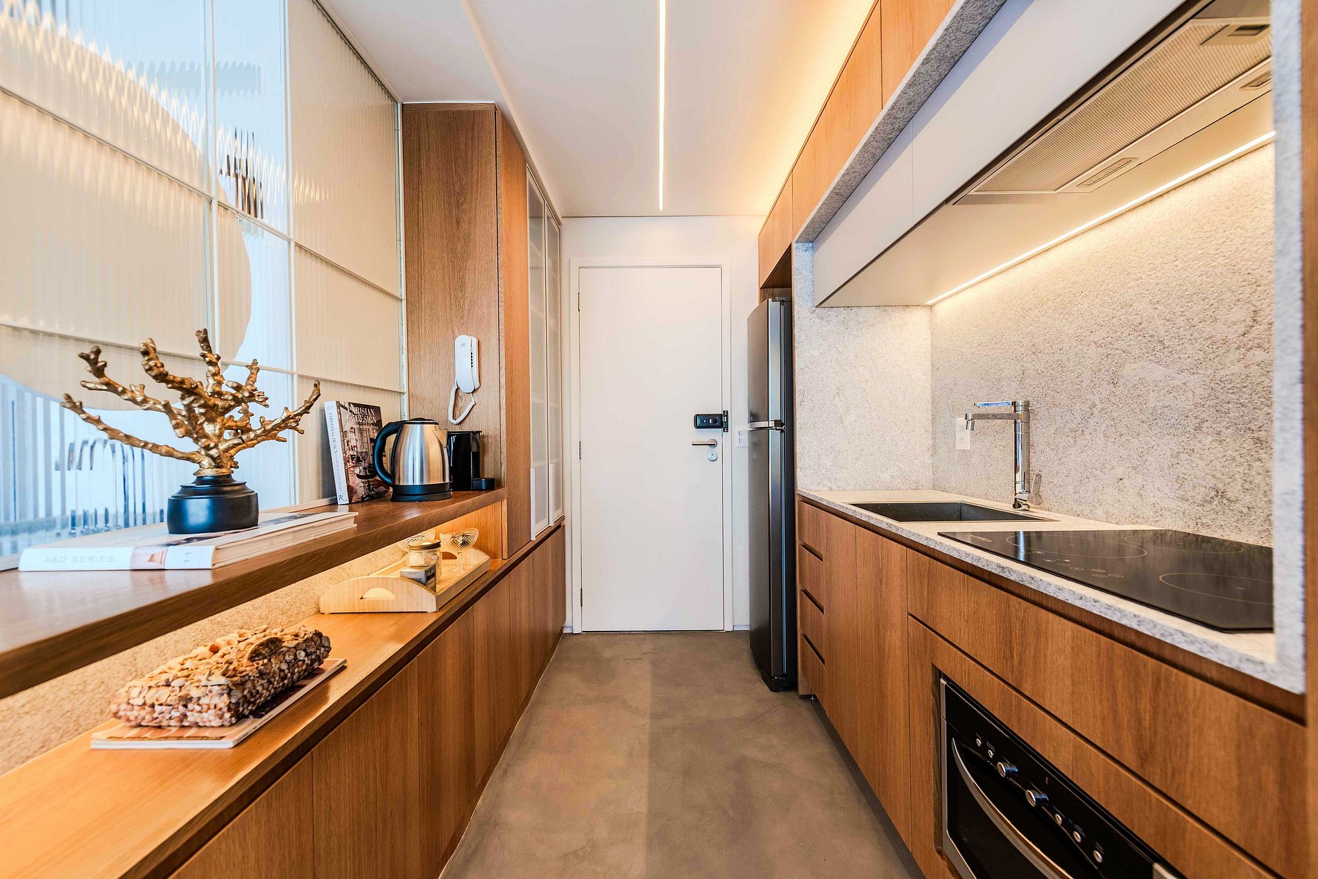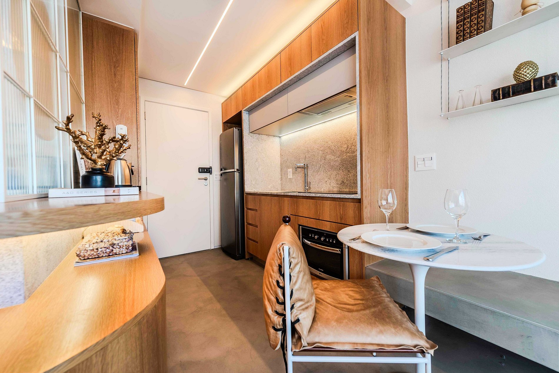 - Geladeira, freezer e cooktop de quatro bocas.