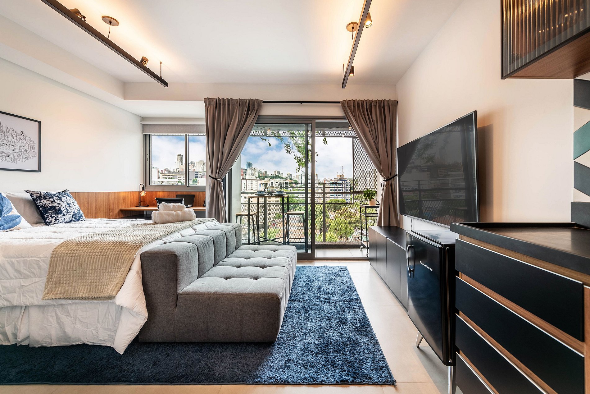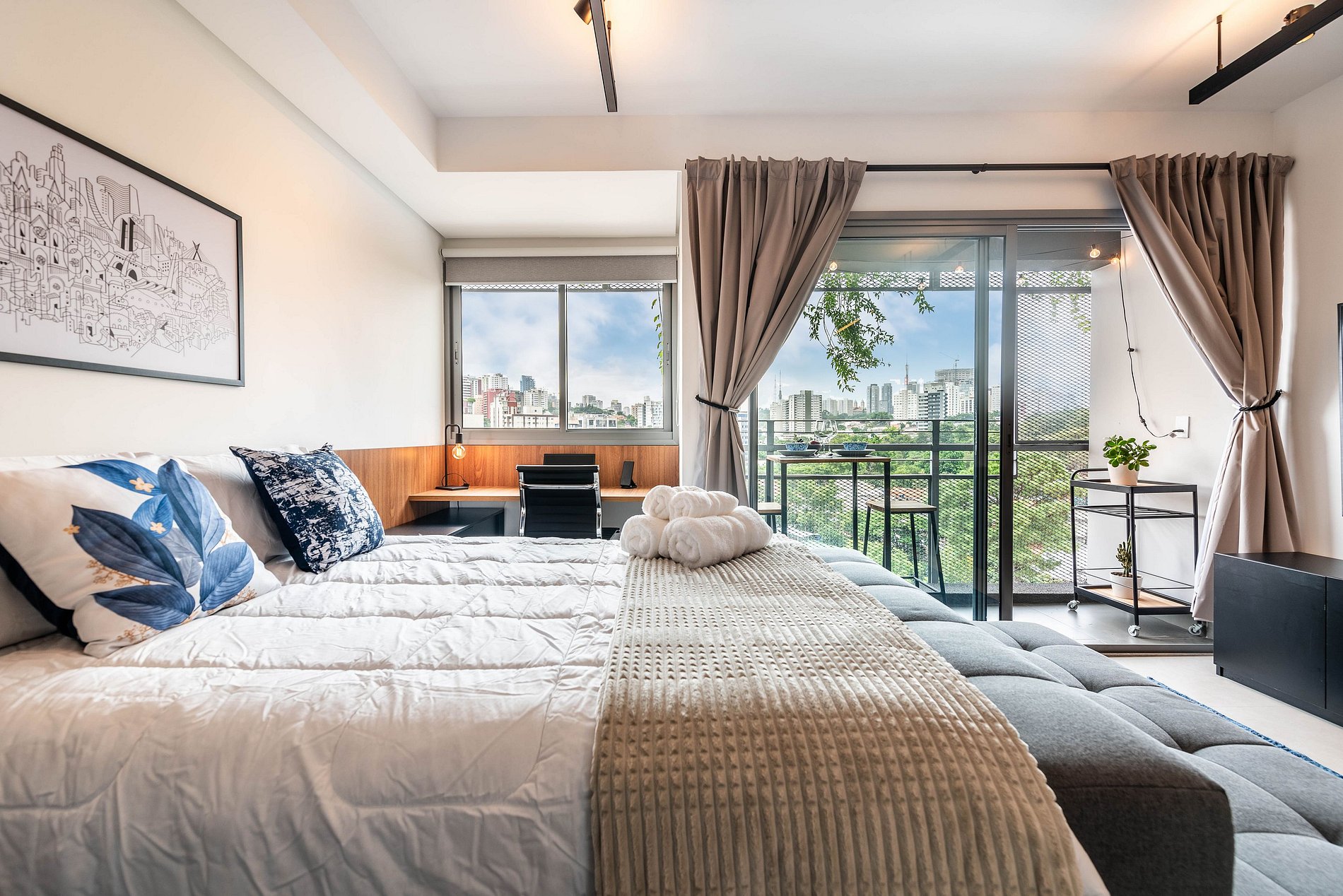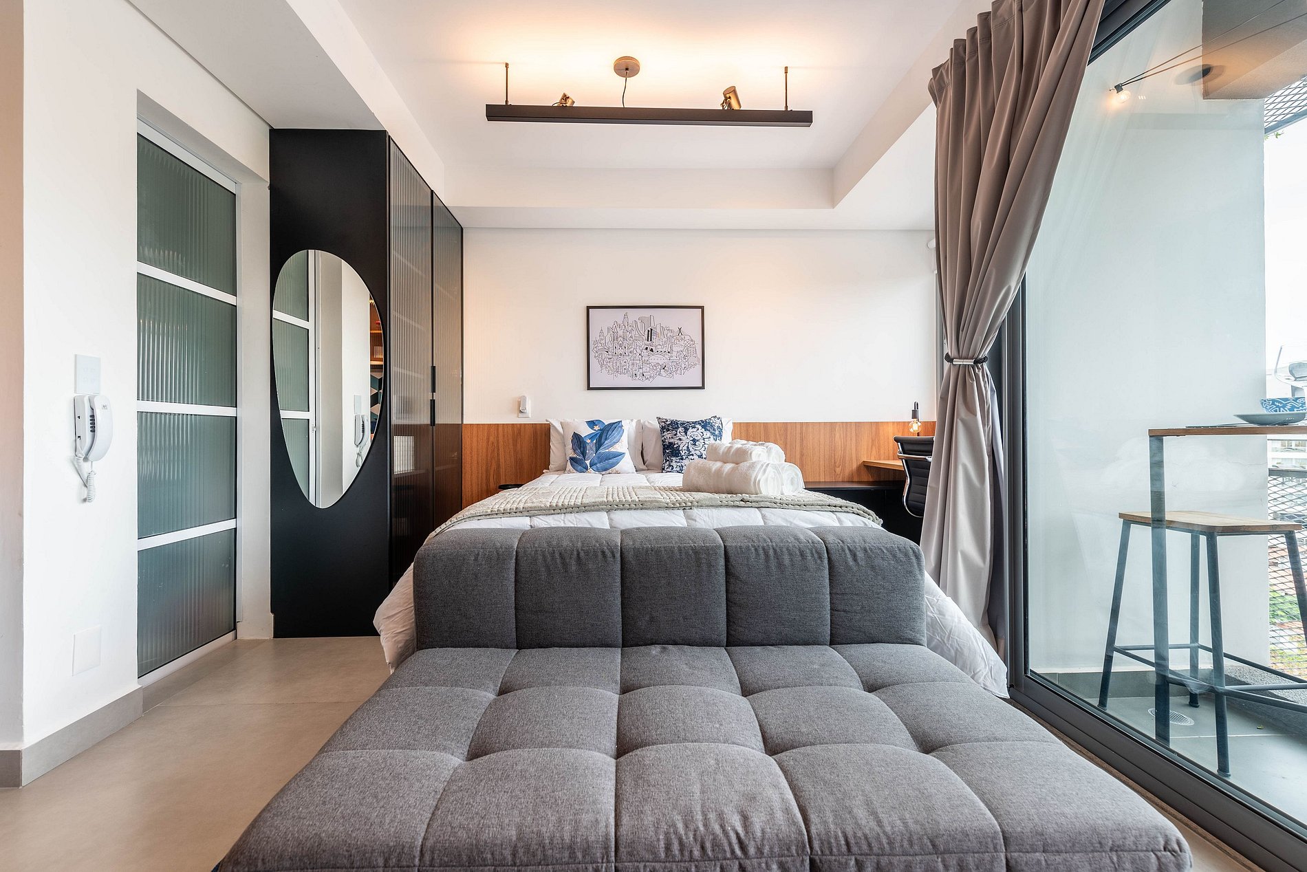 O apartamento, situado no sétimo andar, foi totalmente reformado e planejado para oferecer conforto e funcionalidade. O ambiente é moderno e bem iluminado, com amplas janelas e ventilação natural. A cama de casal proporciona uma noite de sono agradável, e a sala de estar conta com um sofá aconchegante e Smart TV grande. A cozinha é totalmente equipada com cafeteira Nespresso, micro-ondas, forno, cooktop de indução, frigobar, lava-louças e todos os utensílios necessários para uma estadia confortável. A varanda privativa tem uma mesa com bancos para refeições ao ar livre. O banheiro moderno dispõe de chuveiro e secador de cabelo. Para maior praticidade e segurança, o apartamento conta com cofre, fechadura eletrônica e cortinas blackout. O prédio, além da piscina e academia na cobertura, oferece um espaço de coworking no primeiro andar e possui segurança 24h. Sua fachada foi projetada para interagir com a arte da cidade, criando um ambiente sofisticado e acolhedor.