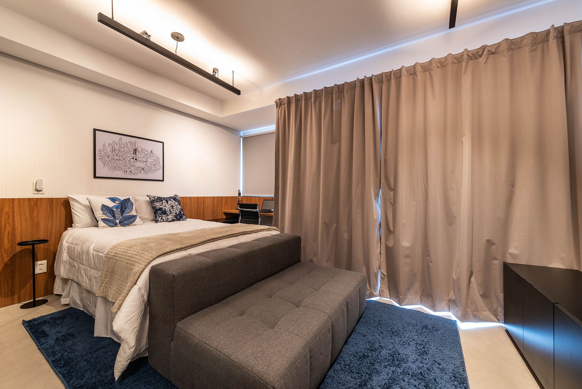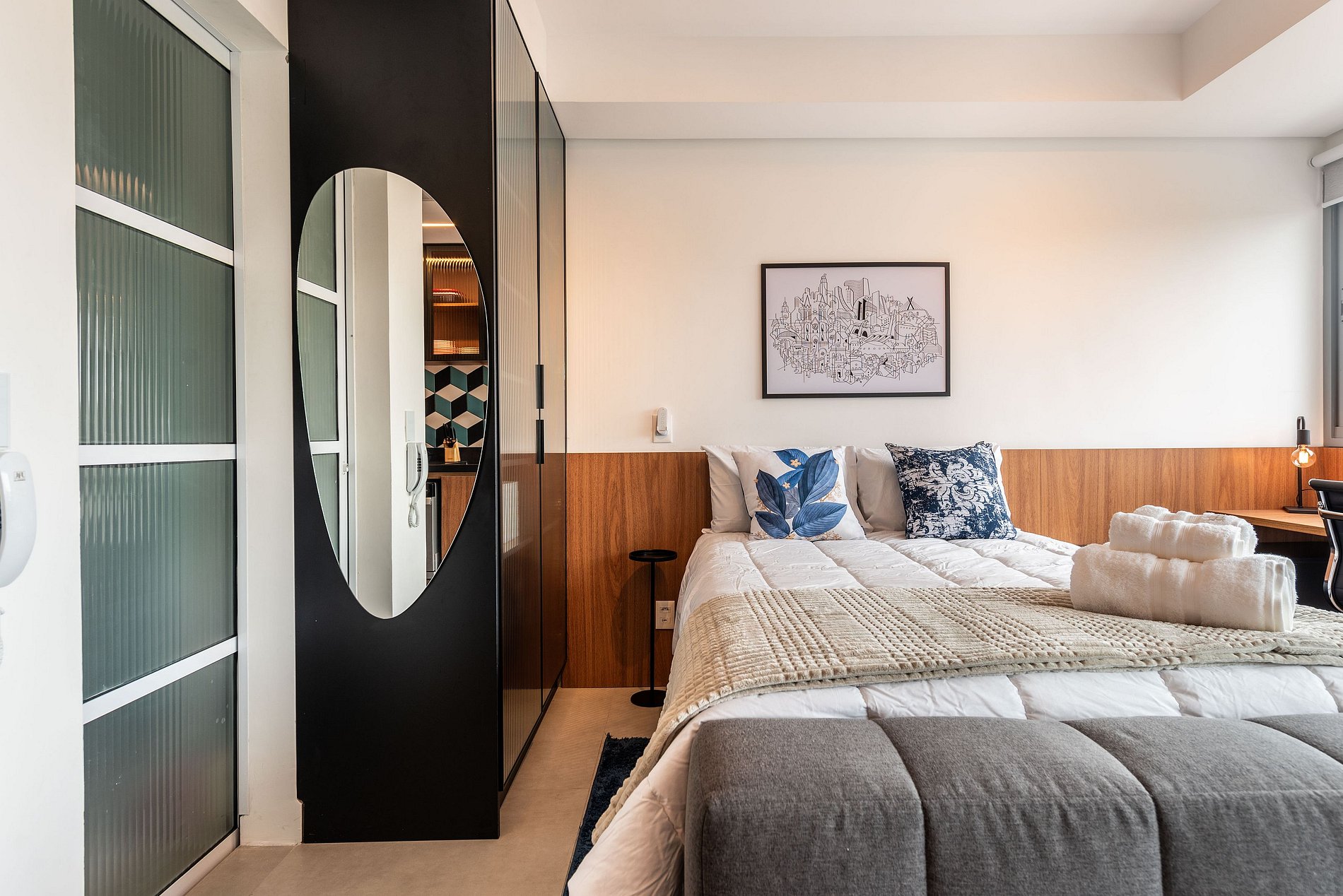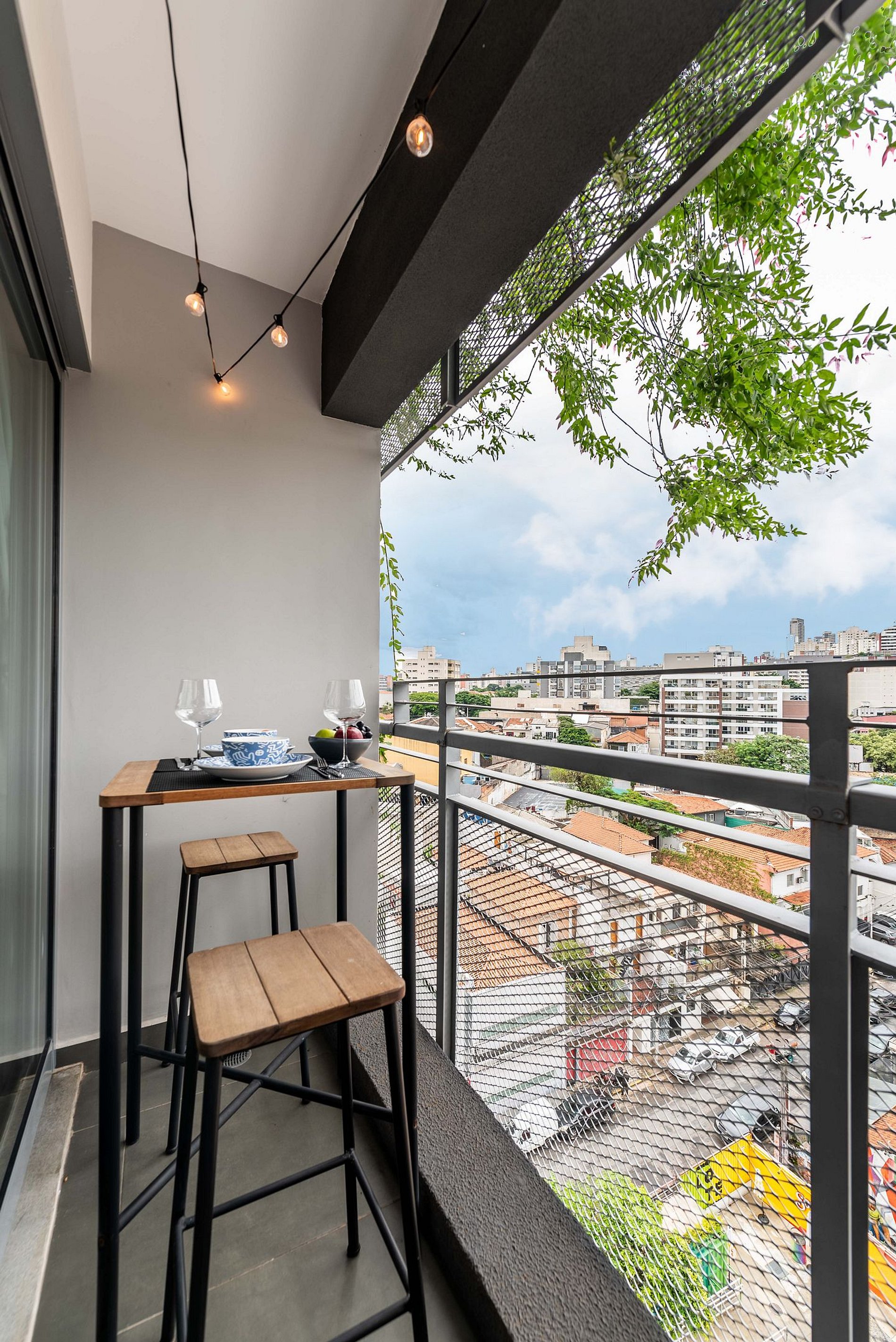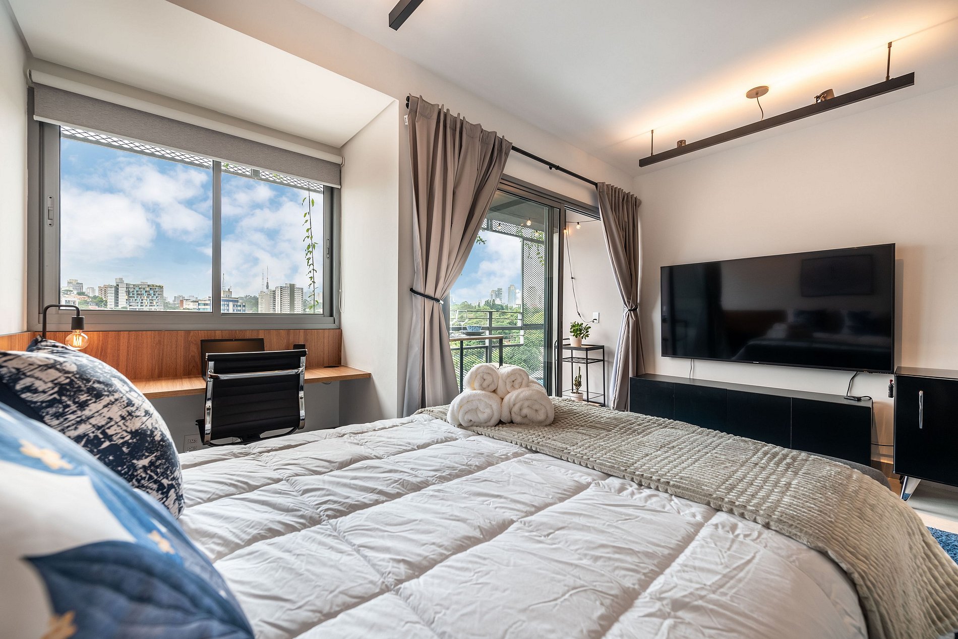 O apartamento, situado no sétimo andar, foi totalmente reformado e planejado para oferecer conforto e funcionalidade. O ambiente é moderno e bem iluminado, com amplas janelas e ventilação natural. A cama de casal proporciona uma noite de sono agradável, e a sala de estar conta com um sofá aconchegante e Smart TV grande. A cozinha é totalmente equipada com cafeteira Nespresso, micro-ondas, forno, cooktop de indução, frigobar, lava-louças e todos os utensílios necessários para uma estadia confortável. A varanda privativa tem uma mesa com bancos para refeições ao ar livre. O banheiro moderno dispõe de chuveiro e secador de cabelo. Para maior praticidade e segurança, o apartamento conta com cofre, fechadura eletrônica e cortinas blackout. O prédio, além da piscina e academia na cobertura, oferece um espaço de coworking no primeiro andar e possui segurança 24h. Sua fachada foi projetada para interagir com a arte da cidade, criando um ambiente sofisticado e acolhedor.
