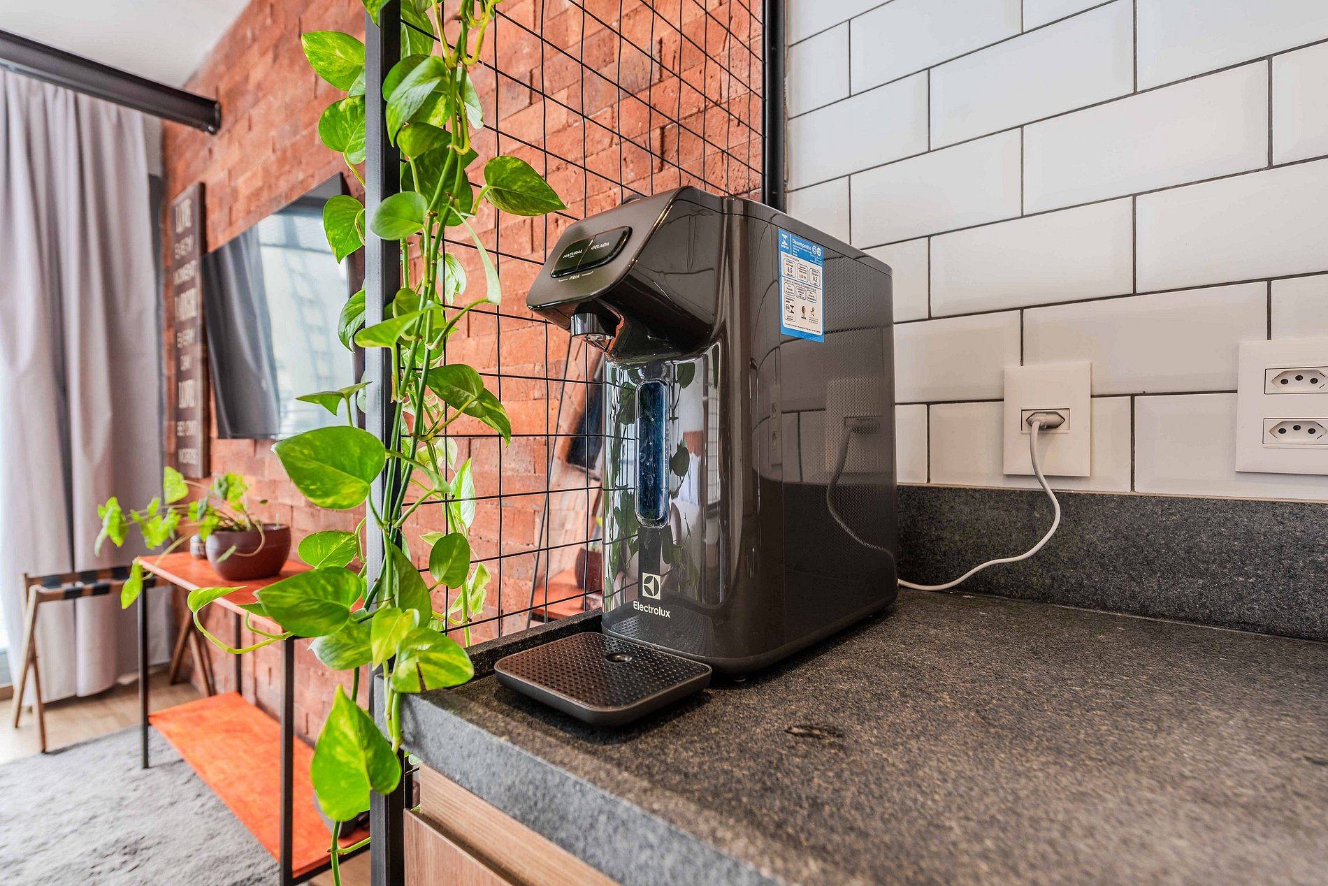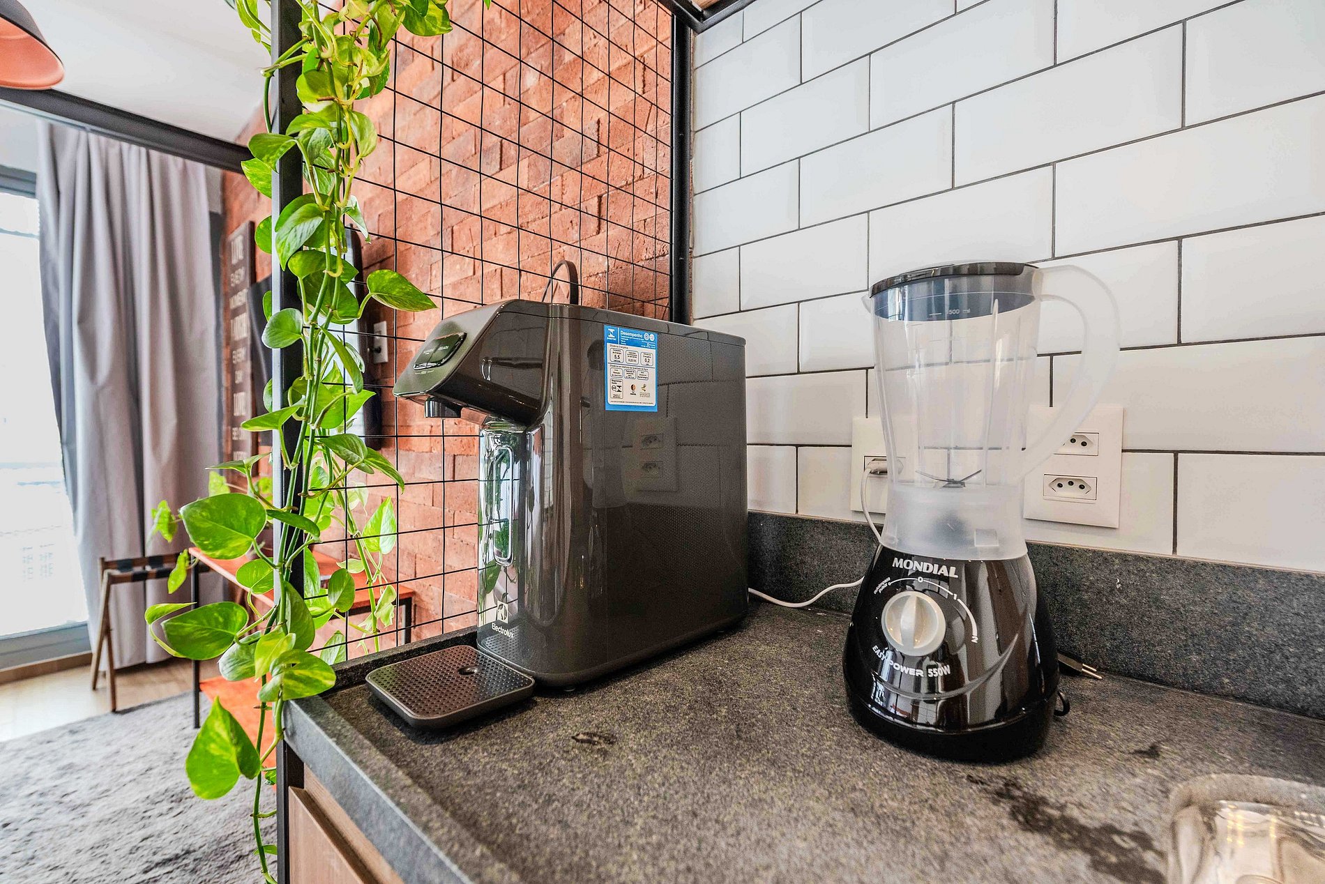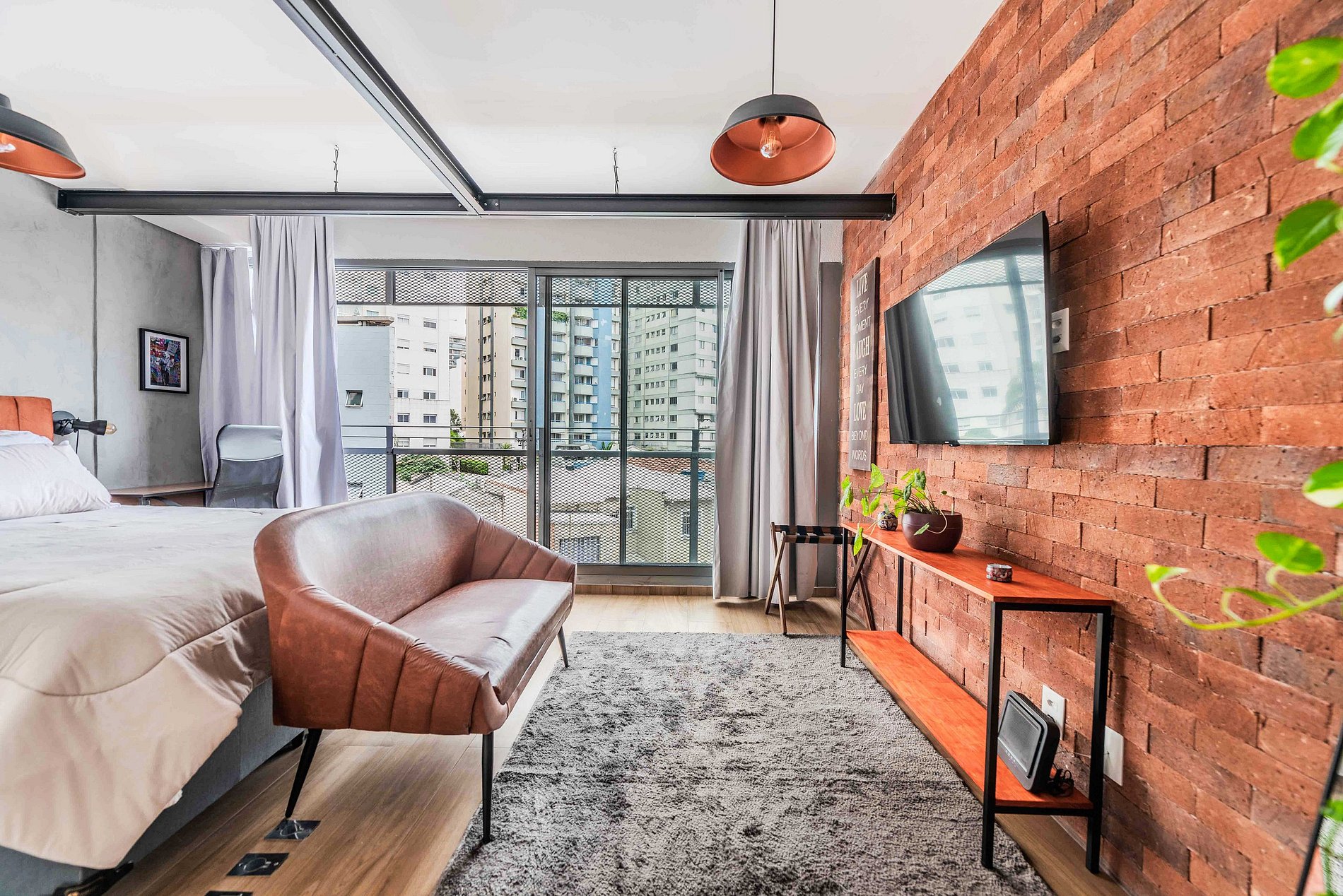 Moderno studio com design industrial e varanda com vista para Pinheiros e Vila Madalena. Equipado com cama queen, cozinha completa, Smart TV, internet rápida e ar-condicionado central.