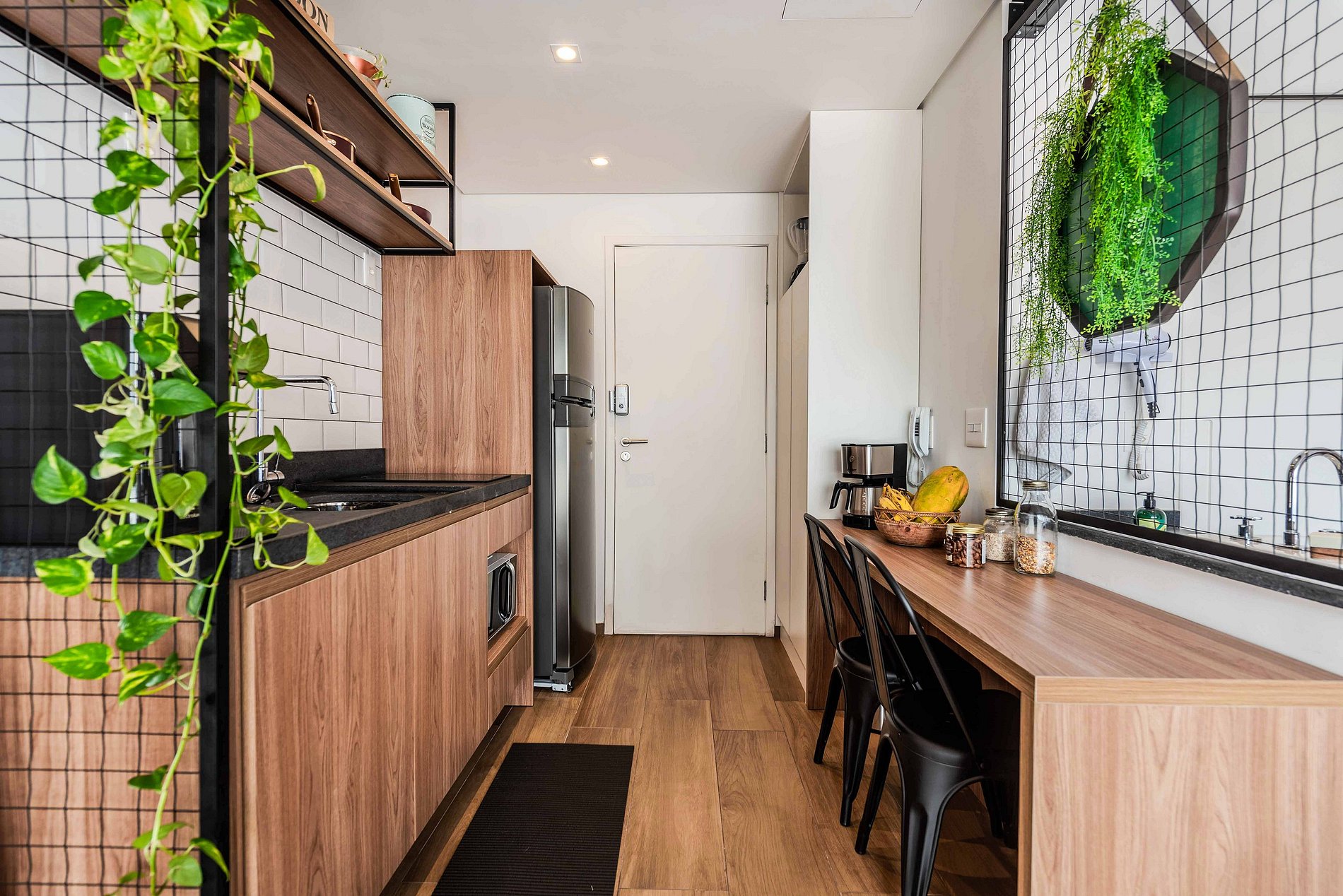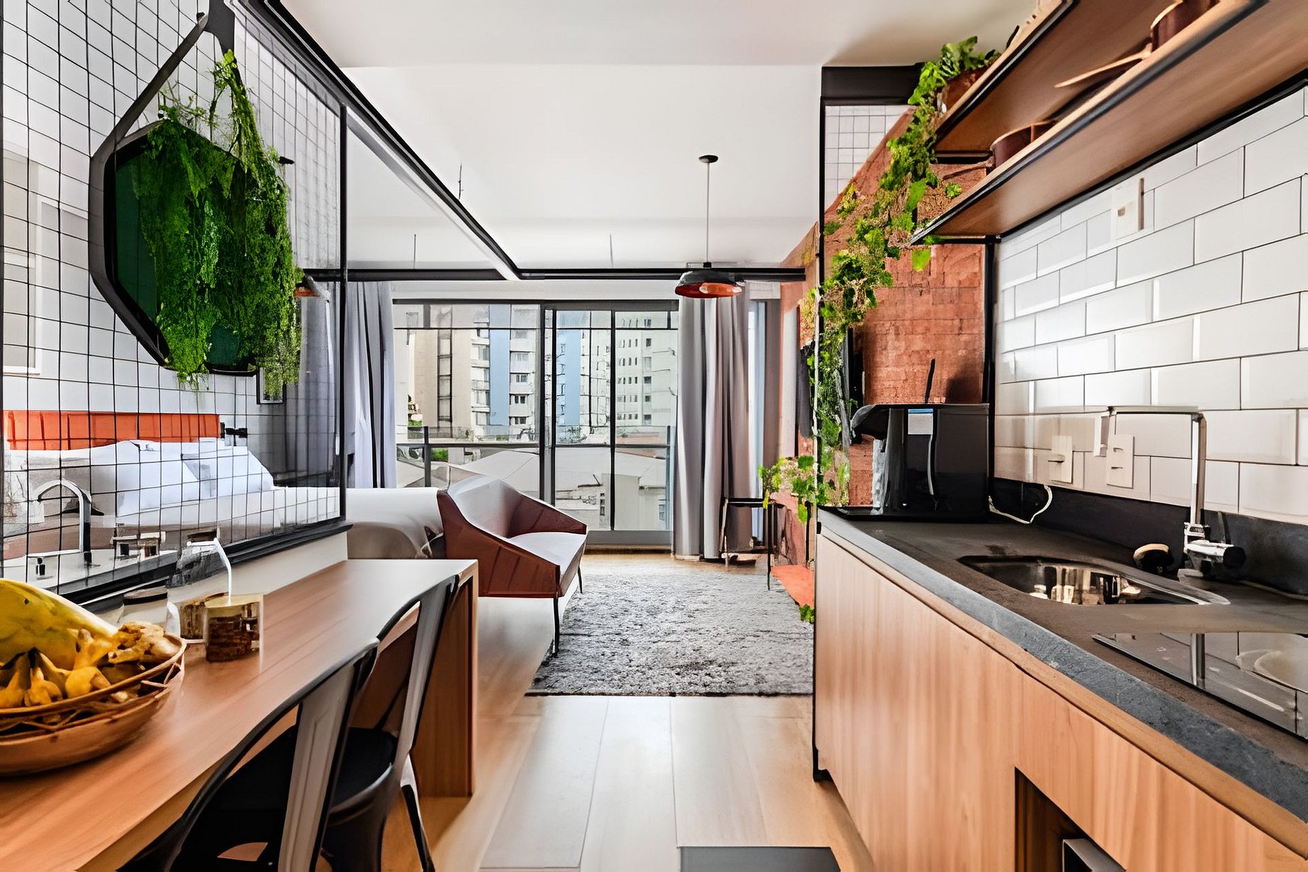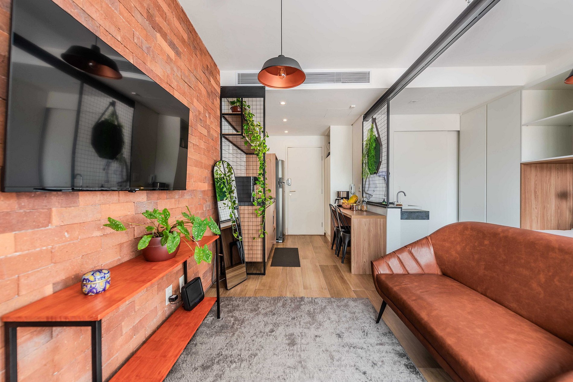 Moderno studio com design industrial e varanda com vista para Pinheiros e Vila Madalena. Equipado com cama queen, cozinha completa, Smart TV, internet rápida e ar-condicionado central.