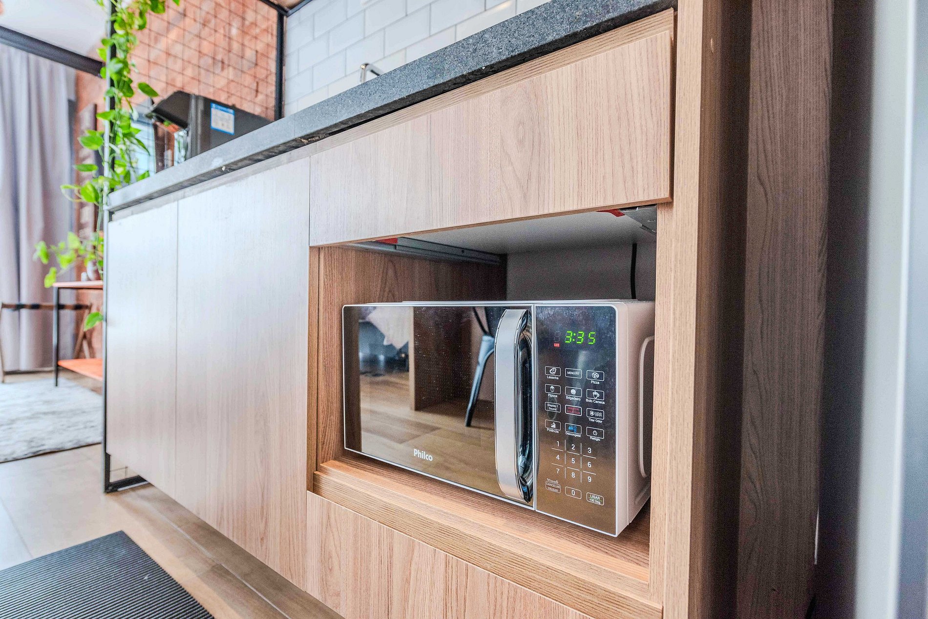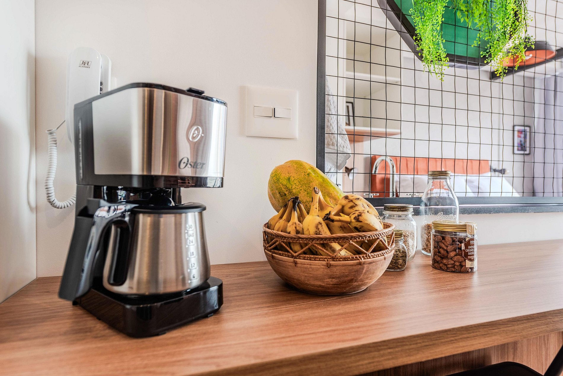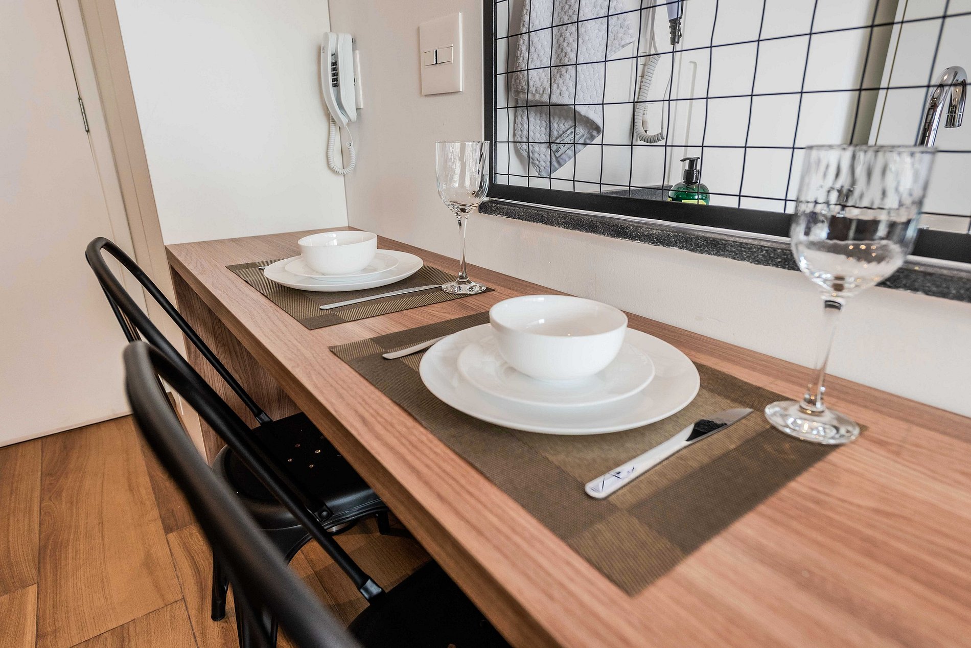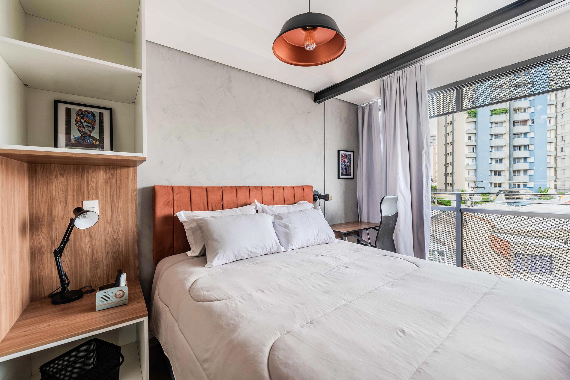 O studio combina design industrial com conforto e funcionalidade. Conta com cama queen size, Smart TV, internet de alta velocidade, sofá, mesa de trabalho e cozinha completa com cooktop de indução, geladeira inox, micro-ondas e utensílios essenciais. Ar-condicionado central, cortinas blackout. A varanda privativa oferece vista para a região de Pinheiros e Vila Madalena. O POP Grafite tem arquitetura assinada pela Triptyque e oferece piscina e academia na cobertura com vista panorâmica. No térreo, o coworking é ideal para trabalho e networking.