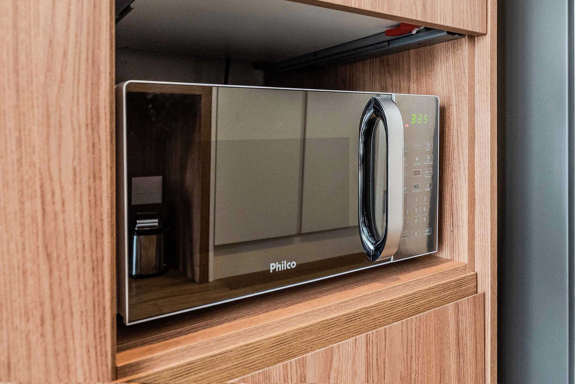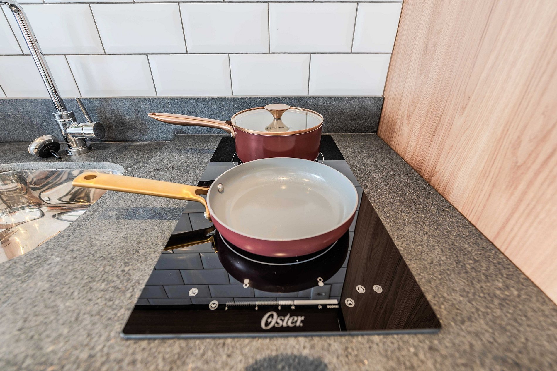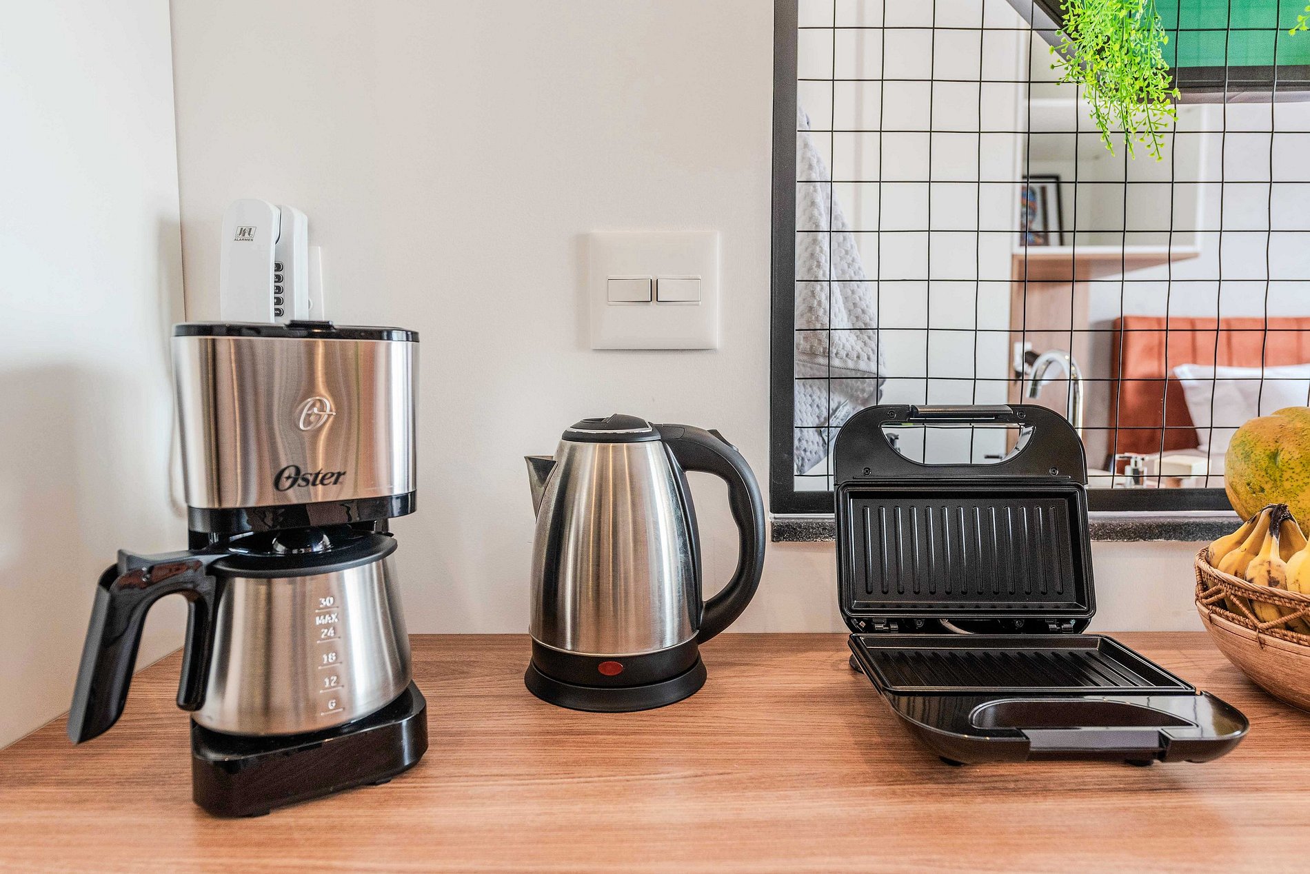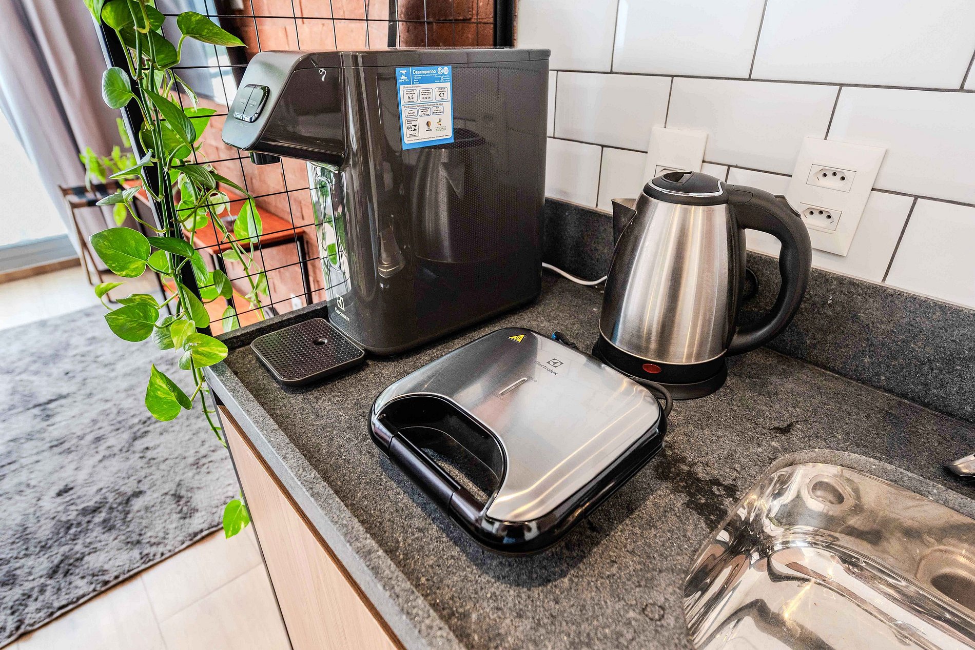 O studio combina design industrial com conforto e funcionalidade. Conta com cama queen size, Smart TV, internet de alta velocidade, sofá, mesa de trabalho e cozinha completa com cooktop de indução, geladeira inox, micro-ondas e utensílios essenciais. Ar-condicionado central, cortinas blackout. A varanda privativa oferece vista para a região de Pinheiros e Vila Madalena. O POP Grafite tem arquitetura assinada pela Triptyque e oferece piscina e academia na cobertura com vista panorâmica. No térreo, o coworking é ideal para trabalho e networking.