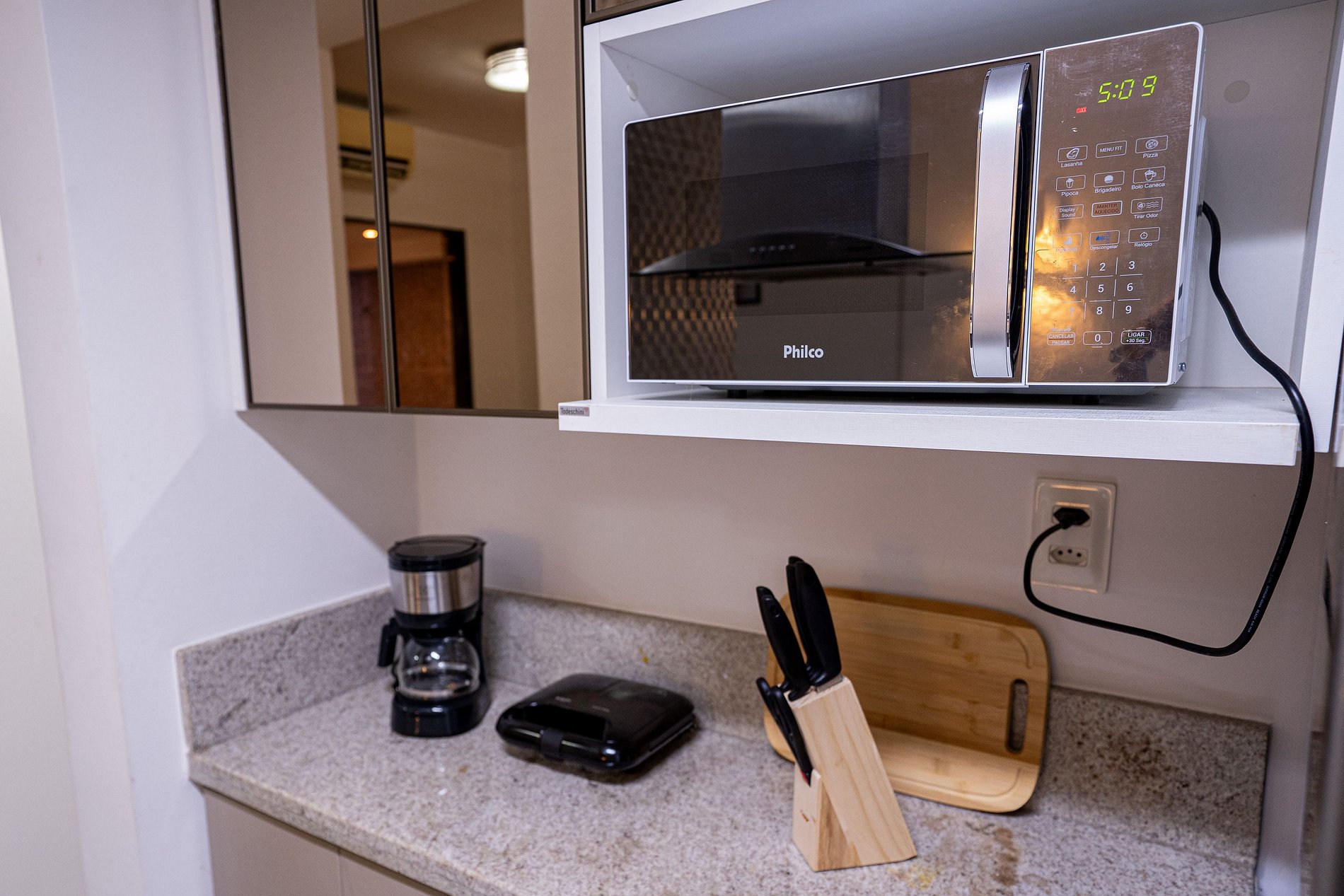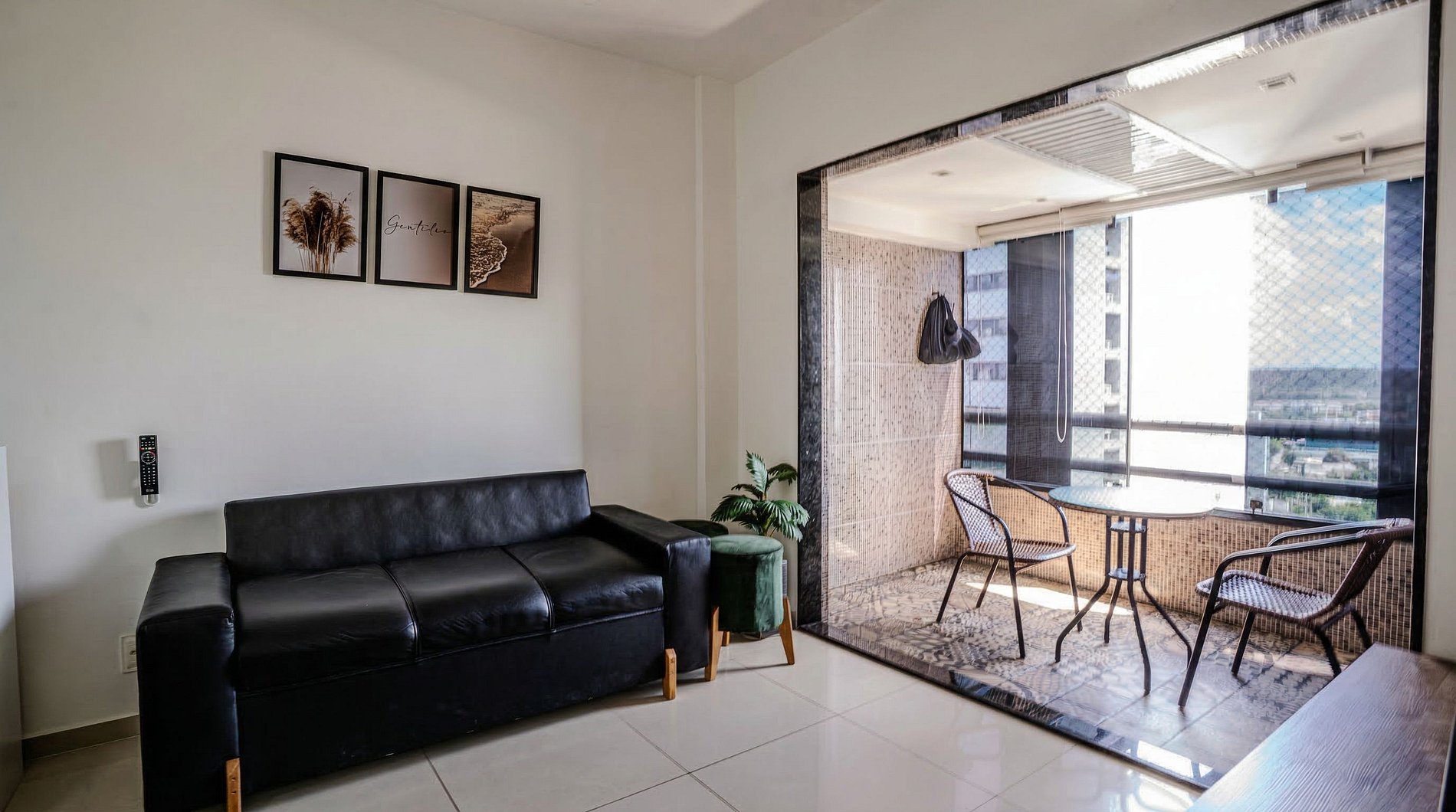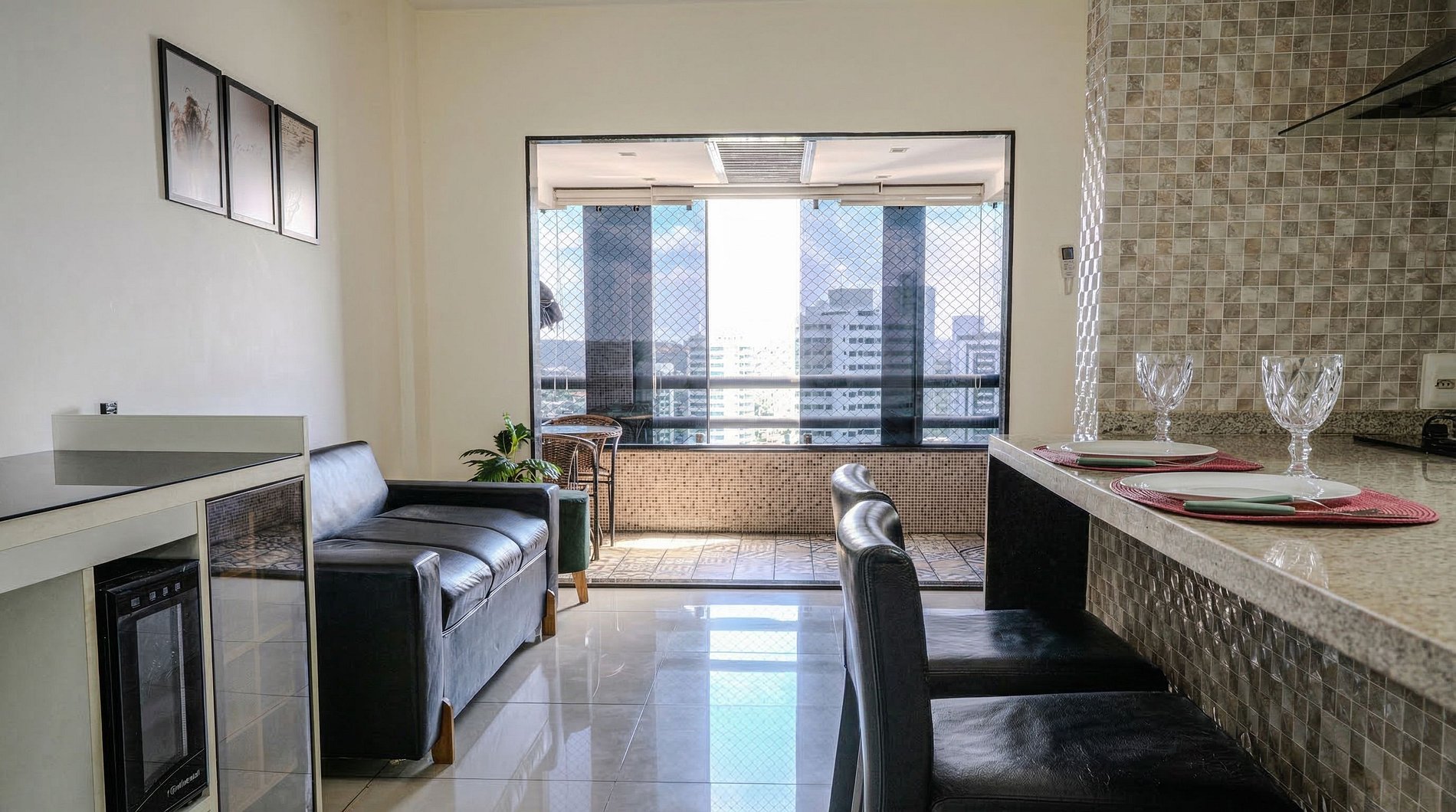 O apartamento foi pensado para proporcionar praticidade e aconchego. A sala integra uma varanda envidraçada com vista urbana, além de um sofá confortável ,TV e ventilador de teto.. A cozinha americana tem bancada com duas banquetas e está equipada com geladeira duplex, micro-ondas, forno, fogão, cafeteira, sanduicheira e todos os utensílios para cozinhar. A suíte principal possui cama king-size com cabeceira de madeira, ar-condicionado e banheiro completo. O segundo quarto tem duas camas de solteiro e mesa de apoio, ideal também para quem viaja a trabalho. Há ainda um segundo banheiro e internet de alta velocidade. O apartamento acomoda confortavelmente até 4 adultos.
