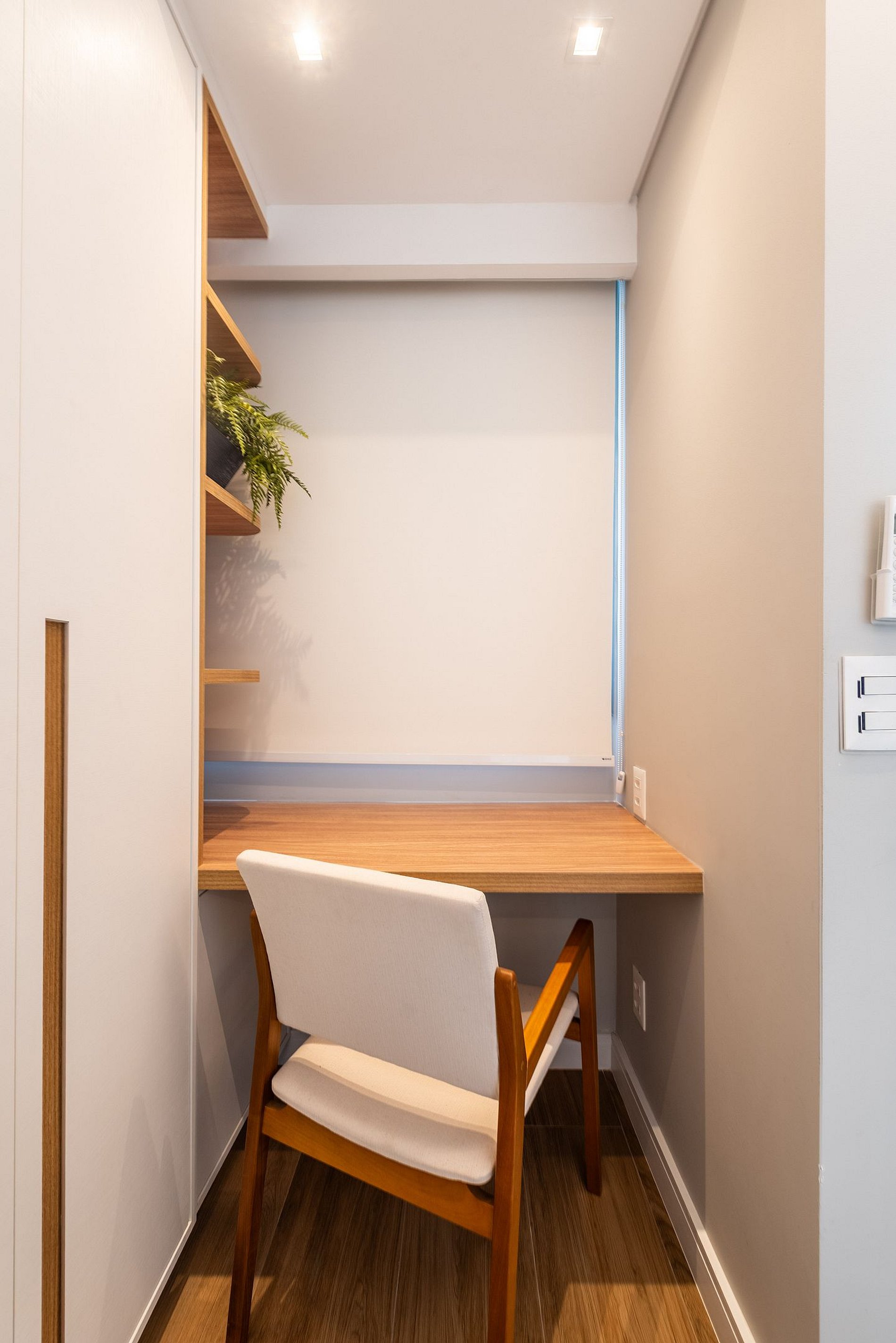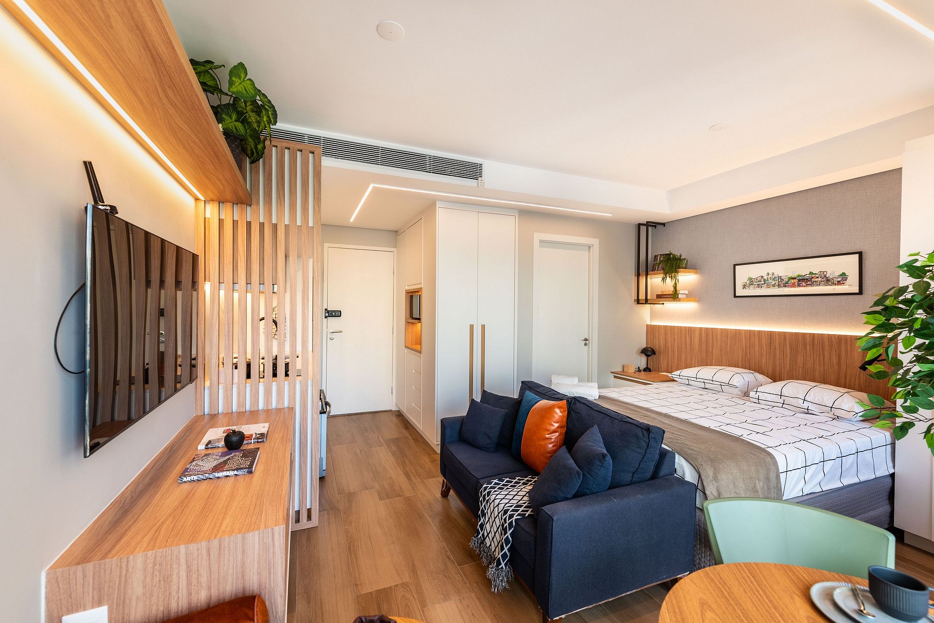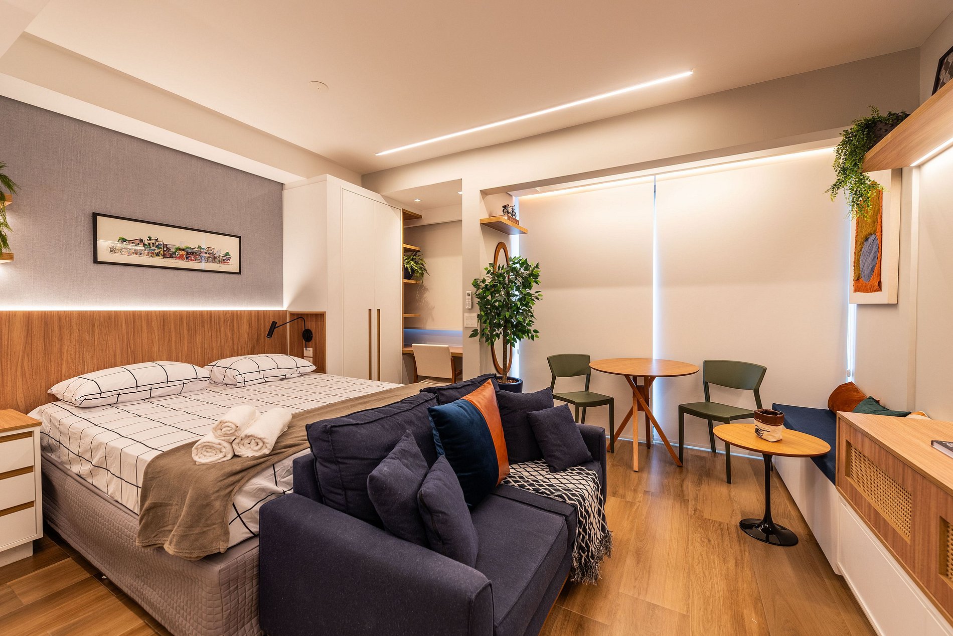 Há uma mesa de jantar com vista para a cidade, um sofá confortável para relaxar assistindo à Smart TV, e uma estação de trabalho ideal para home office. Cortinas blackout, ar-condicionado central e internet de alta velocidade garantem conforto absoluto. A fechadura eletrônica traz praticidade e segurança.