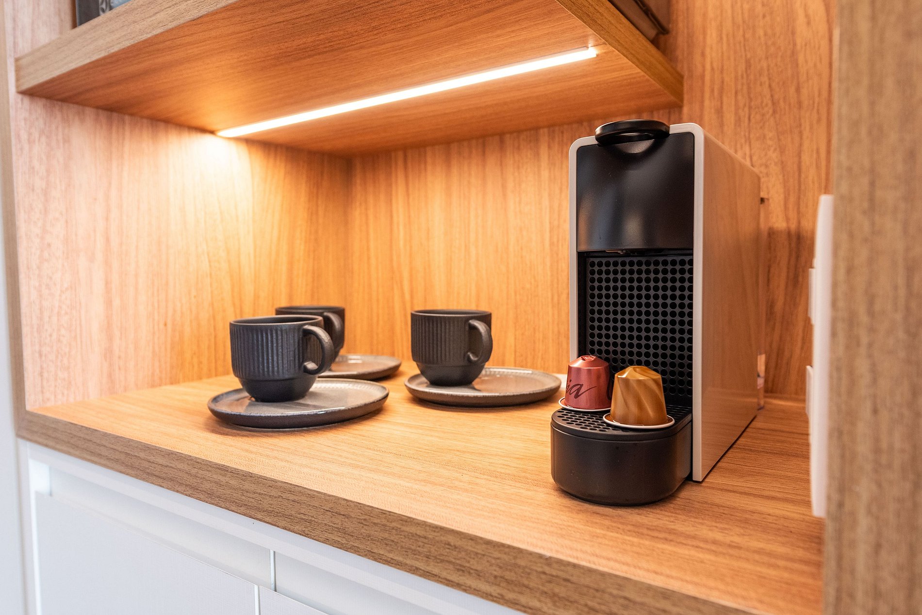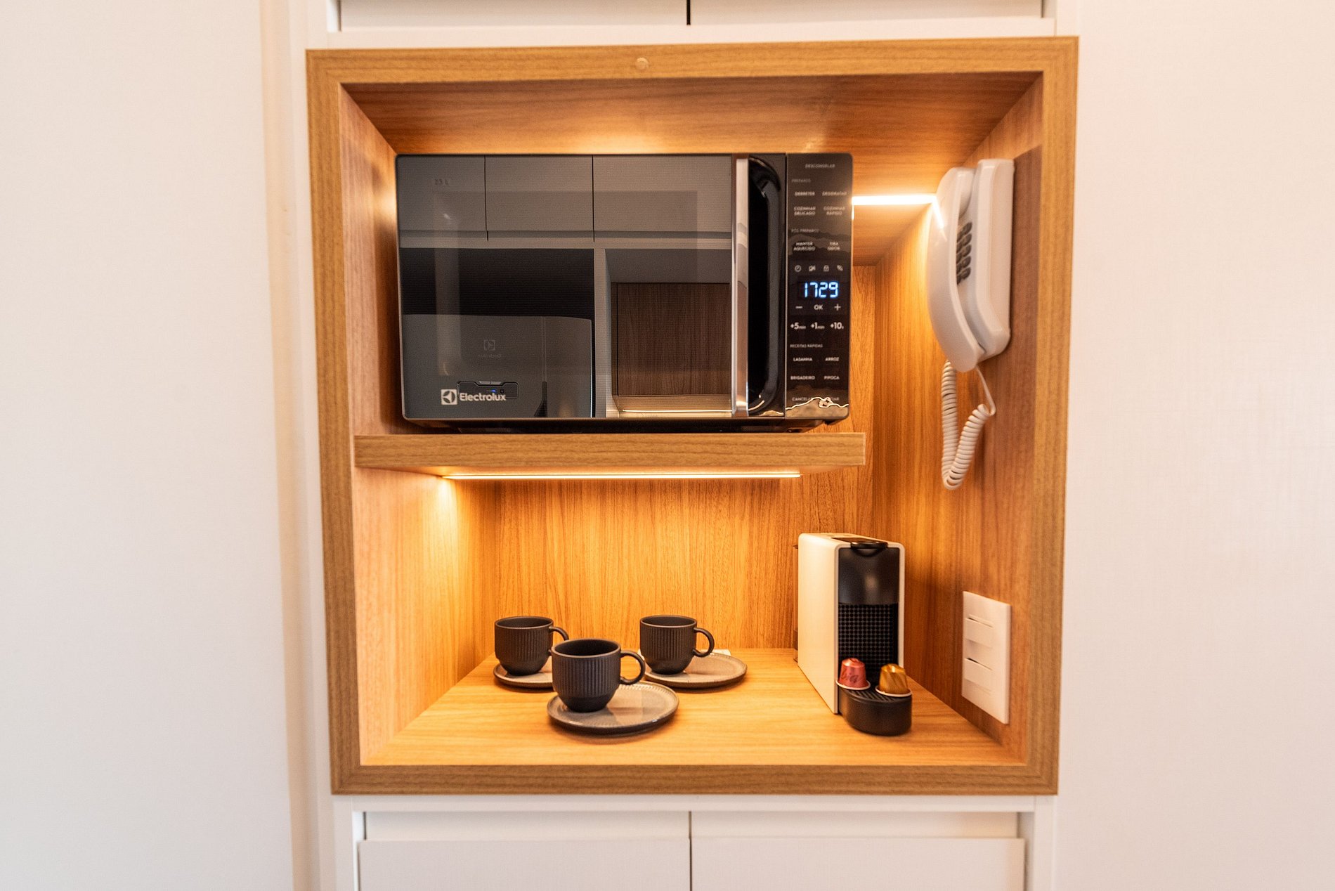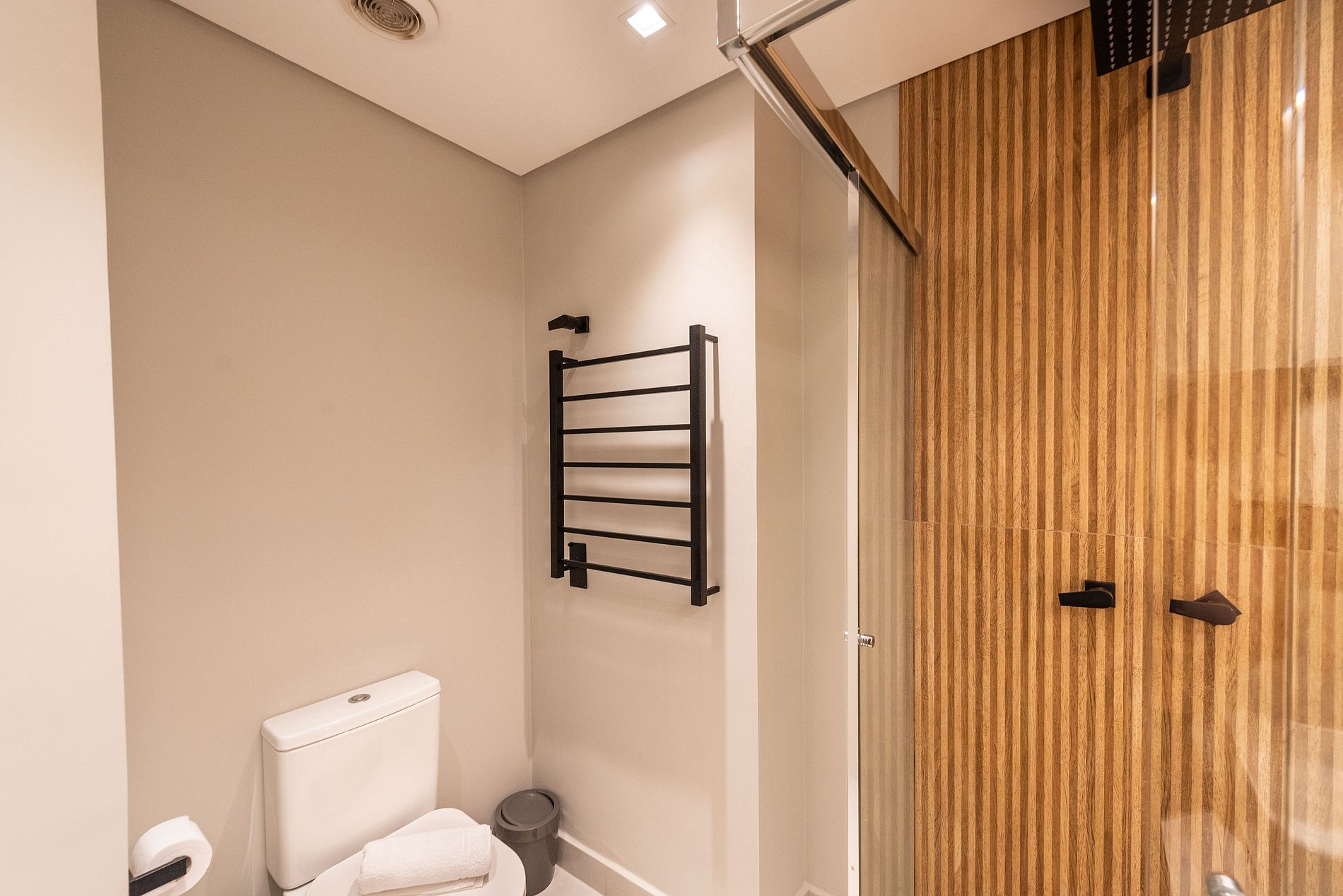 Este studio recém-reformado combina conforto e design contemporâneo com acabamentos de altíssimo padrão. O ambiente é iluminado naturalmente e conta com projeto luminotécnico acolhedor e moderno, além de decoração boho elegante. A cama queen possui enxoval premium e o banheiro oferece toalheiro elétrico, secador, box de vidro espaçoso e amenities Dove e Pantene. A cozinha é completa com eletros modernos (lava-louças, micro-ondas, forno, cooktop, torradeira, liquidificador, cafeteira Nespresso e elétrica) e todos os utensílios para cozinhar.